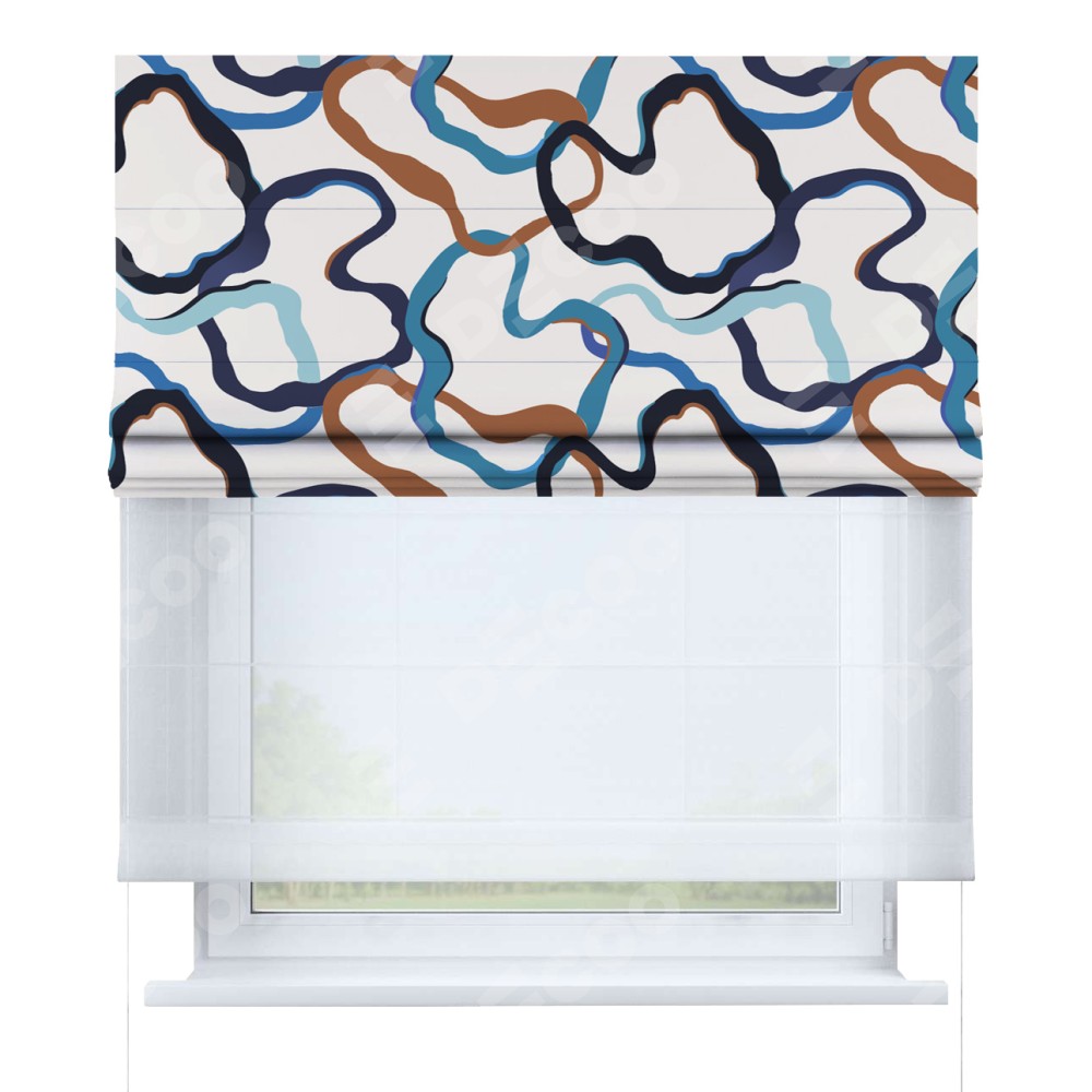 Римская штора день-ночь производителя «Cortin», используется для проёма, пошита из двух полотен, с лицевой блэкаут с нанесением сублимационной печати «Волнистые ленты», вторая ткань тюль (по стандарту комплектуется тюль белого цвета артикул V-01). Имеет универсальный механизм и подходит для монтажа: на потолок, на стену и в нишу.