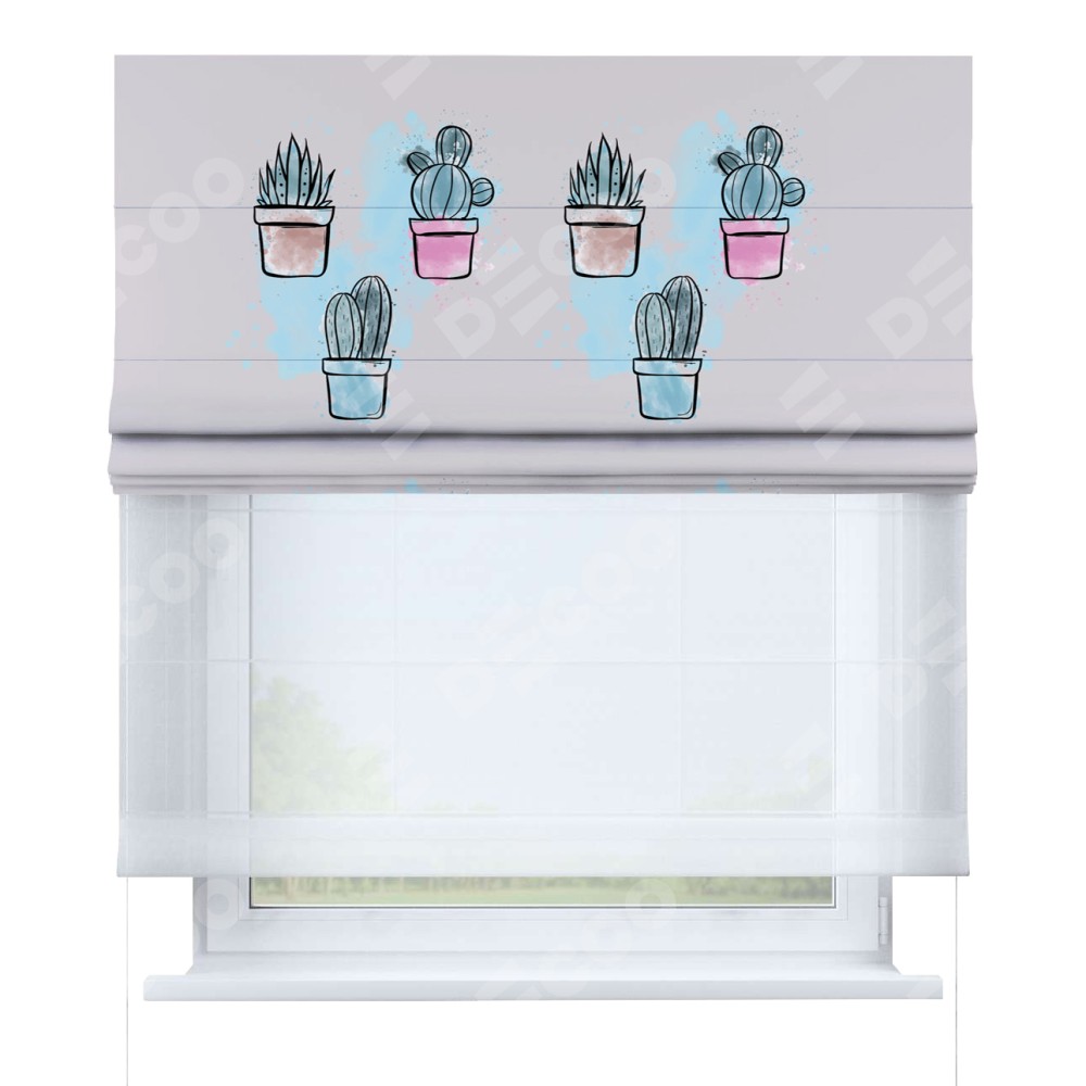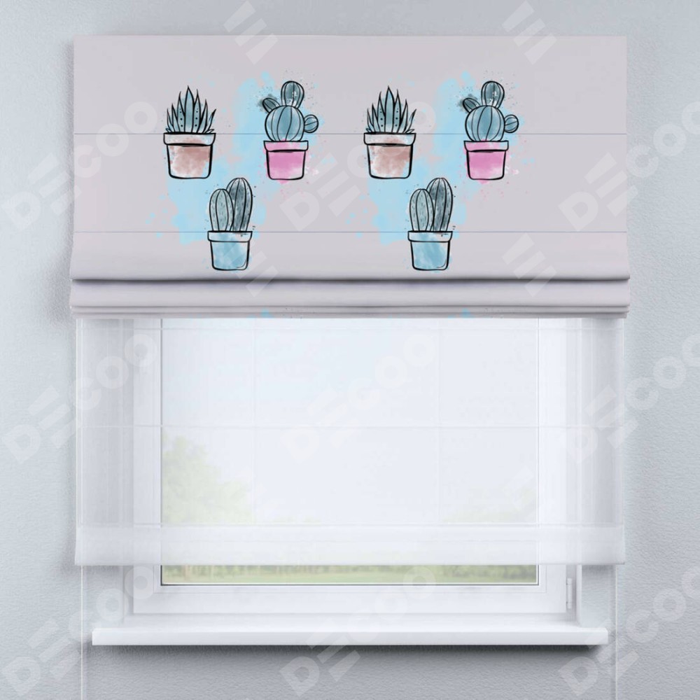 Римская штора день-ночь производителя «Cortin», используется для проёма, пошита из двух полотен, с лицевой блэкаут с нанесением сублимационной печати «Кактусовая оранжерея», вторая ткань тюль (по стандарту комплектуется тюль белого цвета артикул V-01). Имеет универсальный механизм и подходит для монтажа: на потолок, на стену и в нишу.