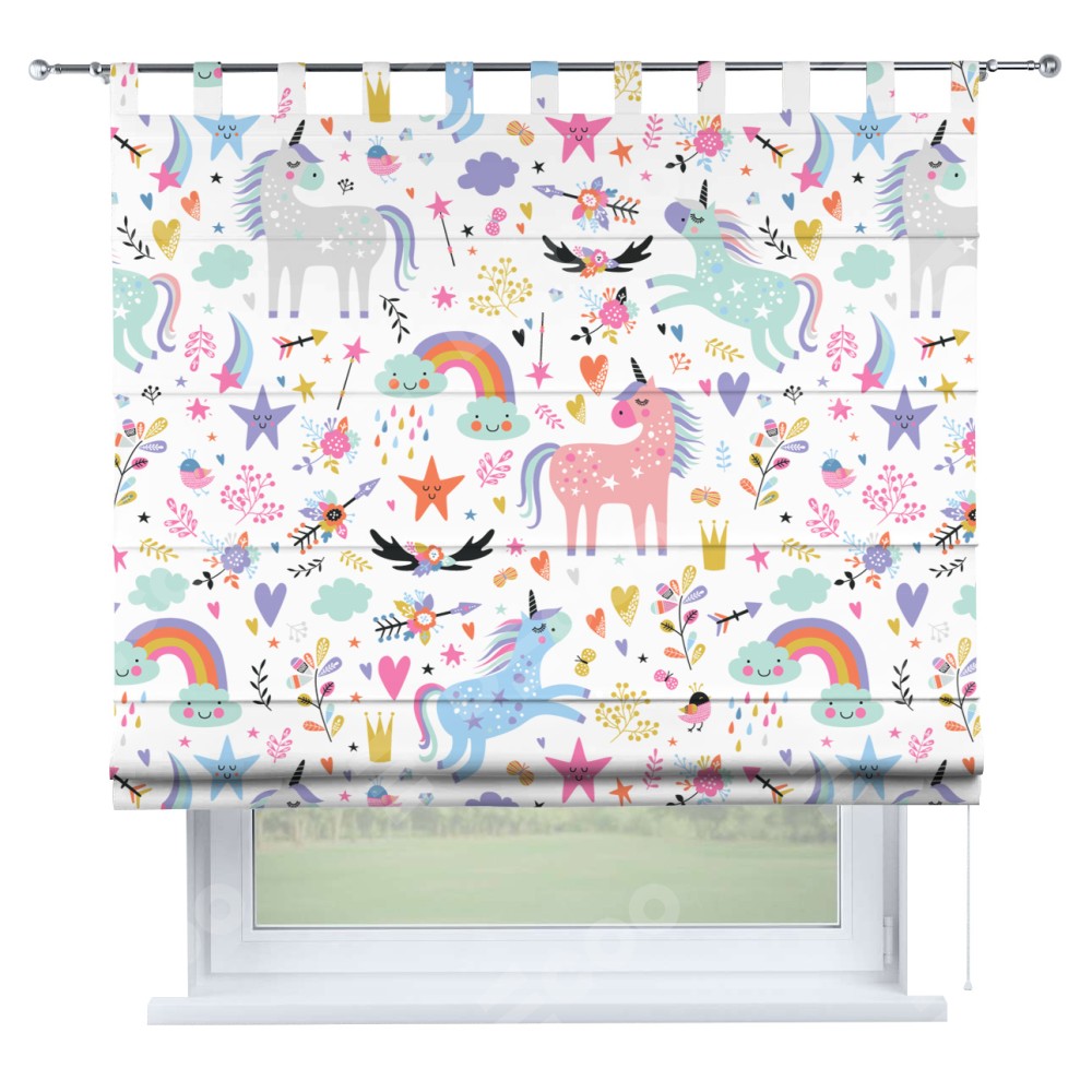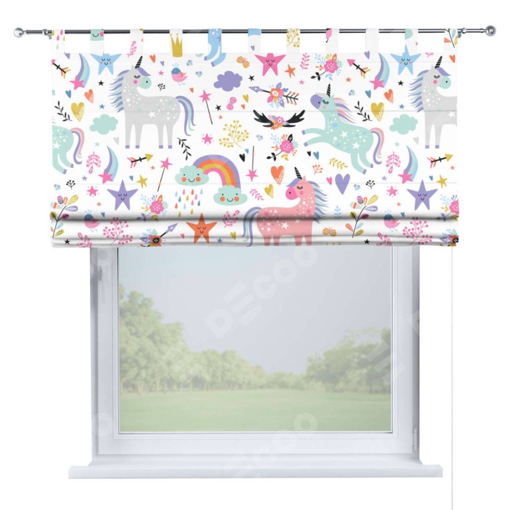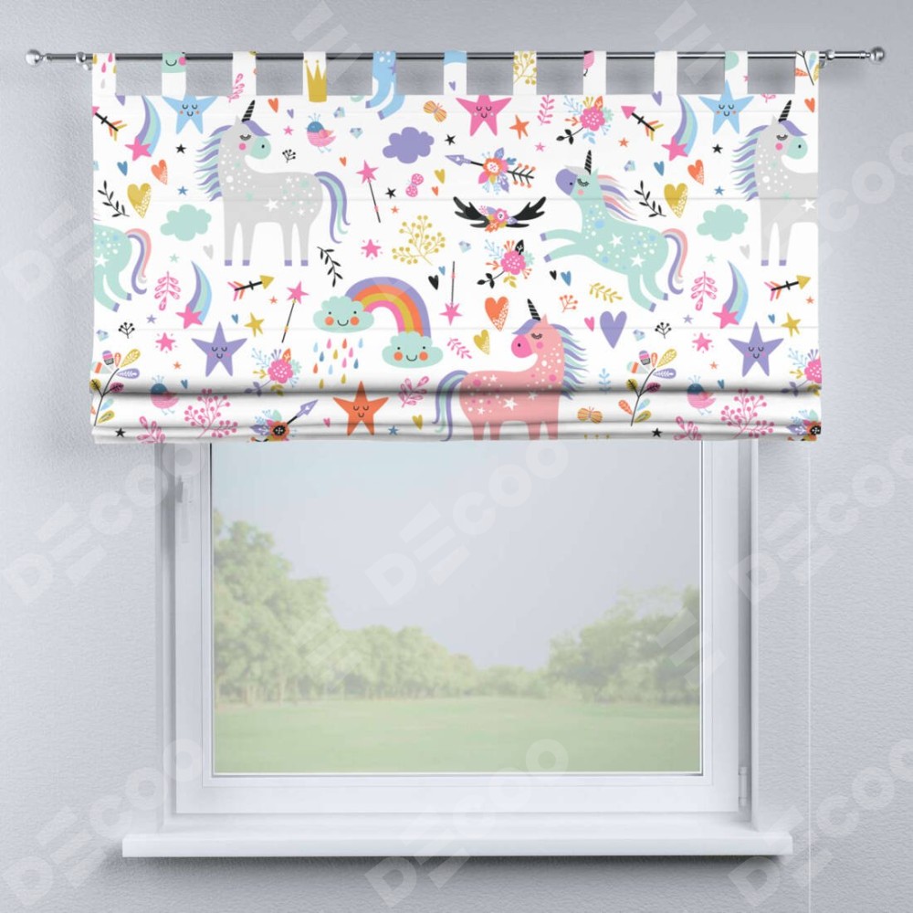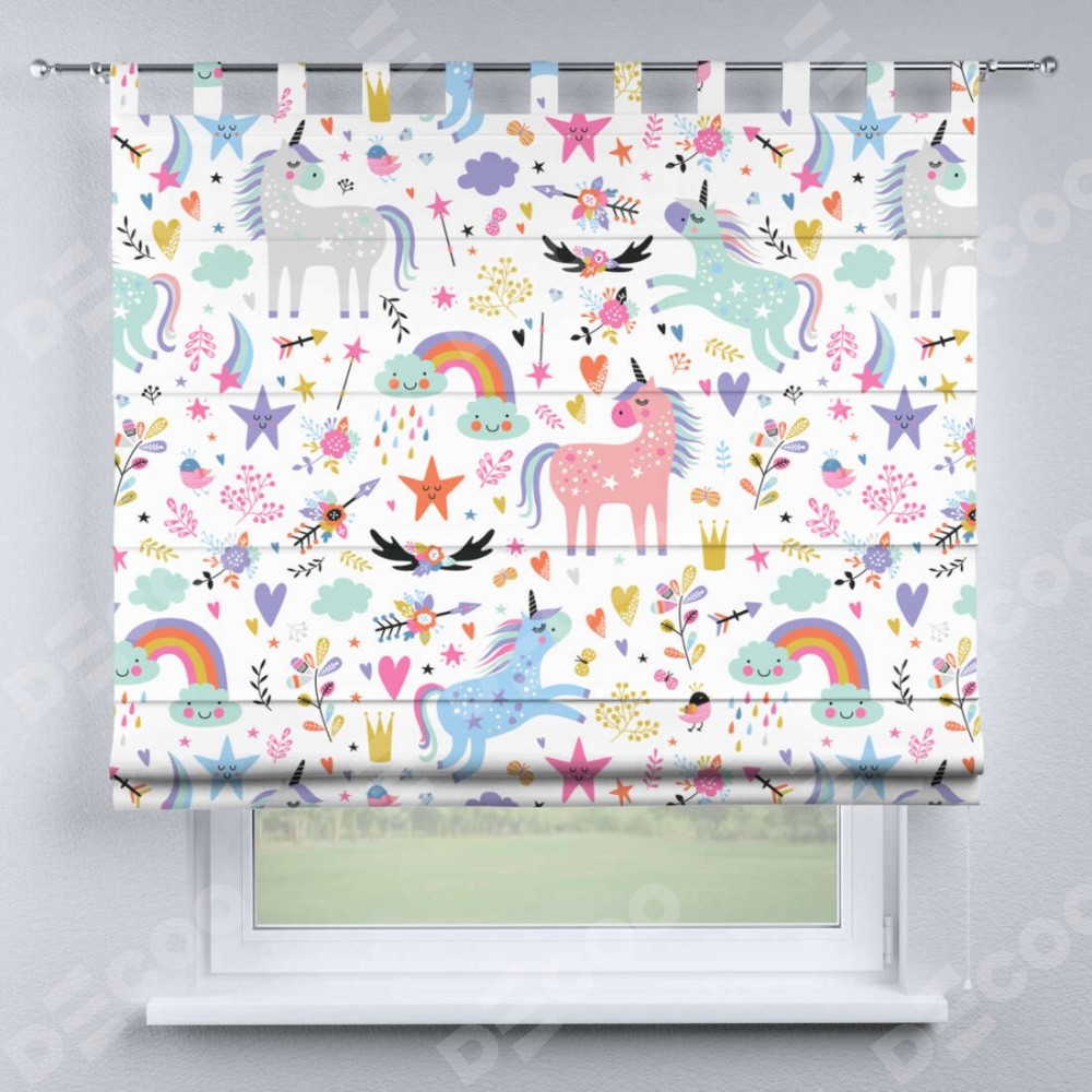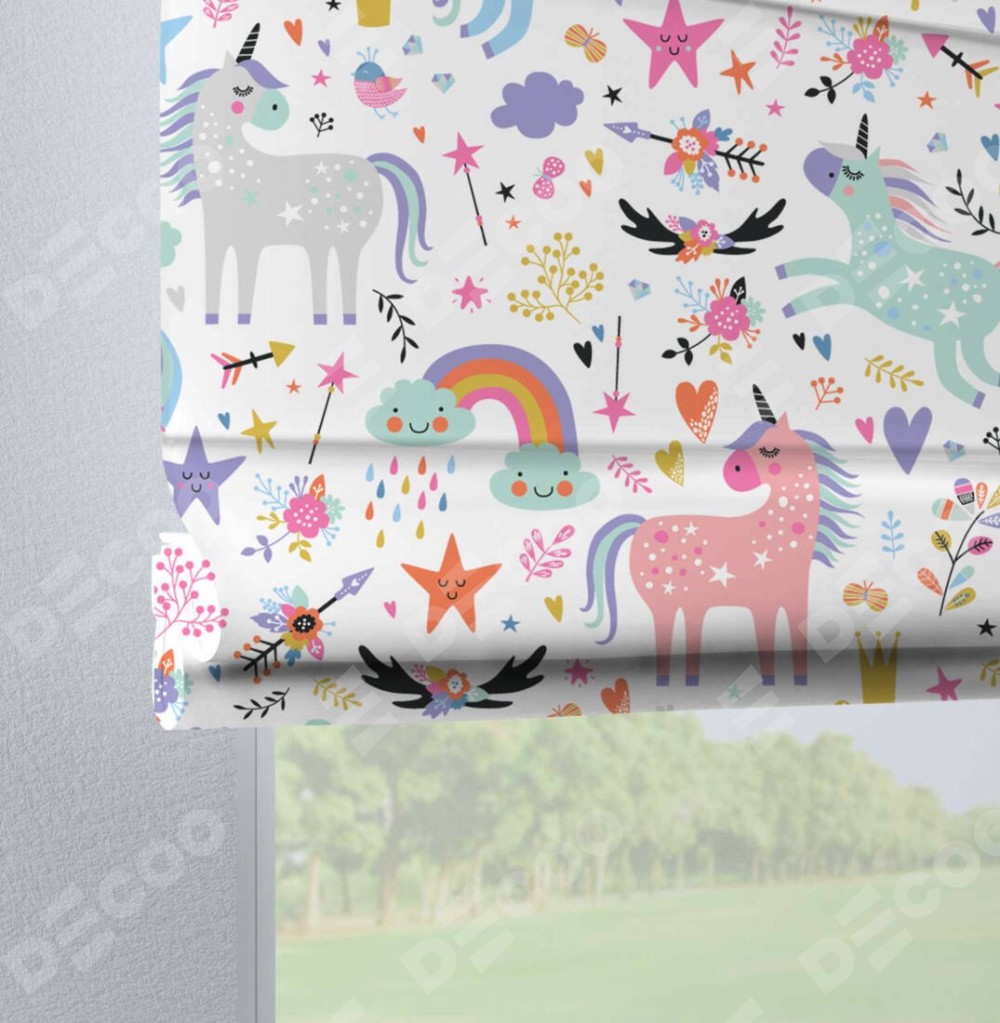 Римская штора производителя «Cortin», используется для проёма, пошита из ткани блэкаут с нанесением сублимационной печати «Радужные единороги». Данная модель пошита на петлях, комплектуется на выбор круглым карнизом и подходит для монтажа на стену. Римская штора на петлях имеет простую систему регулировки высоты, отличительным преимуществом данной модели является простой способ монтажа. Достаточно повесить ее на трубу и штора готова!
