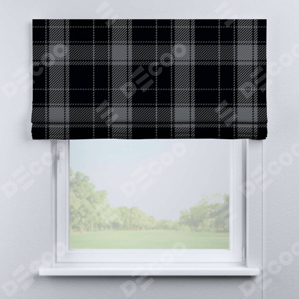 Римская штора производителя «Cortin», используется для проёма, пошита из ткани блэкаут с нанесением сублимационной печати «Стильная клетка». Имеет универсальный механизм и подходит для монтажа: на потолок, на стену и в нишу.