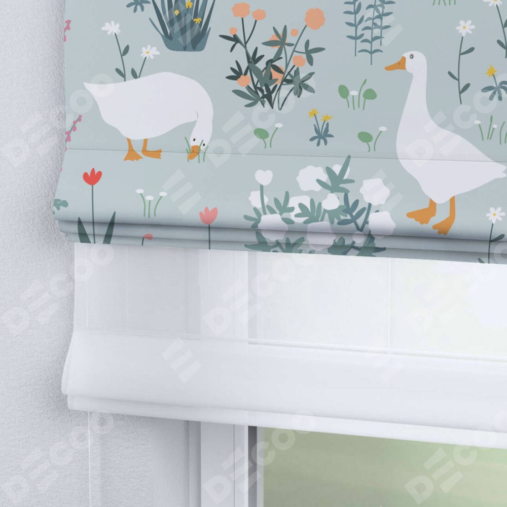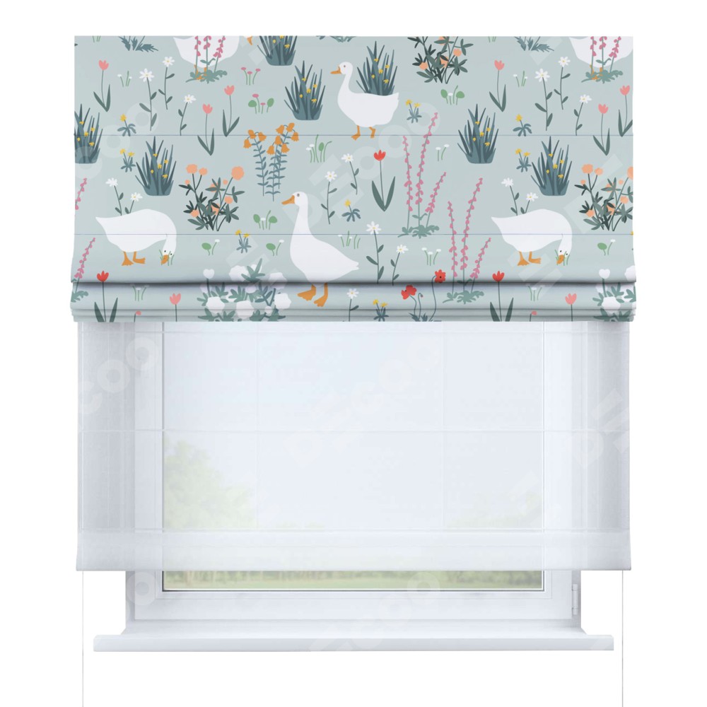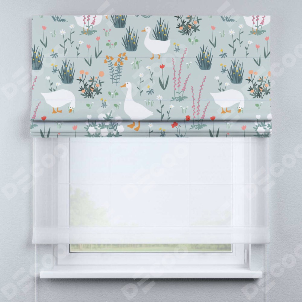 Римская штора день-ночь производителя «Cortin», используется для проёма, пошита из двух полотен, с лицевой блэкаут с нанесением сублимационной печати «Гуси на лугу», вторая ткань тюль (по стандарту комплектуется тюль белого цвета артикул V-01). Имеет универсальный механизм и подходит для монтажа: на потолок, на стену и в нишу.