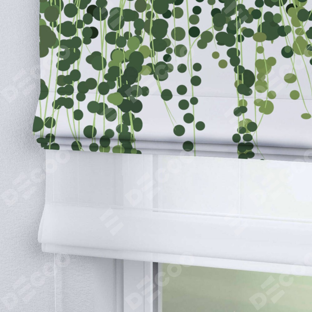 Римская штора день-ночь производителя «Cortin», используется для проёма, пошита из двух полотен, с лицевой блэкаут с нанесением сублимационной печати «Зелёный занавес», вторая ткань тюль (по стандарту комплектуется тюль белого цвета артикул V-01). Имеет универсальный механизм и подходит для монтажа: на потолок, на стену и в нишу.