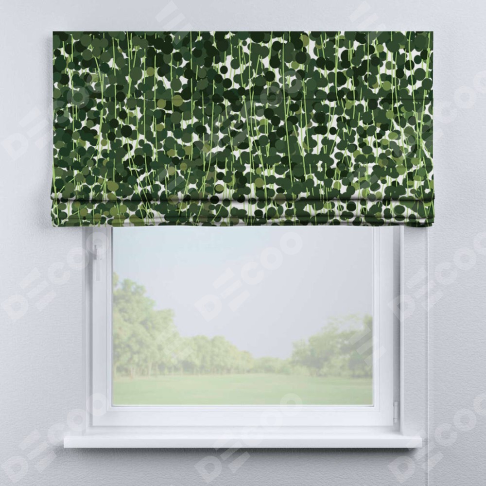Римская штора производителя «Cortin», используется для проёма, пошита из ткани блэкаут с нанесением сублимационной печати «Зелёный занавес». Имеет универсальный механизм и подходит для монтажа: на потолок, на стену и в нишу.