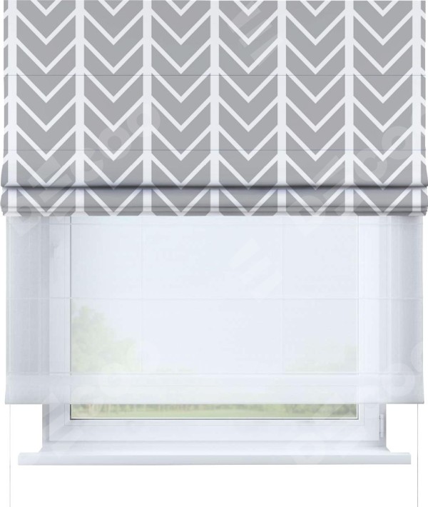 Римская штора день-ночь производителя «Cortin», используется для проёма, пошита из двух полотен, с лицевой блэкаут с нанесением сублимационной печати «Современная геометрия», вторая ткань тюль (по стандарту комплектуется тюль белого цвета артикул V-01). Имеет универсальный механизм и подходит для монтажа: на потолок, на стену и в нишу.