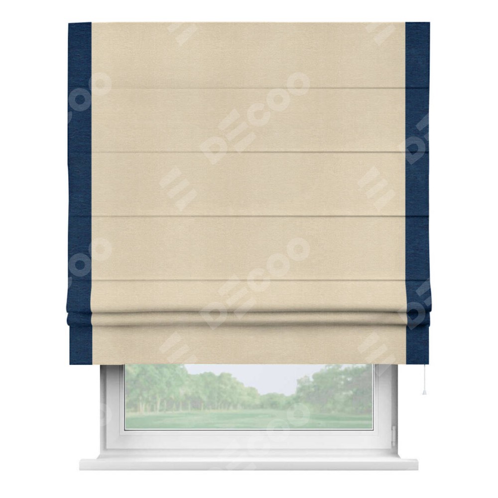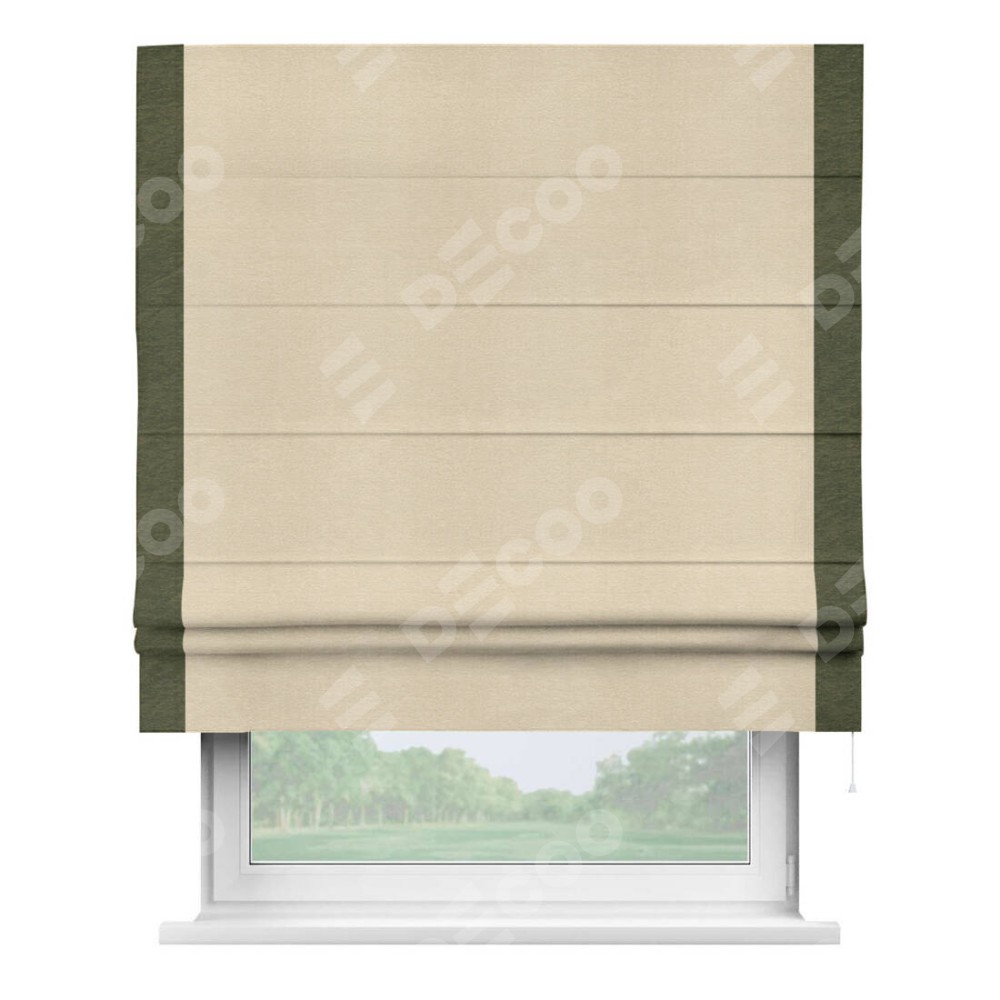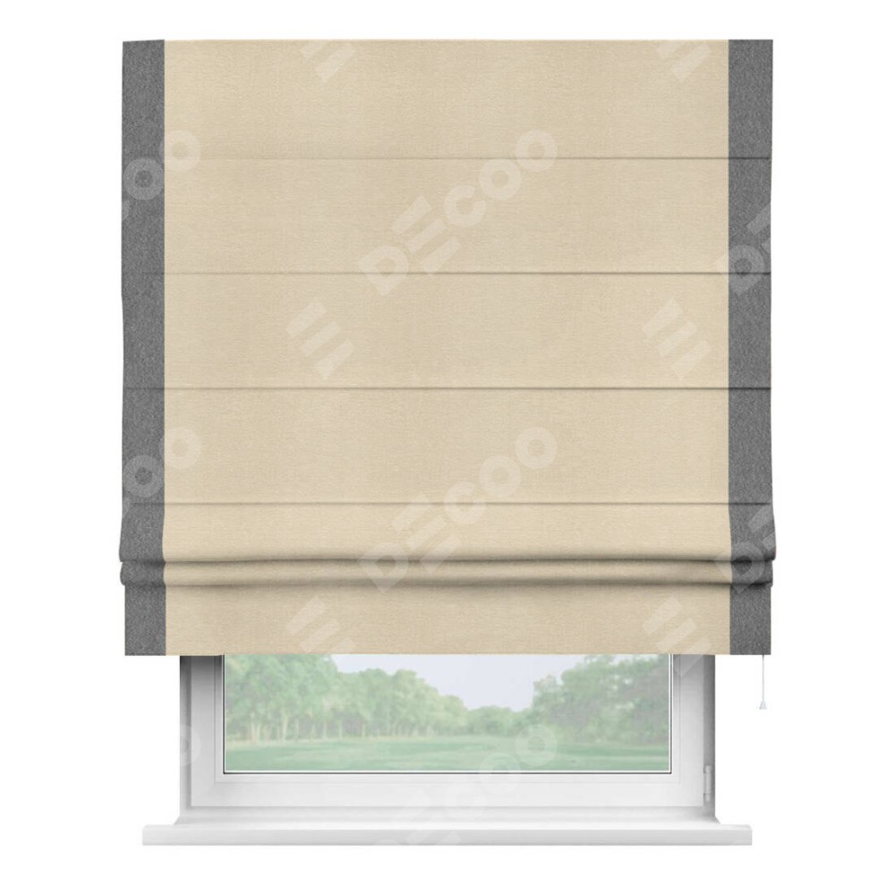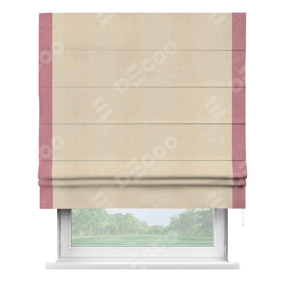 Римская штора производителя «Cortin», используется для проёма, пошита из ткани софт однотонный бежевый лайт, артикул 33100. Отделка шторы кантом «Стрим Дуо», ткань для канта используется из софта разной расцветки на выбор. Имеет универсальный механизм и подходит для монтажа: на потолок, на стену и в нишу.