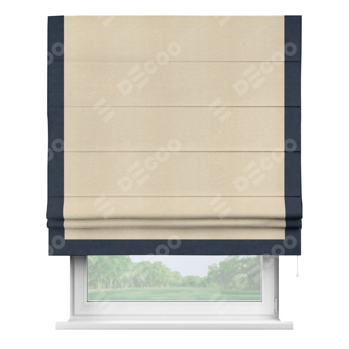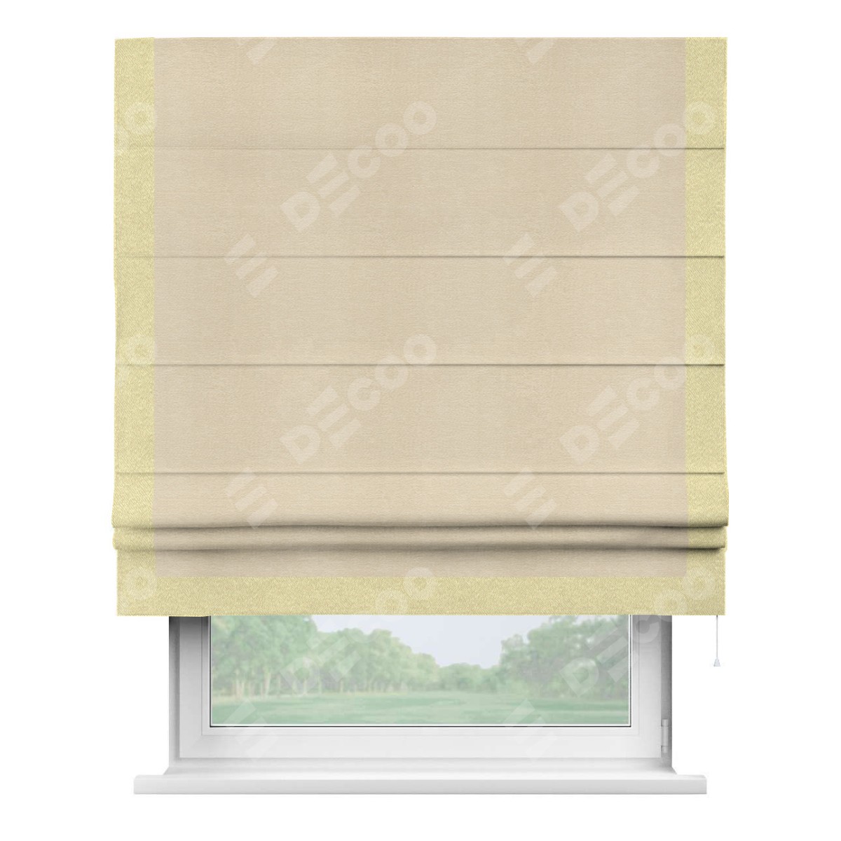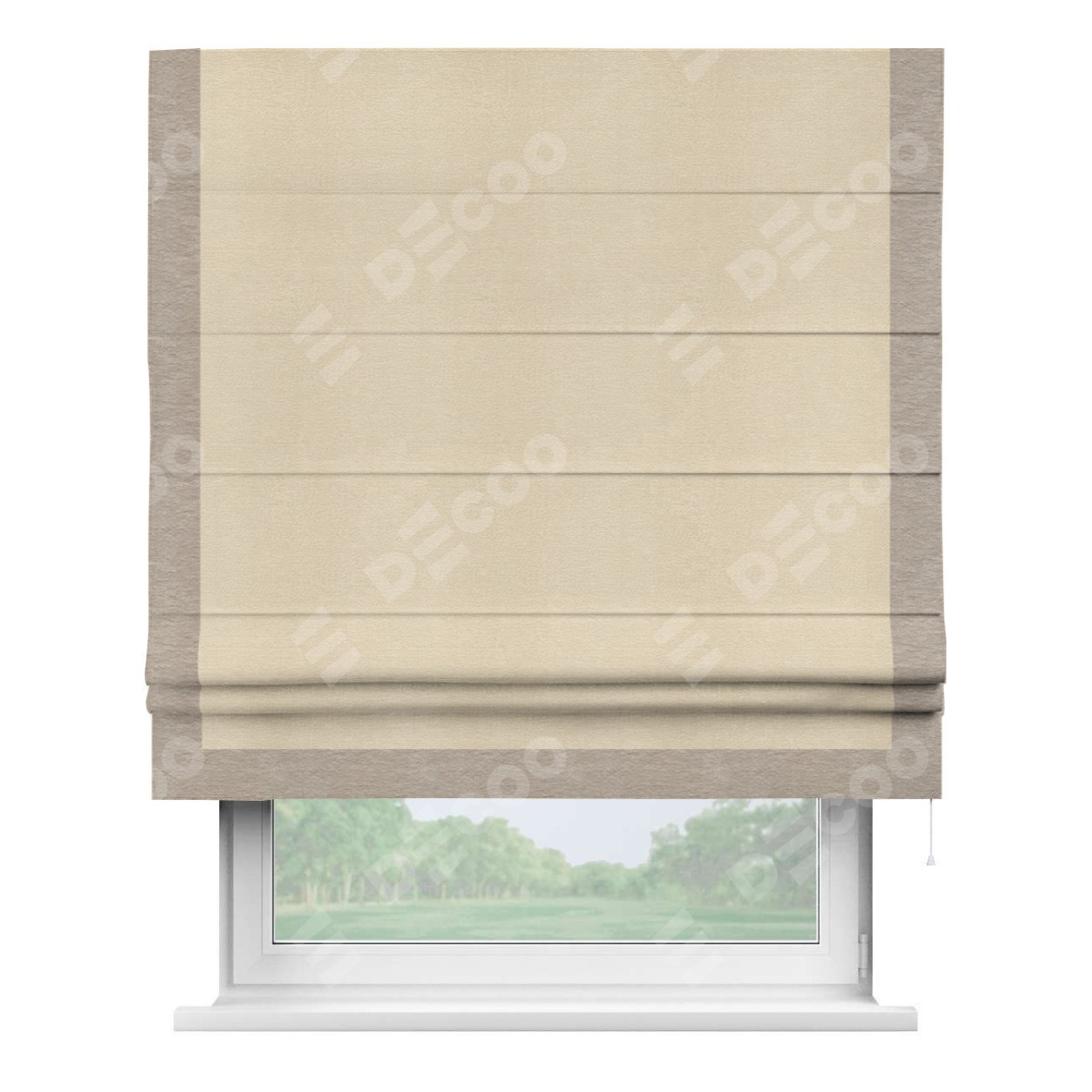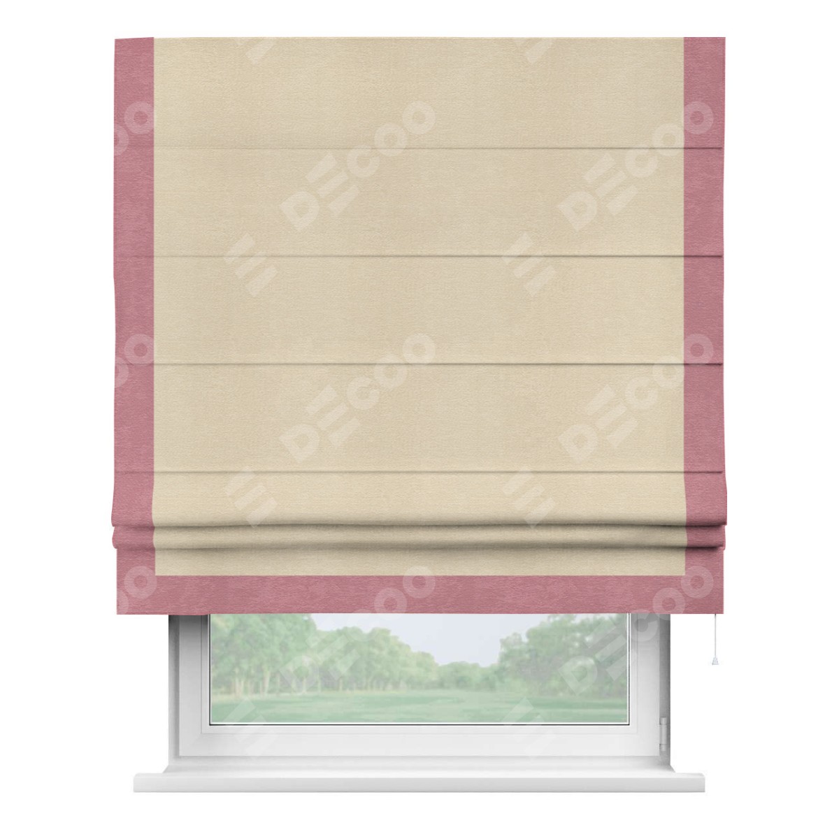 Римская штора производителя «Cortin», используется для проёма, пошита из ткани софт однотонный бежевый лайт, артикул 33100. Отделка шторы кантом «Виктория», ткань для канта используется из софта разной расцветки на выбор. Имеет универсальный механизм и подходит для монтажа: на потолок, на стену и в нишу.