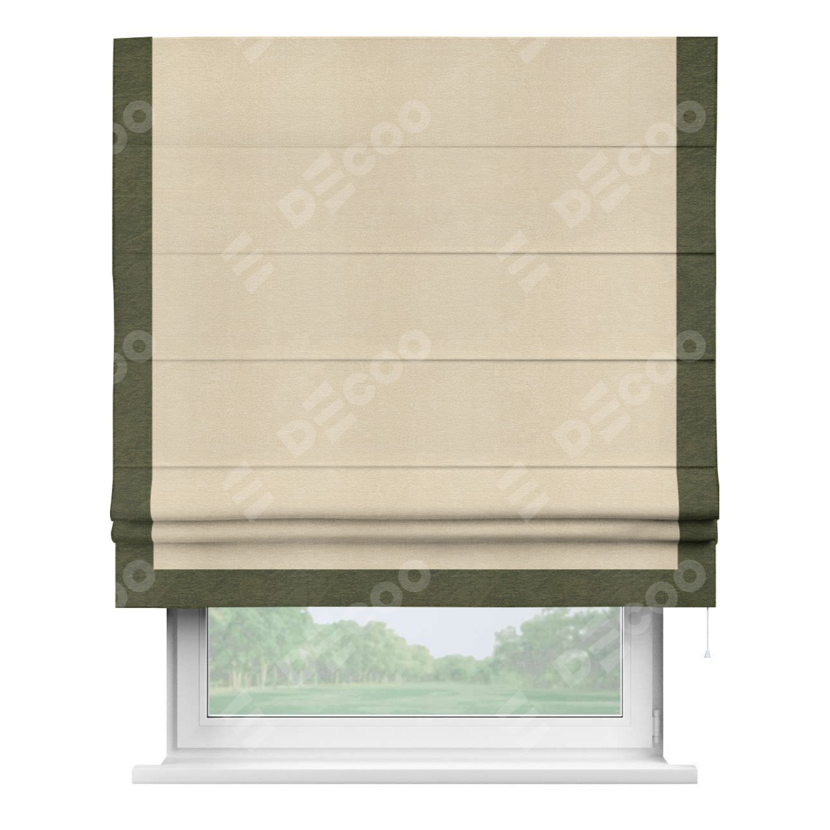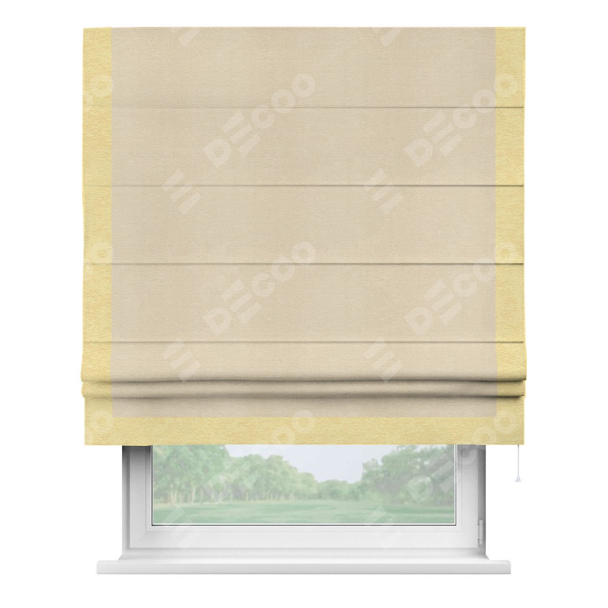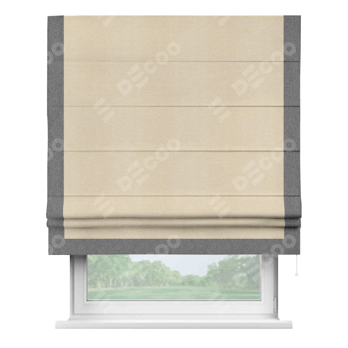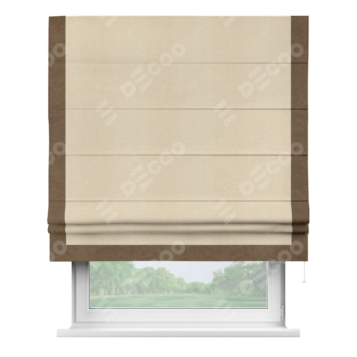 Римская штора производителя «Cortin», используется для проёма, пошита из ткани софт однотонный бежевый лайт, артикул 33100. Отделка шторы кантом «Виктория», ткань для канта используется из софта разной расцветки на выбор. Имеет универсальный механизм и подходит для монтажа: на потолок, на стену и в нишу.