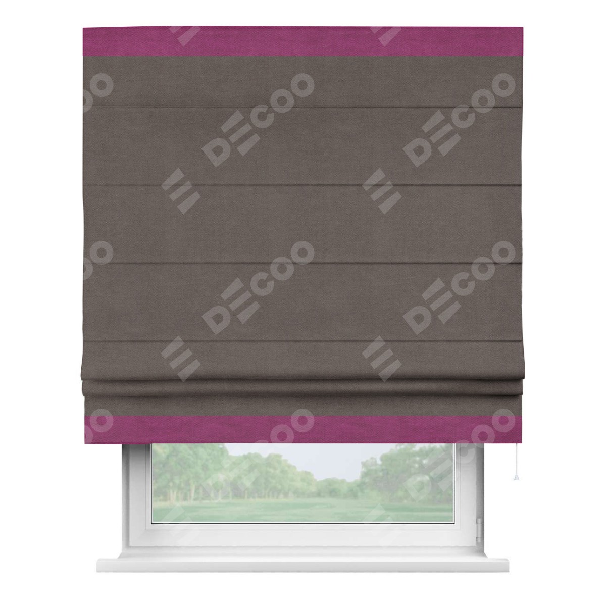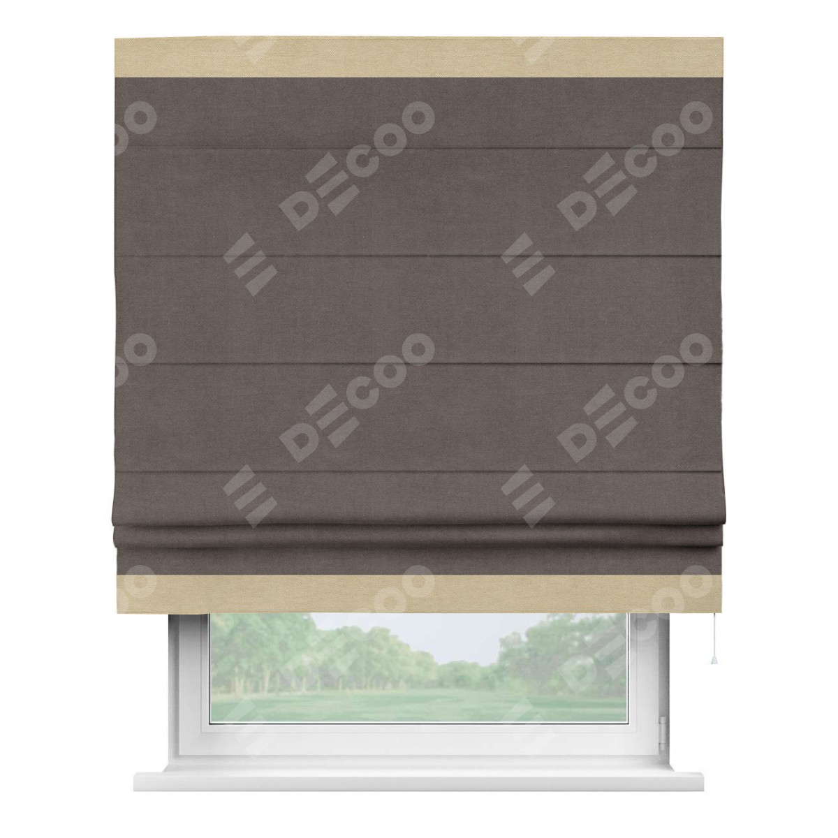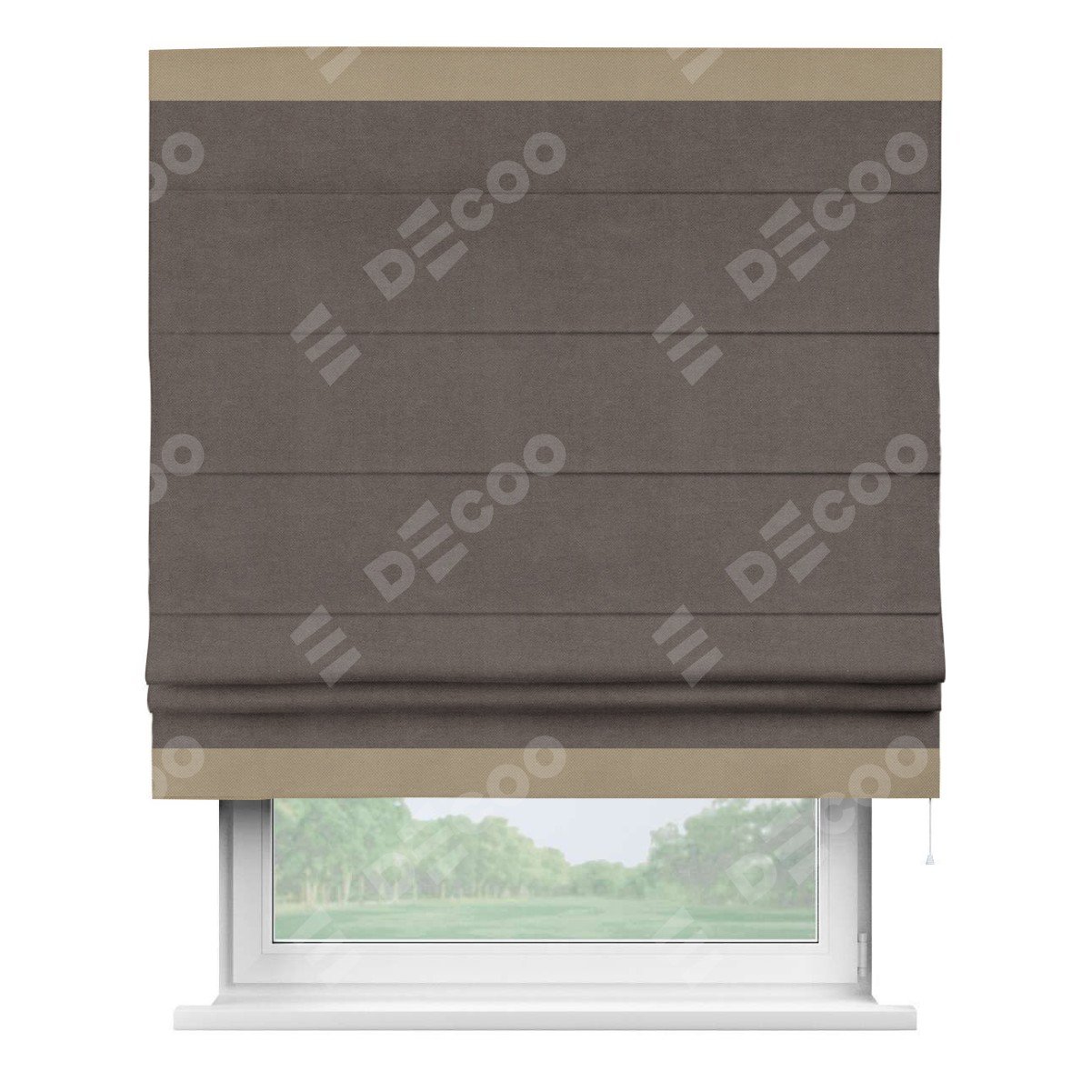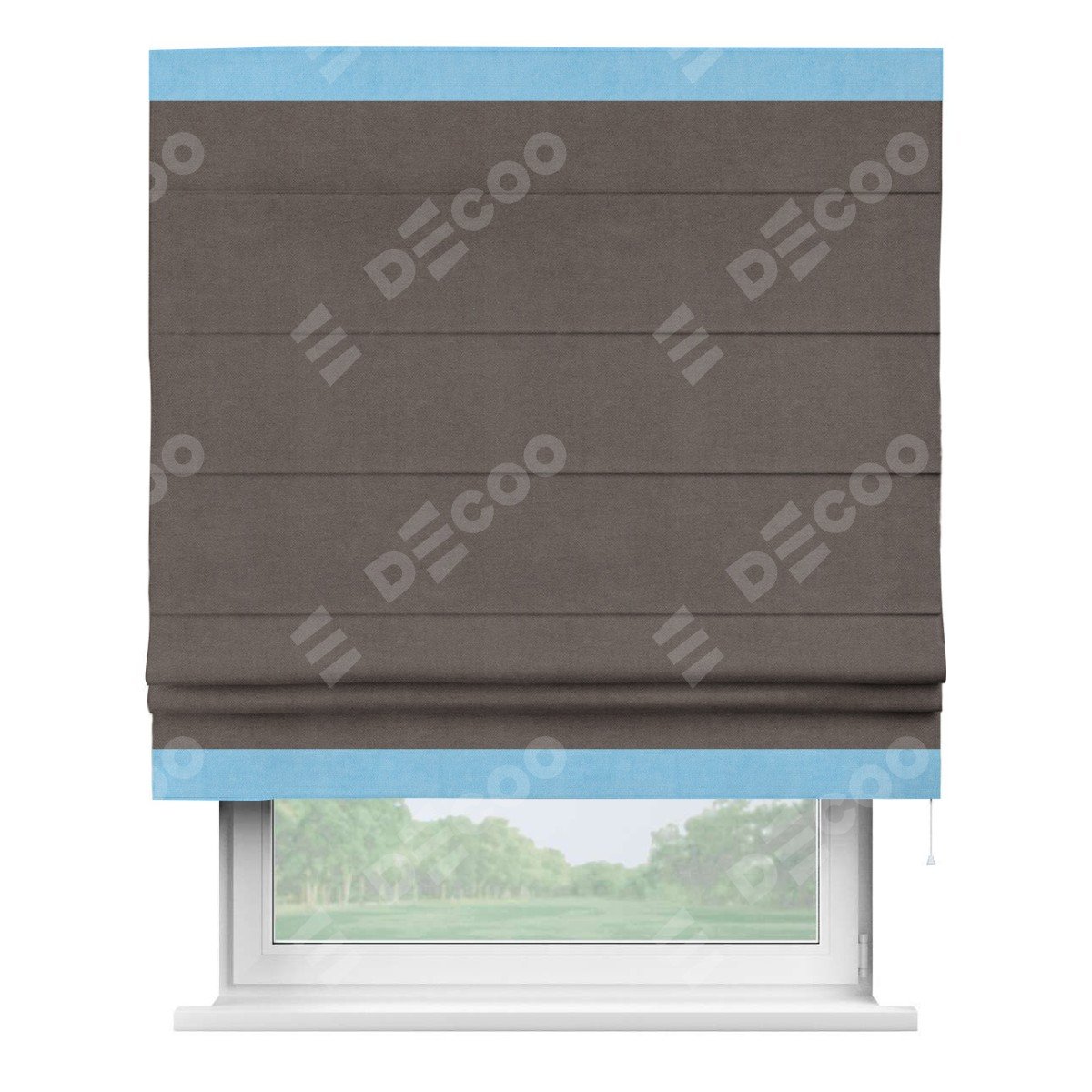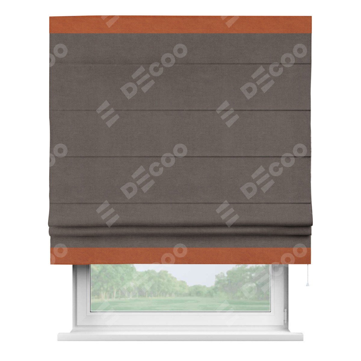 Римская штора производителя «Cortin», используется для проёма, пошита из ткани вельвет коричневый, артикул ткани 14135. Отделка шторы кантом «Горизонт», ткань для канта используется из вельвета разной расцветки на выбор. Имеет универсальный механизм и подходит для монтажа: на потолок, на стену и в нишу.