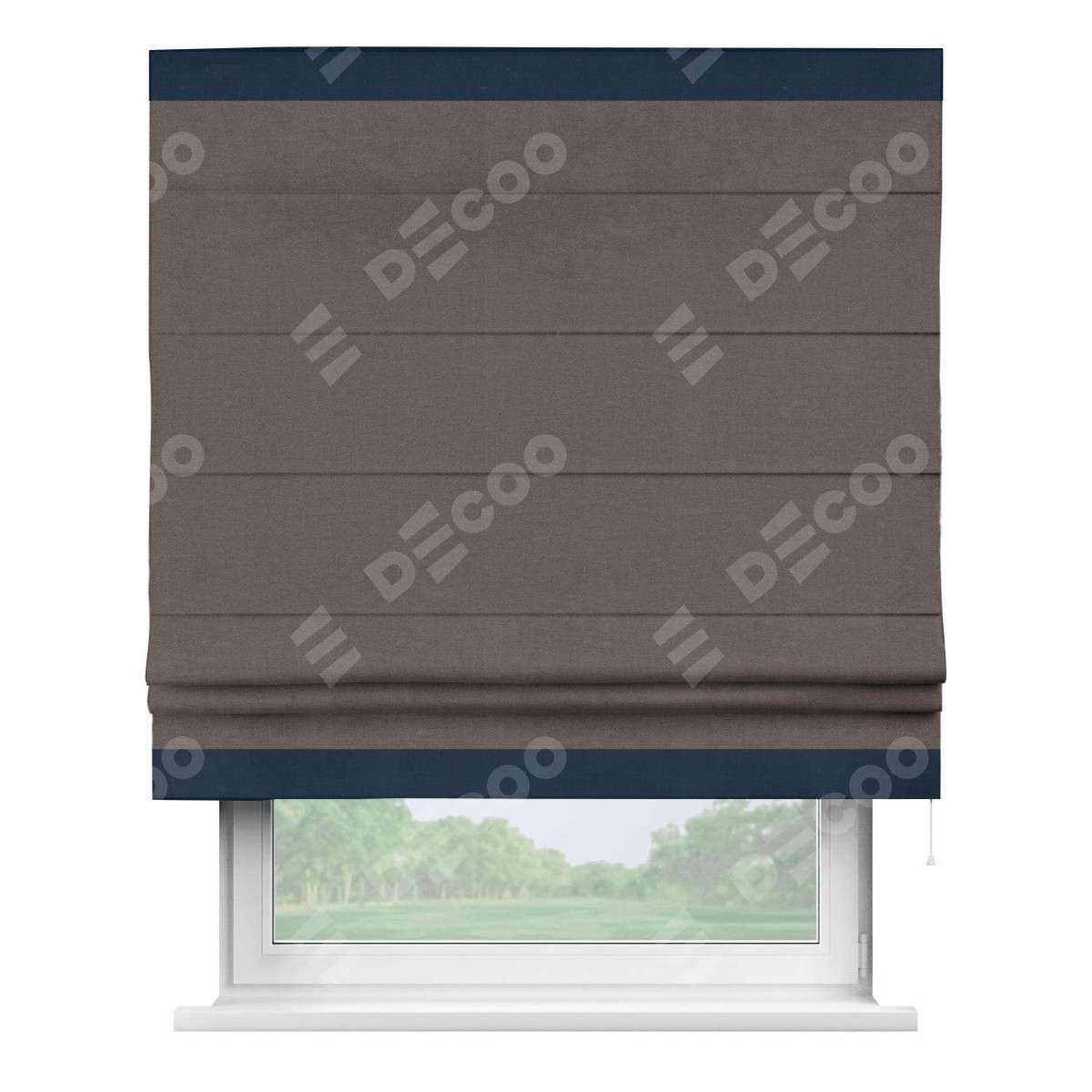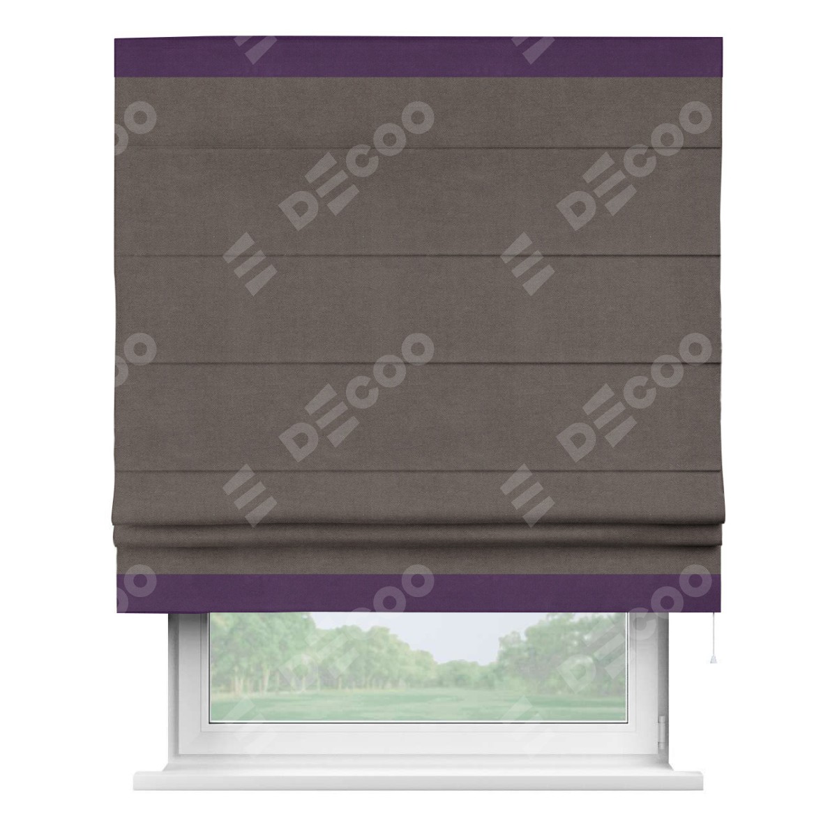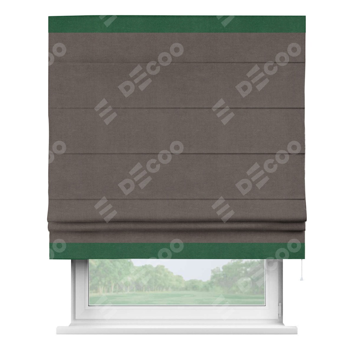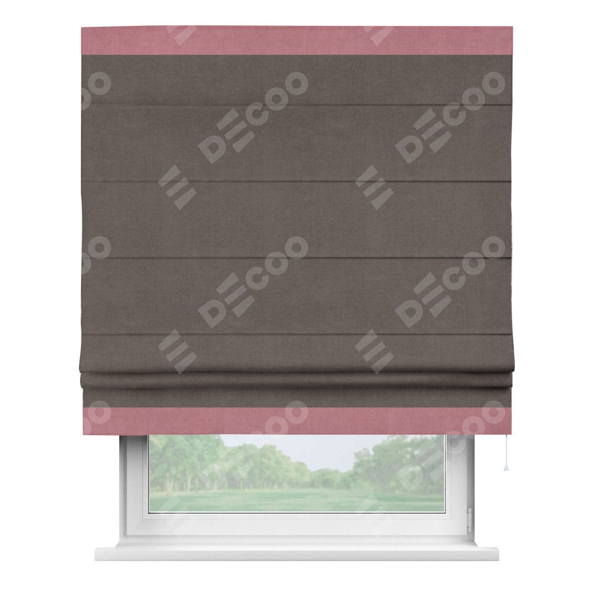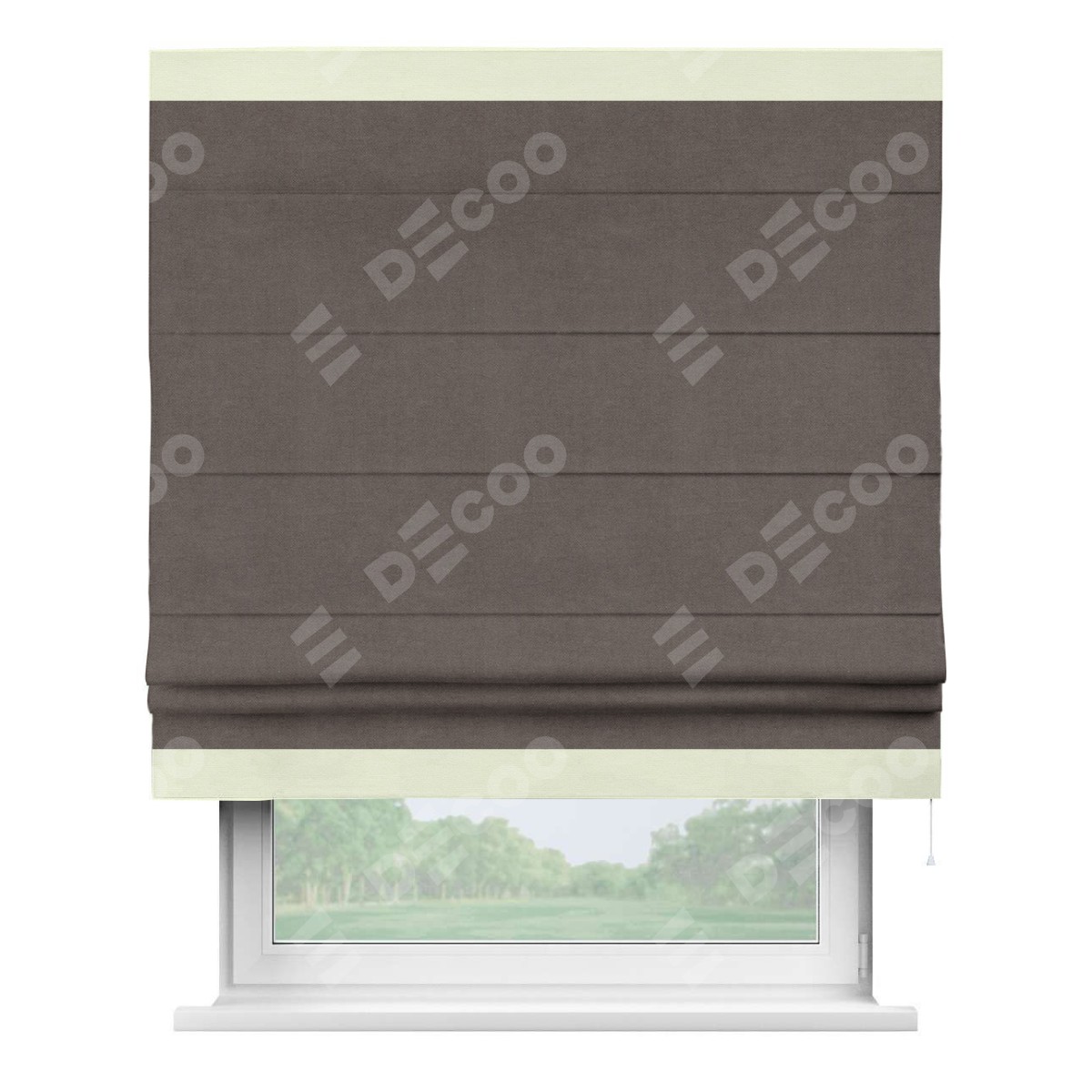 Римская штора производителя «Cortin», используется для проёма, пошита из ткани вельвет коричневый, артикул ткани 14135. Отделка шторы кантом «Горизонт», ткань для канта используется из вельвета разной расцветки на выбор. Имеет универсальный механизм и подходит для монтажа: на потолок, на стену и в нишу.