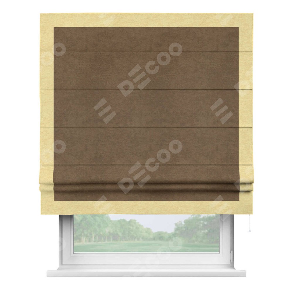 Римская штора производителя «Cortin», используется для проёма, пошита из ткани софт однотонный бронзовый, артикул 33099. Отделка шторы кантом «Чесс», ткань для канта используется из софта разной расцветки на выбор. Имеет универсальный механизм и подходит для монтажа: на потолок, на стену и в нишу.