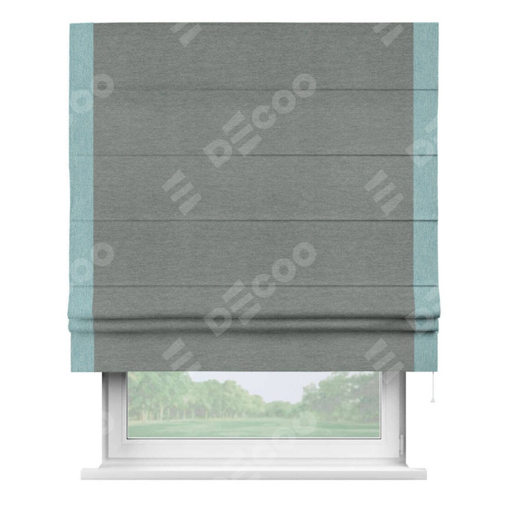 Римская штора производителя «Cortin», используется для проёма, пошита из ткани твид блэкаут серый, артикул 21577. Отделка шторы кантом «Стрим Дуо», ткань для канта используется из твида разной расцветки на выбор. Имеет универсальный механизм и подходит для монтажа: на потолок, на стену и в нишу.