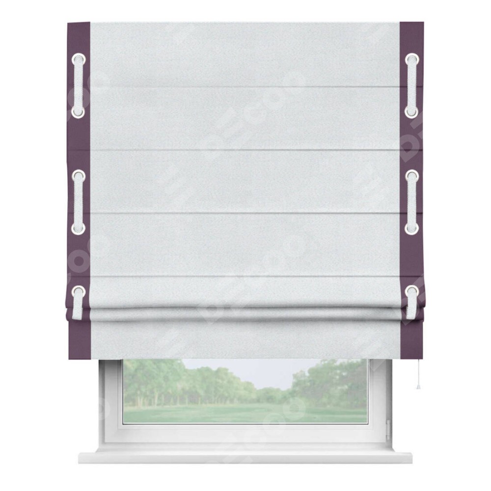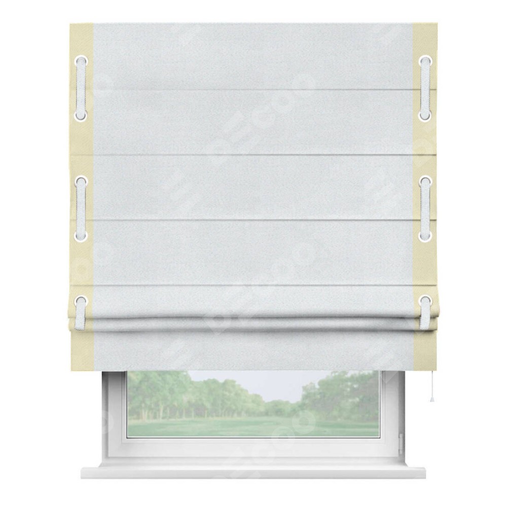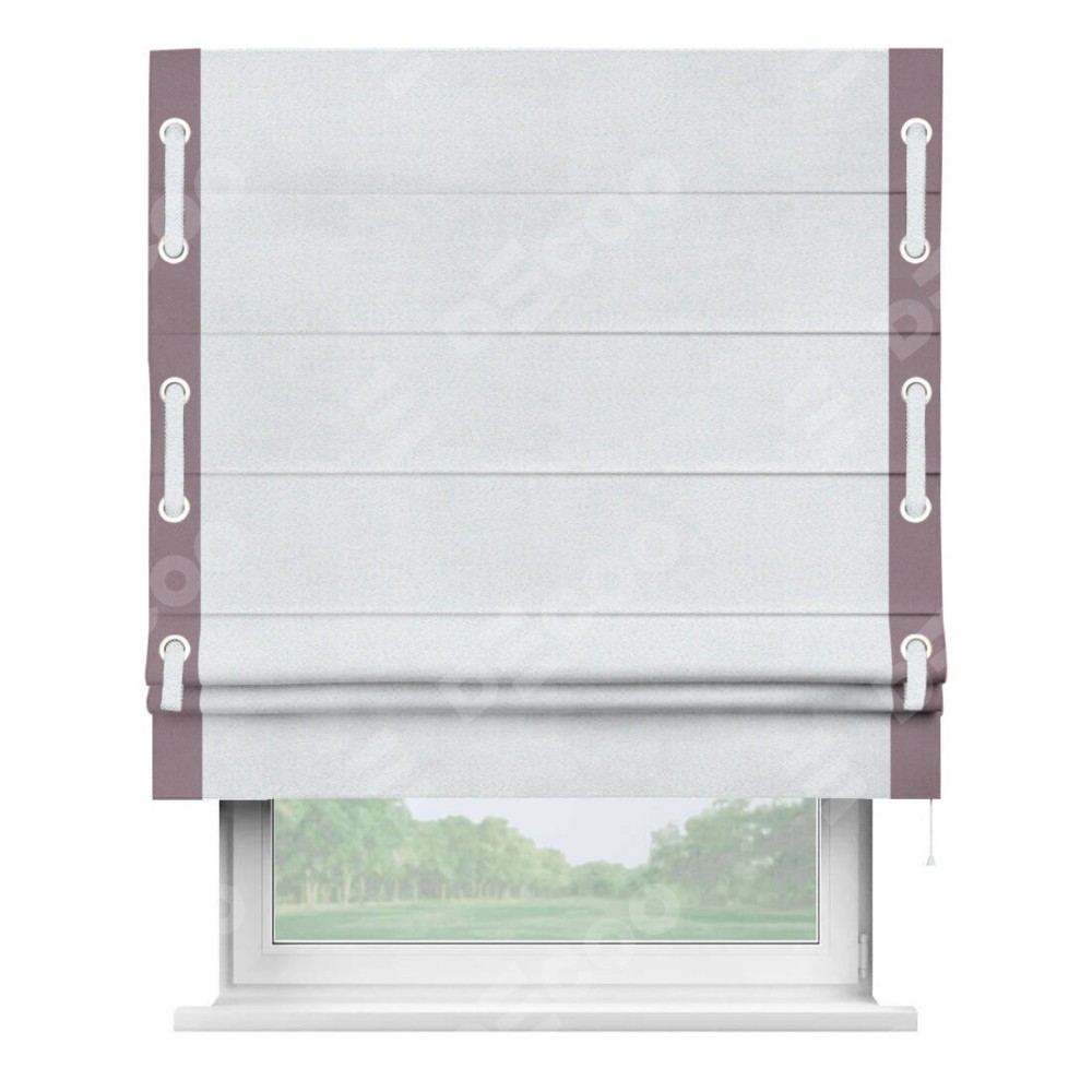 Римская штора производителя «Cortin», используется для проёма, пошита из ткани блэкаут однотонный дымчато-белый, артикул ткани 101. Отделка шторы кантом «Стрим Дуо» на кантах расположены люверсы с пояском, ткань для канта используется из блэкаута однотонного разной расцветки на выбор. Ткань для пояска обычно используется из основной ткани шторы, а так же можно сделать из любой расцветки по желанию. Имеет универсальный механизм и подходит для монтажа: на потолок, на стену и в нишу.