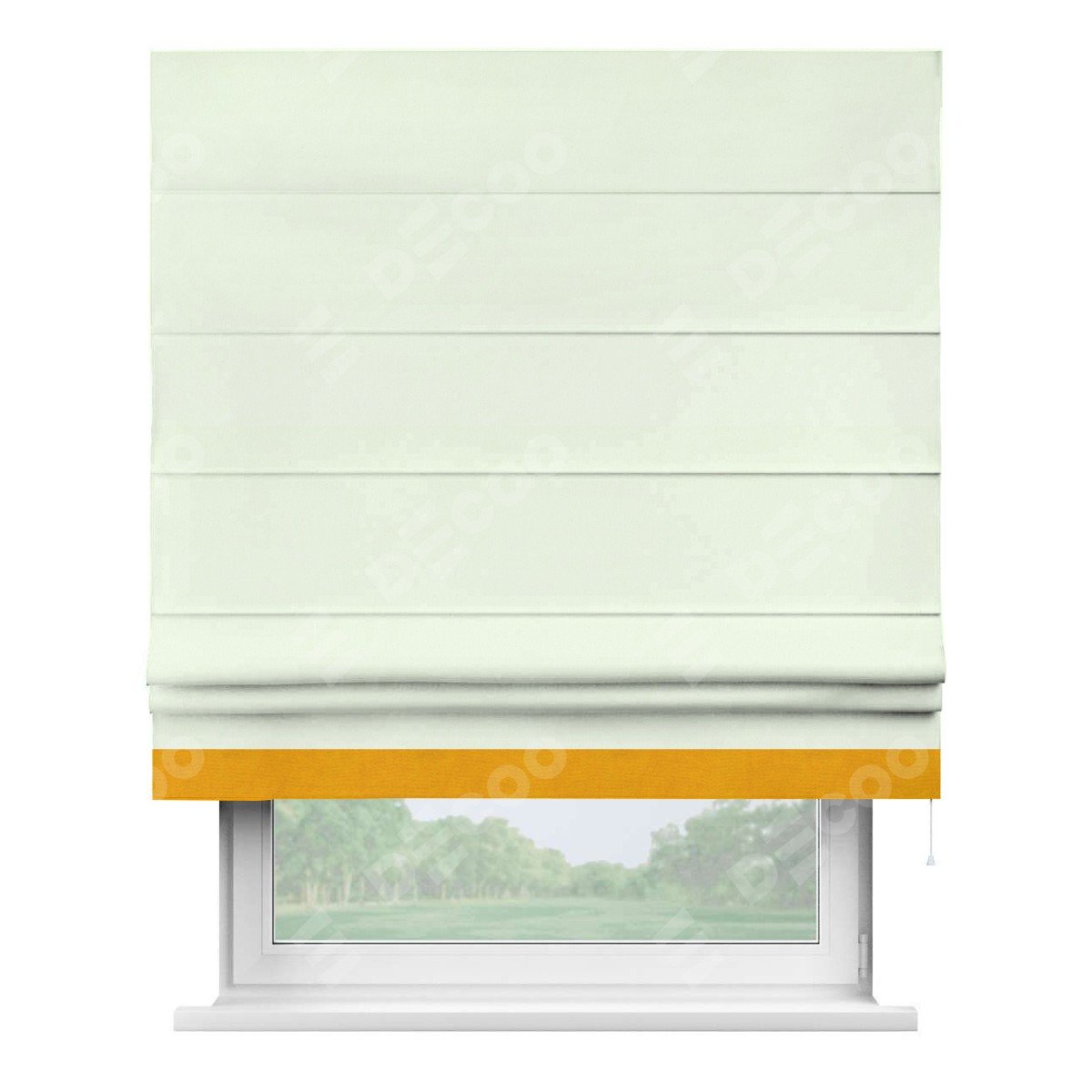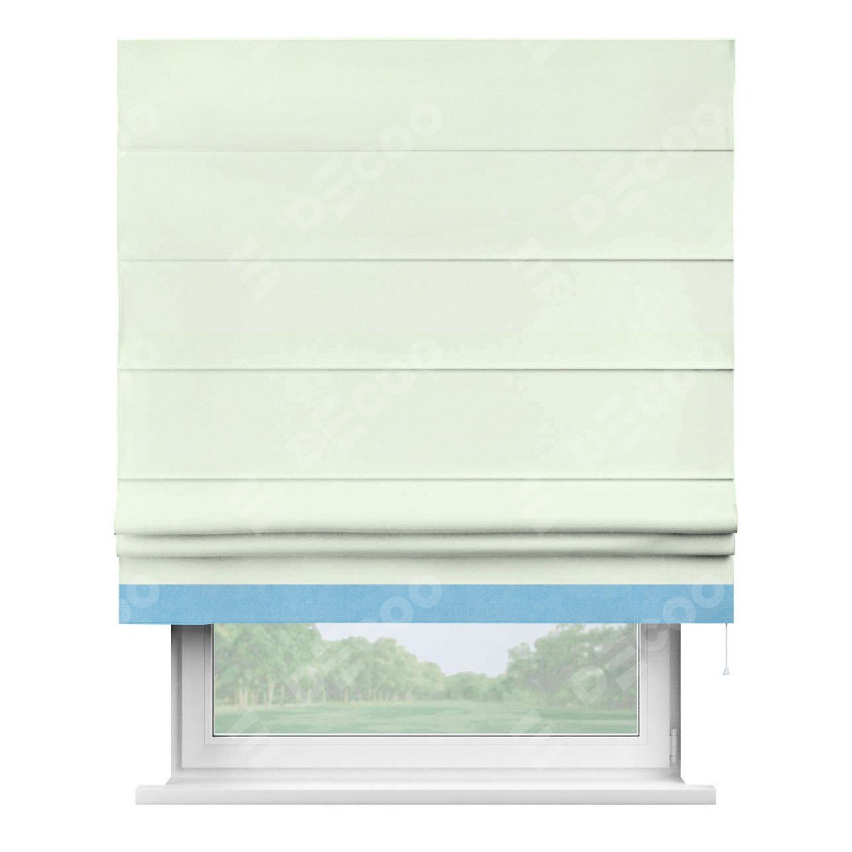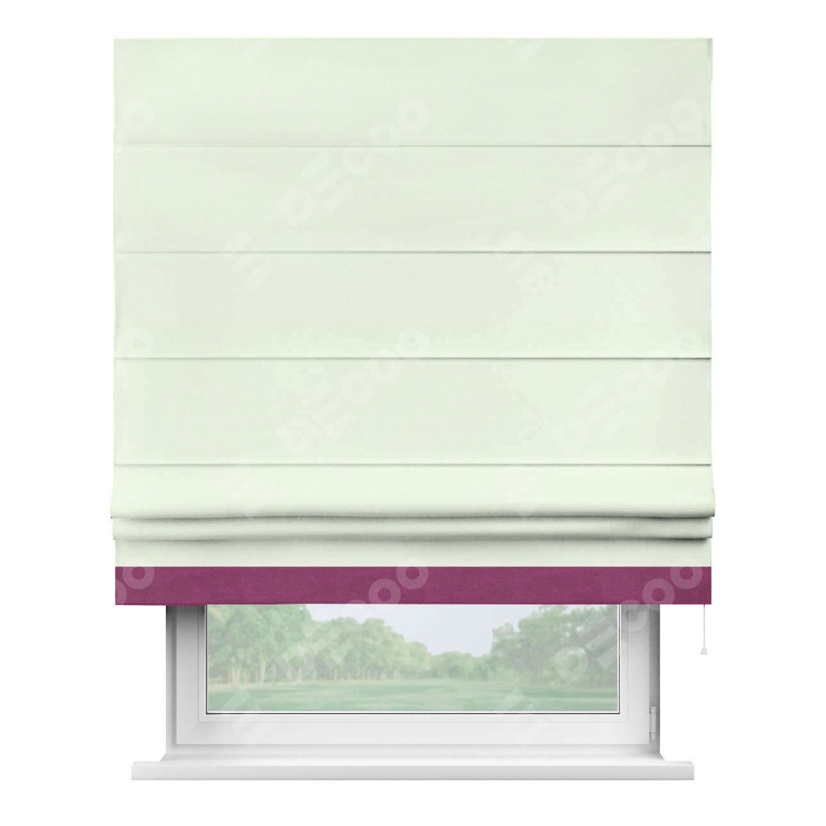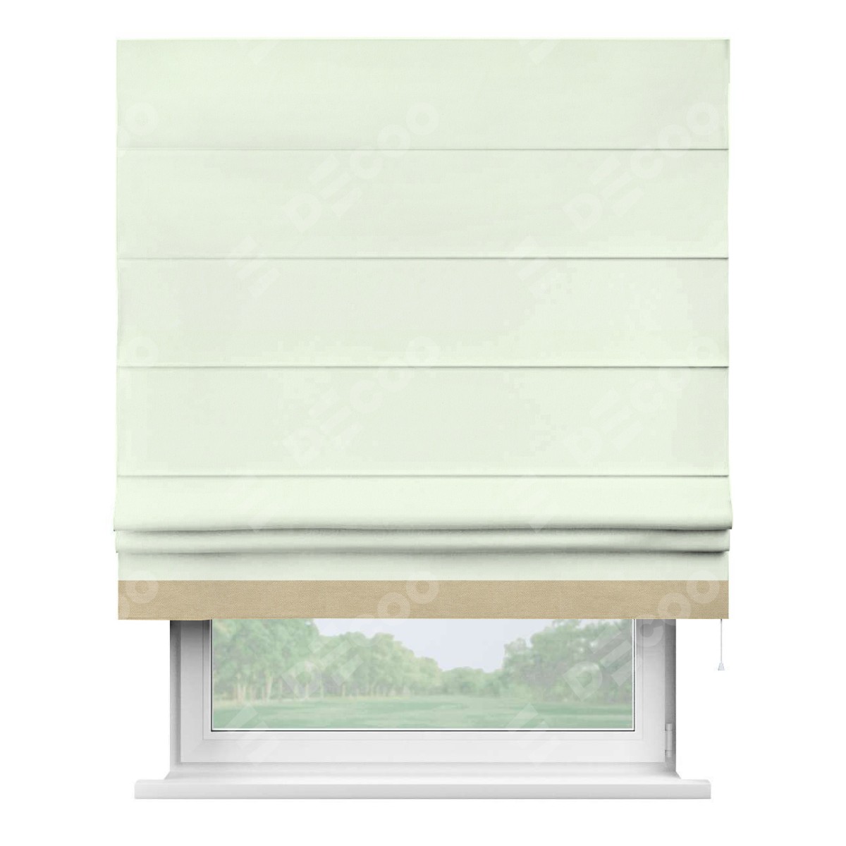 Римская штора производителя «Cortin», используется для проёма, пошита из ткани вельвет кремовый, артикул ткани 85524. Отделка шторы кантом «Джестер», ткань для канта используется из вельвета разной расцветки на выбор. Имеет универсальный механизм и подходит для монтажа: на потолок, на стену и в нишу.