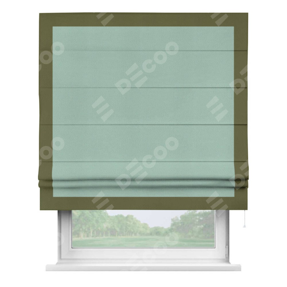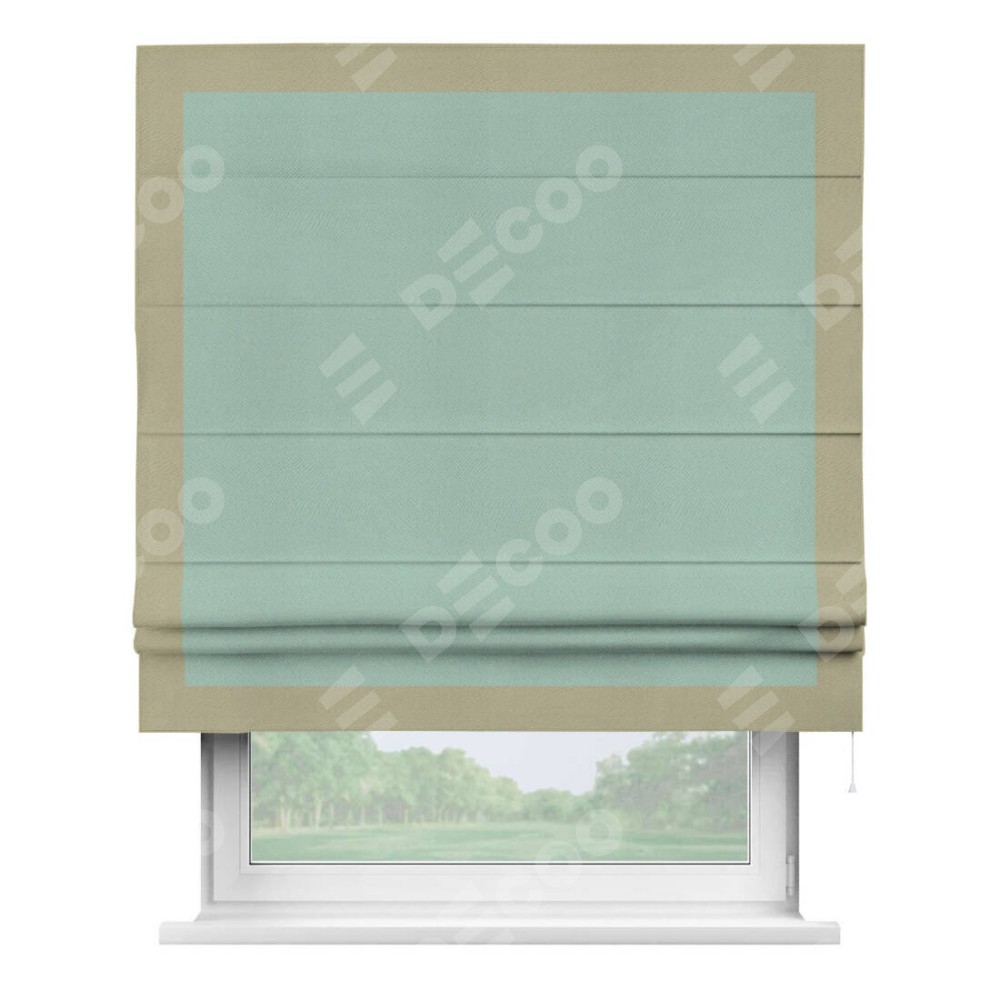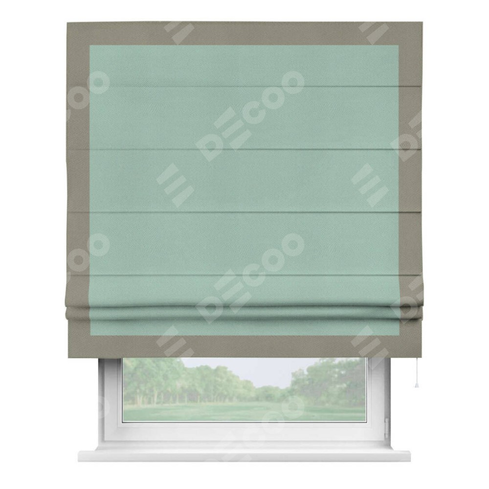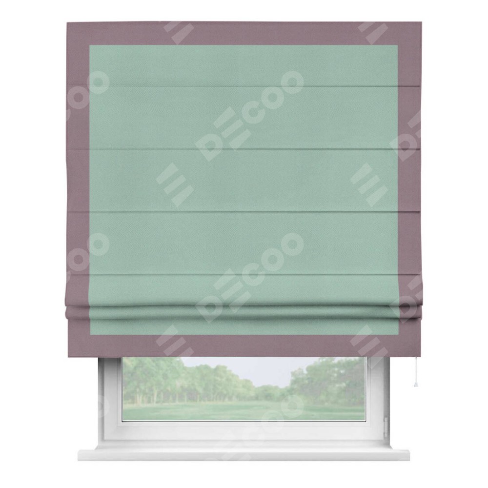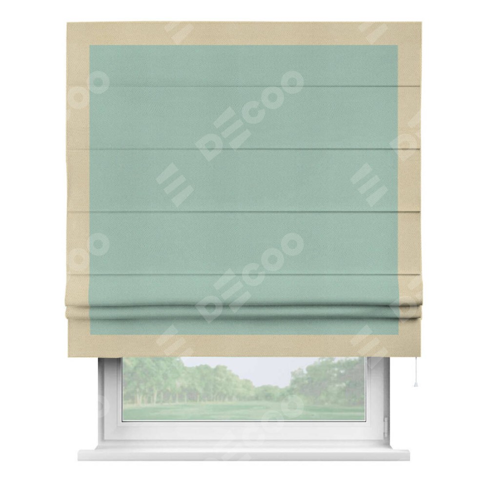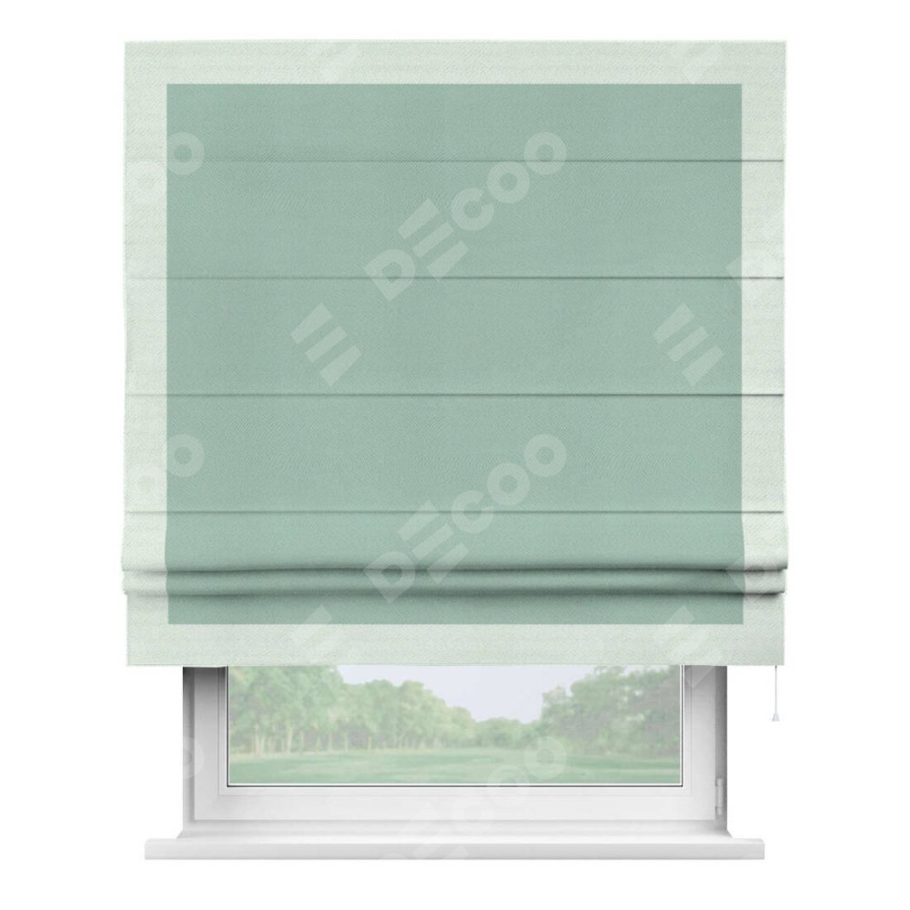 Римская штора производителя «Cortin», используется для проёма, пошита из ткани блэкаут однотонный ментоловый, артикул ткани 29584. Отделка шторы кантом «Чесс», ткань для канта используется из блэкаута однотонного разной расцветки на выбор. Имеет универсальный механизм и подходит для монтажа: на потолок, на стену и в нишу.