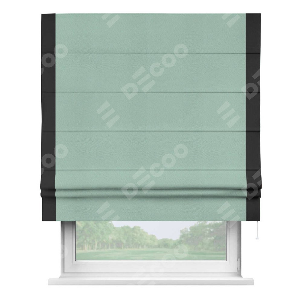 Римская штора производителя «Cortin», используется для проёма, пошита из ткани блэкаут однотонный ментоловый, артикул ткани 29584. Отделка шторы кантом «Стрим Дуо», ткань для канта используется из блэкаута однотонного разной расцветки на выбор. Имеет универсальный механизм и подходит для монтажа: на потолок, на стену и в нишу.