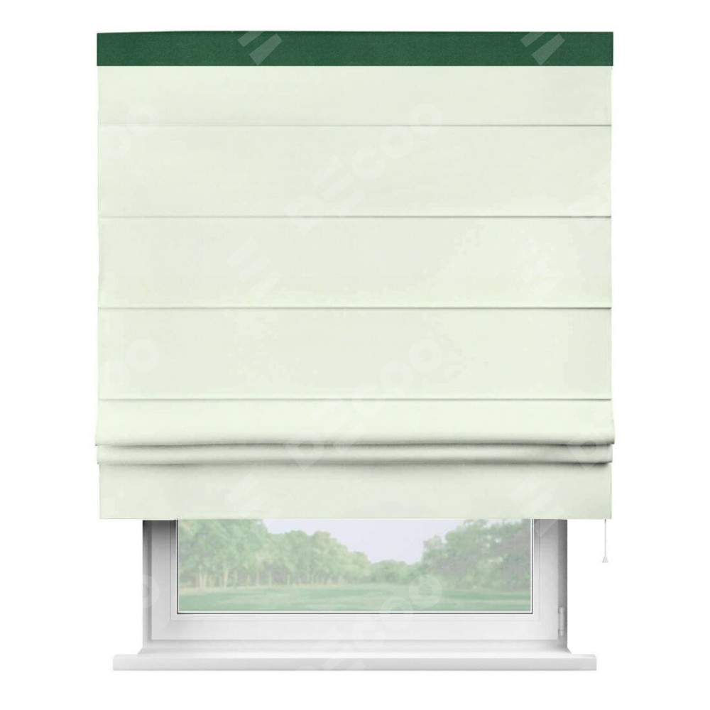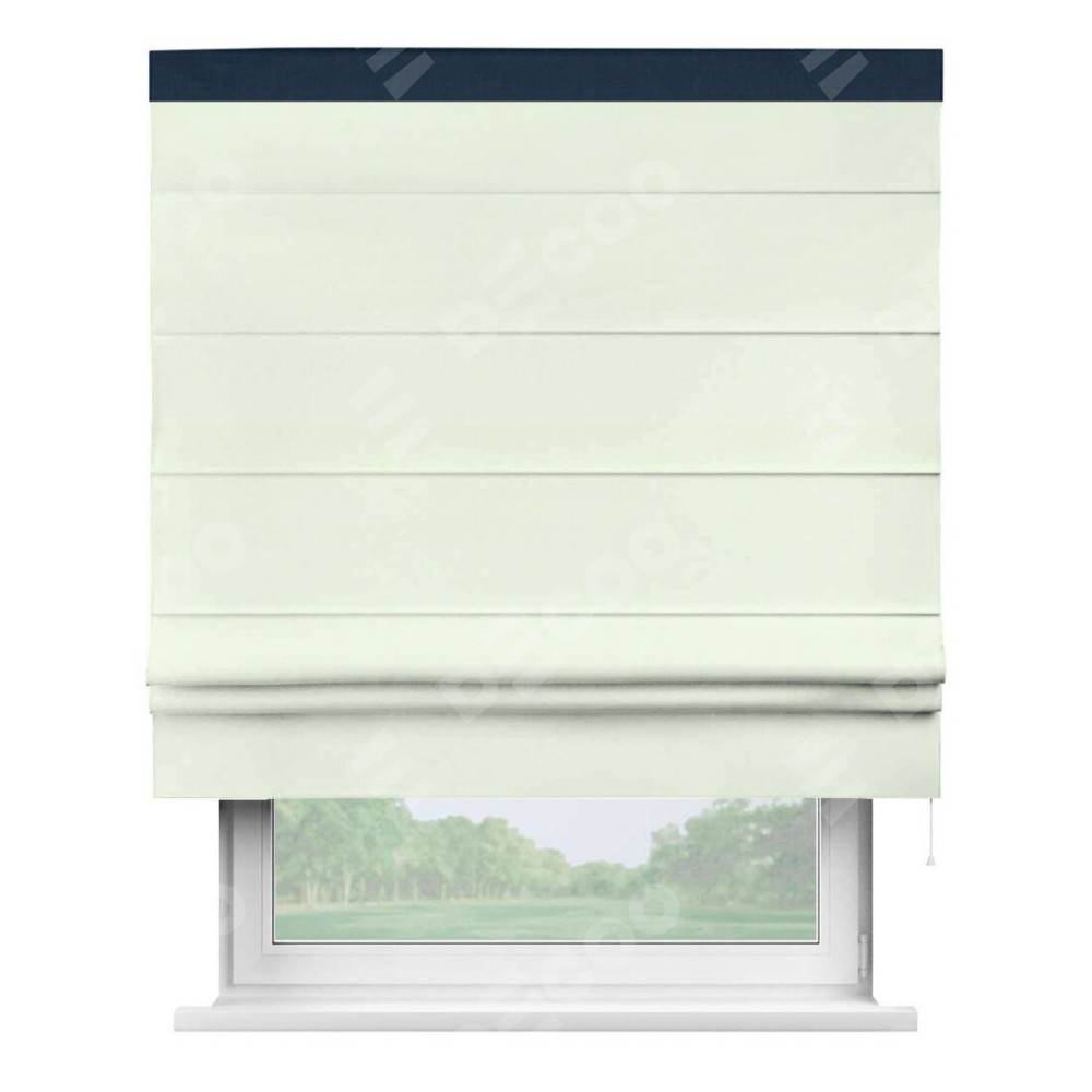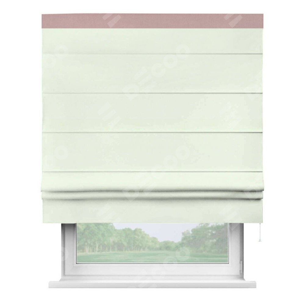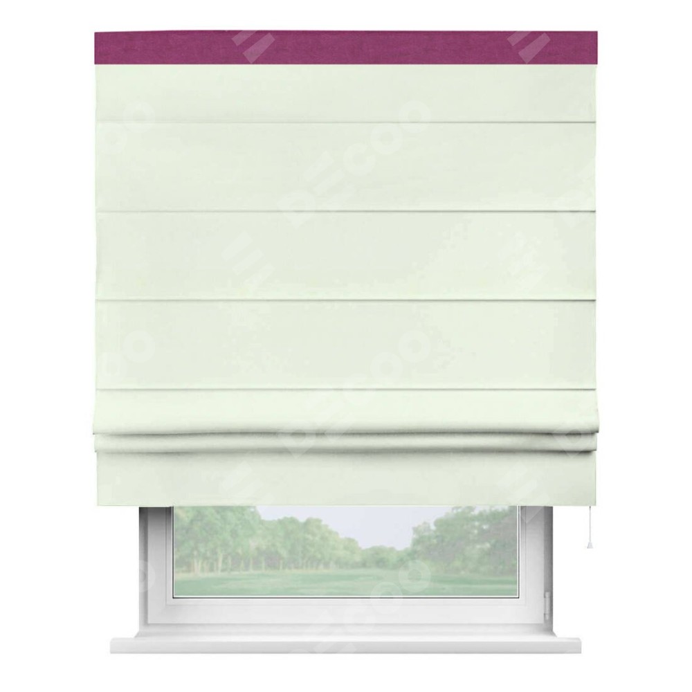 Римская штора производителя «Cortin», используется для проёма, пошита из ткани вельвет кремовый, артикул ткани 85524. Отделка шторы кантом «Кинг», ткань для канта используется из вельвета разной расцветки на выбор. Имеет универсальный механизм и подходит для монтажа: на потолок, на стену и в нишу.