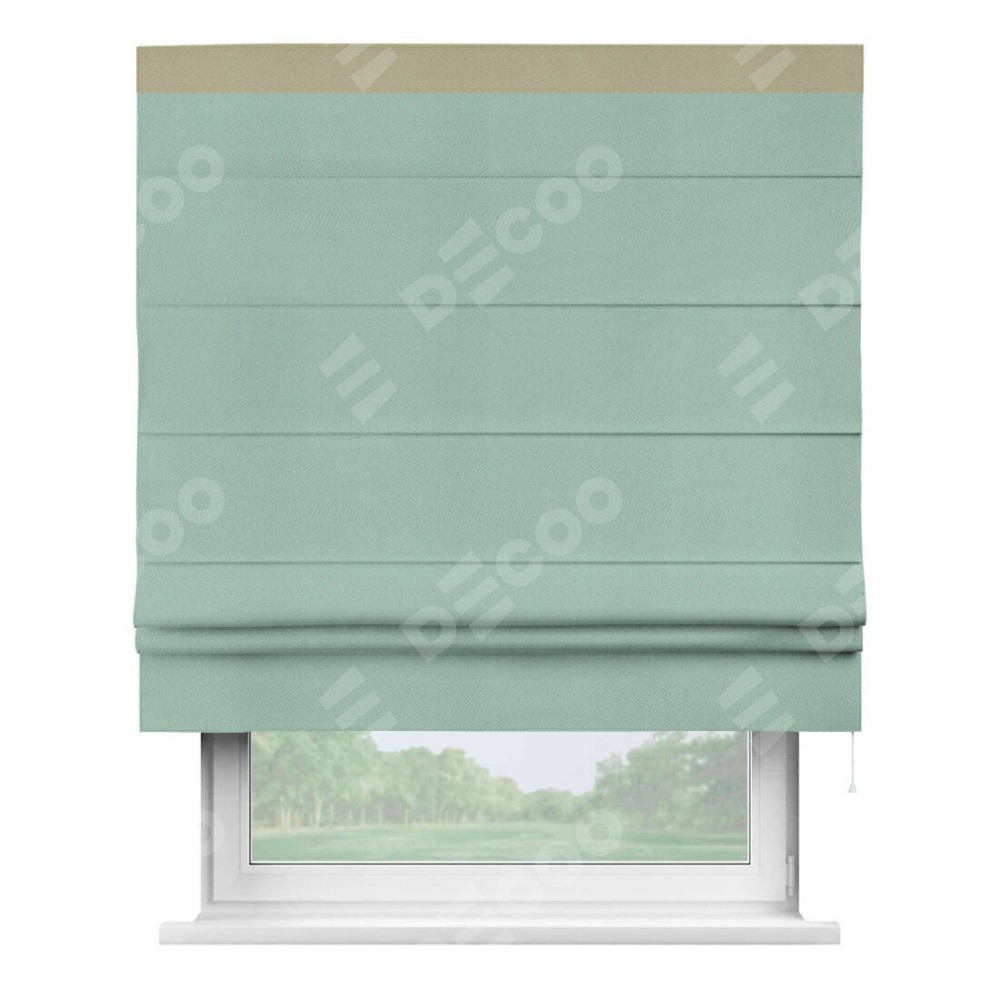 Римская штора производителя «Cortin», используется для проёма, пошита из ткани блэкаут однотонный ментоловый, артикул ткани 29584. Отделка шторы кантом «Кинг», ткань для канта используется из блэкаута однотонного разной расцветки на выбор. Имеет универсальный механизм и подходит для монтажа: на потолок, на стену и в нишу.