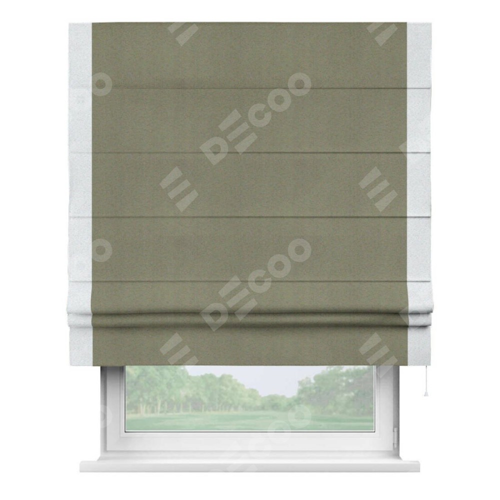 Римская штора производителя «Cortin», используется для проёма, пошита из ткани блэкаут однотонный серо-коричневый, артикул ткани 29568. Отделка шторы кантом «Стрим Дуо», ткань для канта используется из блэкаута однотонного разной расцветки на выбор. Имеет универсальный механизм и подходит для монтажа: на потолок, на стену и в нишу.