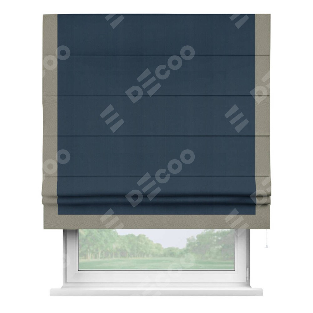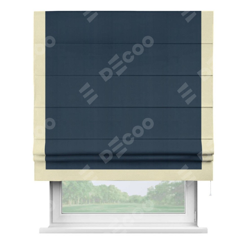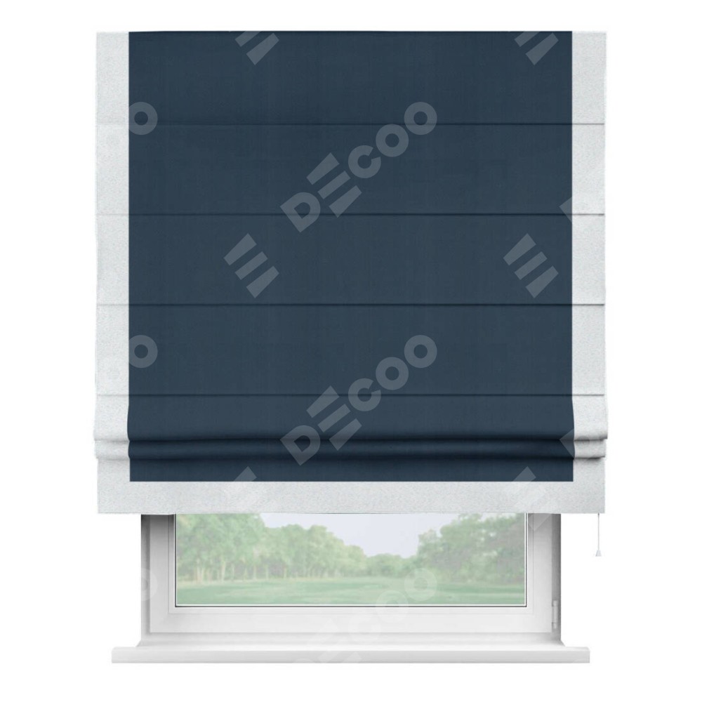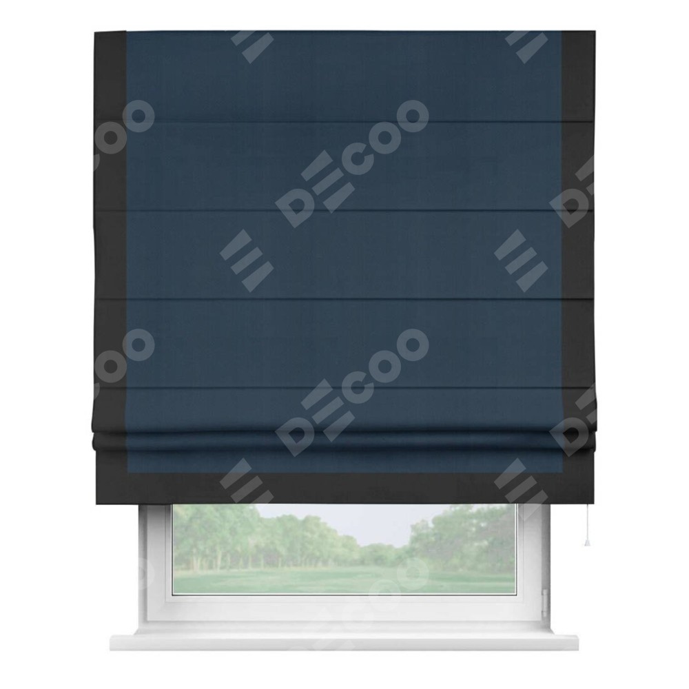 Римская штора производителя «Cortin», используется для проёма, пошита из ткани блэкаут однотонный синий, артикул ткани 29327. Отделка шторы кантом «Виктория», ткань для канта используется из блэкаута однотонного разной расцветки на выбор. Имеет универсальный механизм и подходит для монтажа: на потолок, на стену и в нишу.