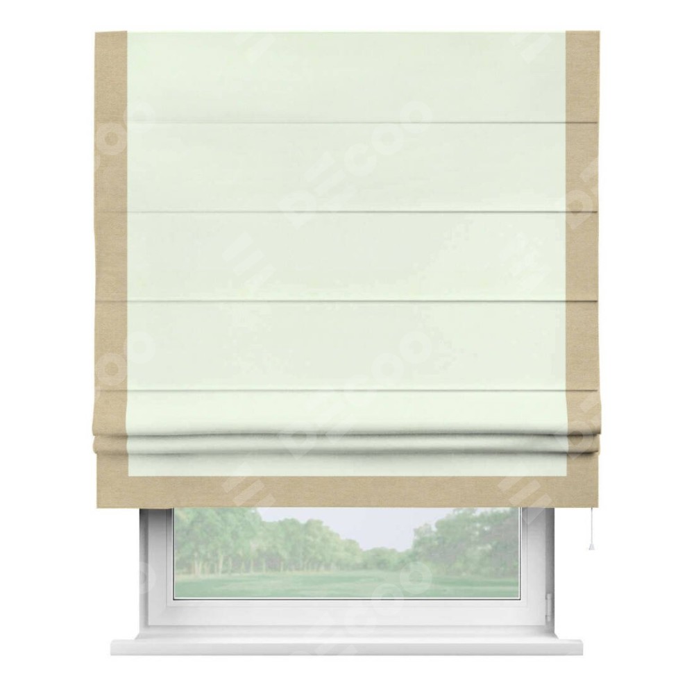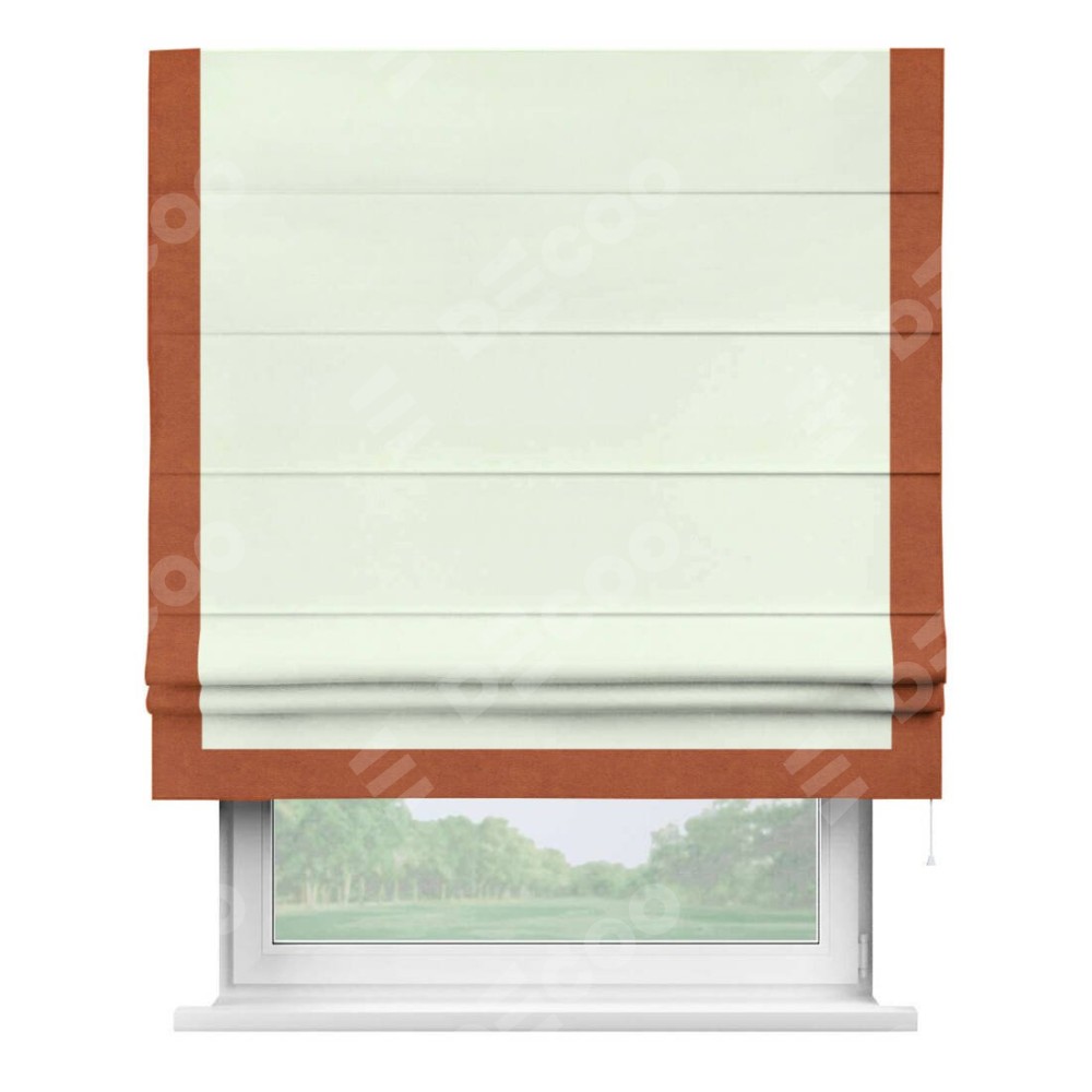 Римская штора производителя «Cortin», используется для проёма, пошита из ткани вельвет кремовый, артикул ткани 85524. Отделка шторы кантом «Виктория», ткань для канта используется из вельвета разной расцветки на выбор. Имеет универсальный механизм и подходит для монтажа: на потолок, на стену и в нишу.