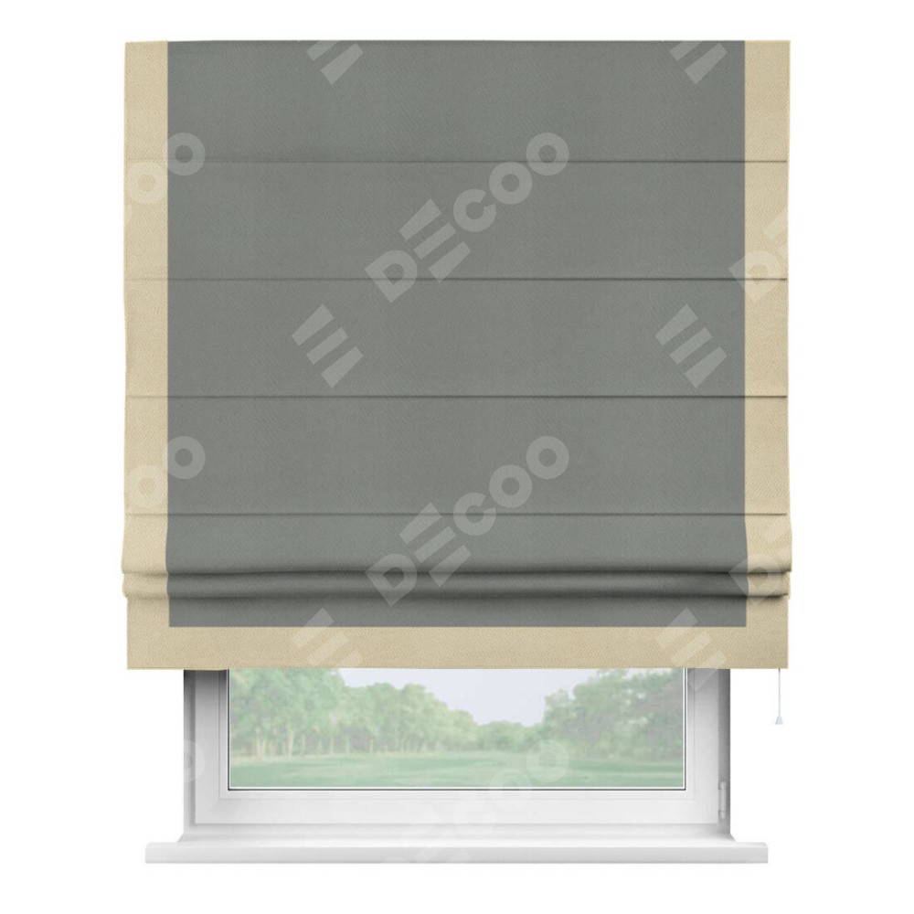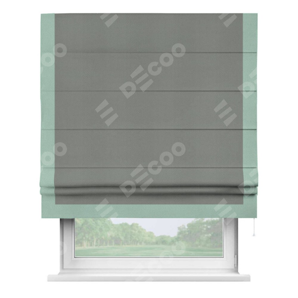 Римская штора производителя «Cortin», используется для проёма, пошита из ткани блэкаут однотонный тёмно-серый, артикул ткани 18077. Отделка шторы кантом «Виктория», ткань для канта используется из блэкаута однотонного разной расцветки на выбор. Имеет универсальный механизм и подходит для монтажа: на потолок, на стену и в нишу.