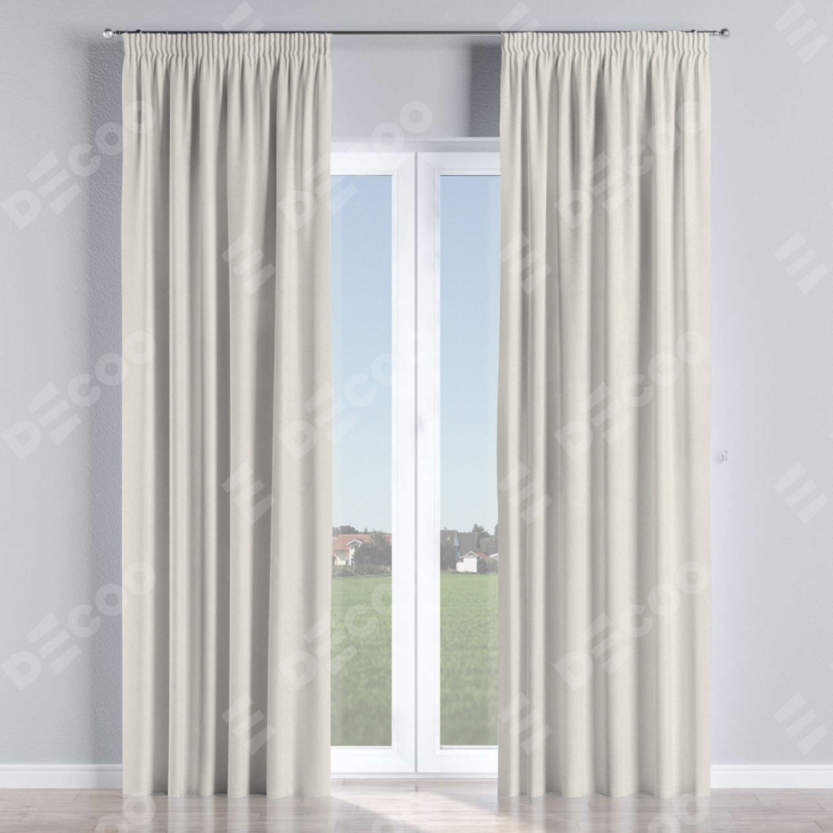 Комплект прямых штор, от производителя «Cortin», пошиты из ткани блэкаут с блеском светло-серый, артикул ткани 34633. С изнаночной стороны в верхней части штор пристрачивается шторная лента с декоративными складками «Карандаш». Обратная сторона основного материала черного цвета, что обеспечивает необходимую светонепроницаемость. Для создания элегантных складок прямые шторы шьются по стандарту с коэффициентом 1:2 (на 100 см. ширины проёма 200 см. ширины ткани).