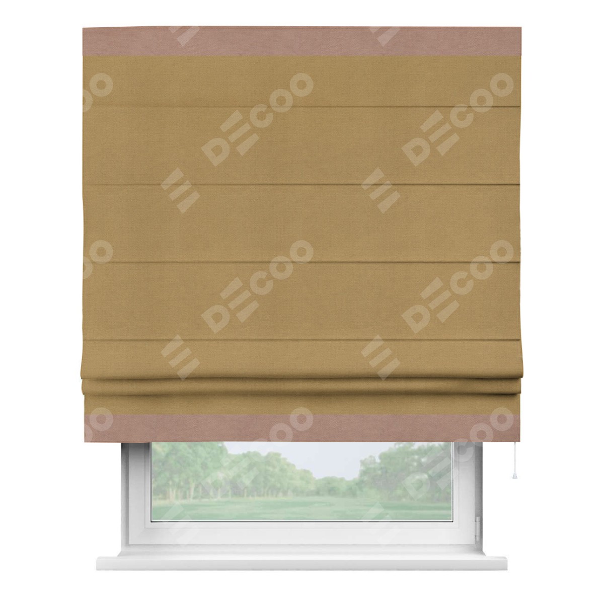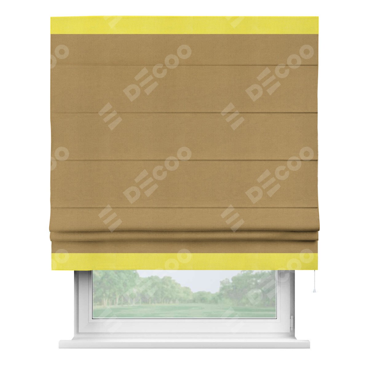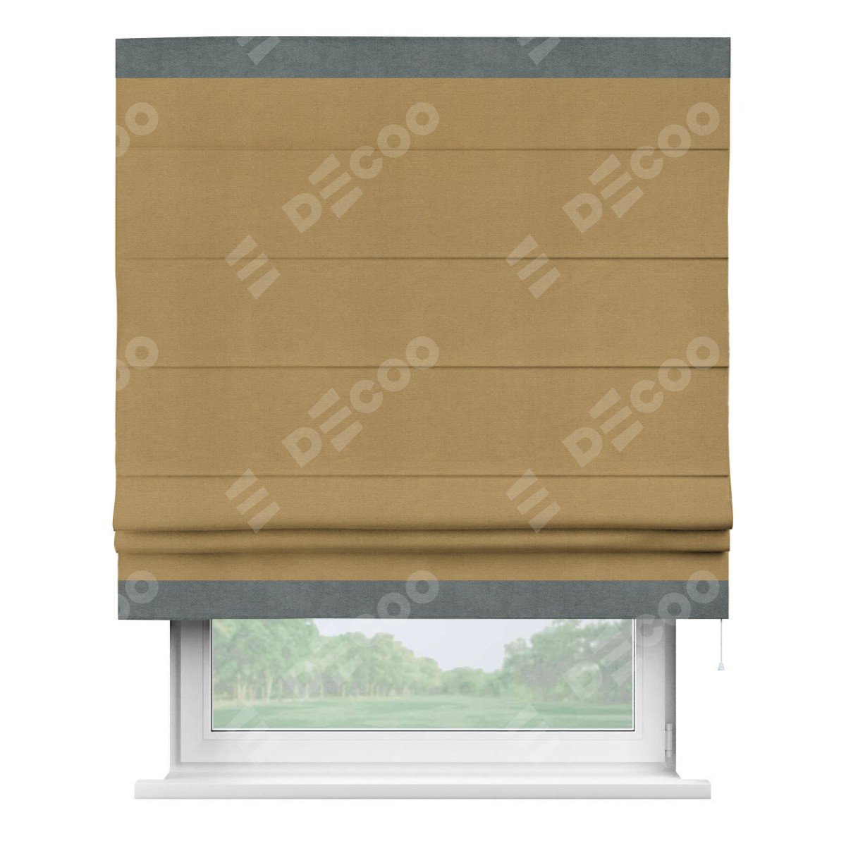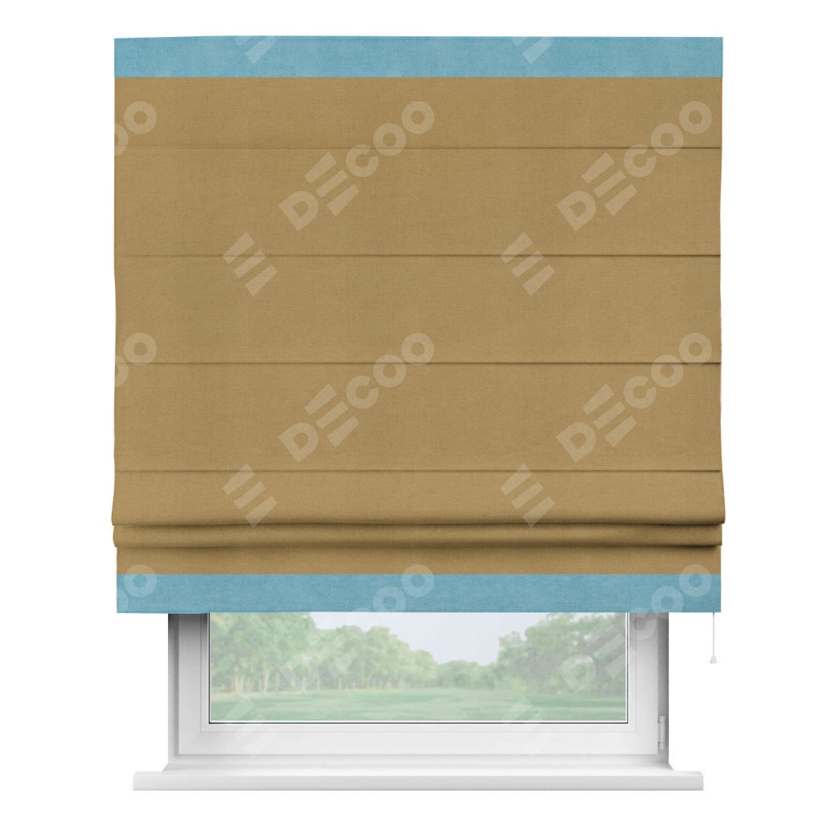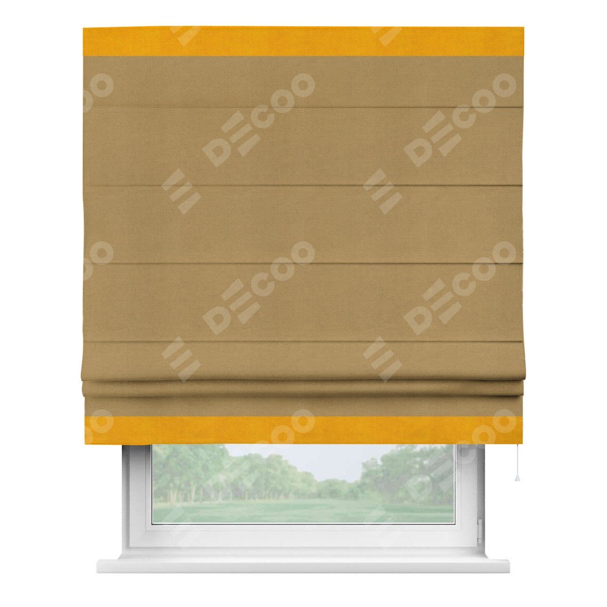 Римская штора производителя «Cortin», используется для проёма, пошита из ткани вельвет горчица, артикул ткани 17760. Отделка шторы кантом «Горизонт», ткань для канта используется из вельвета разной расцветки на выбор. Имеет универсальный механизм и подходит для монтажа: на потолок, на стену и в нишу.
