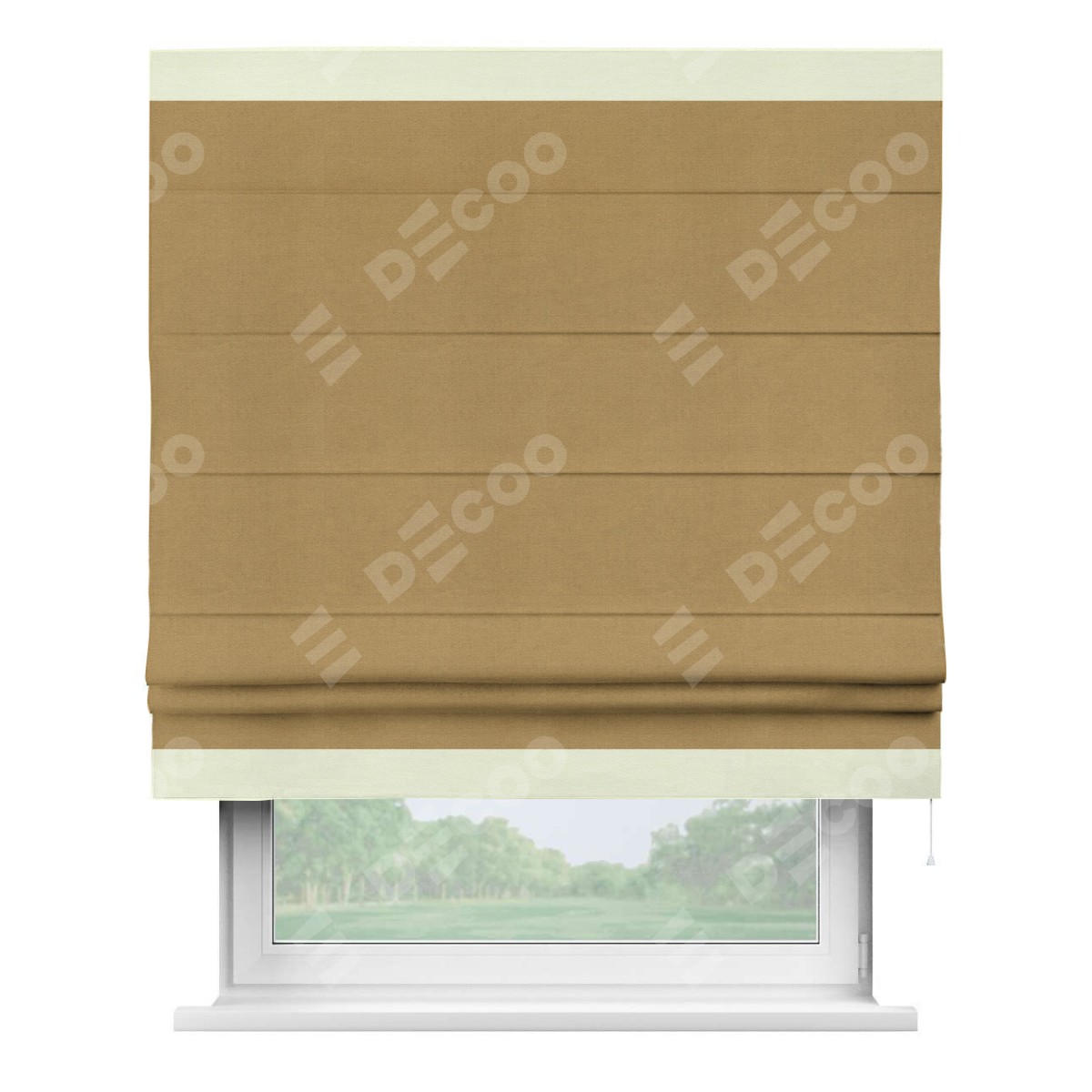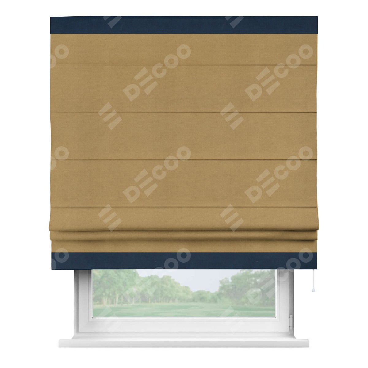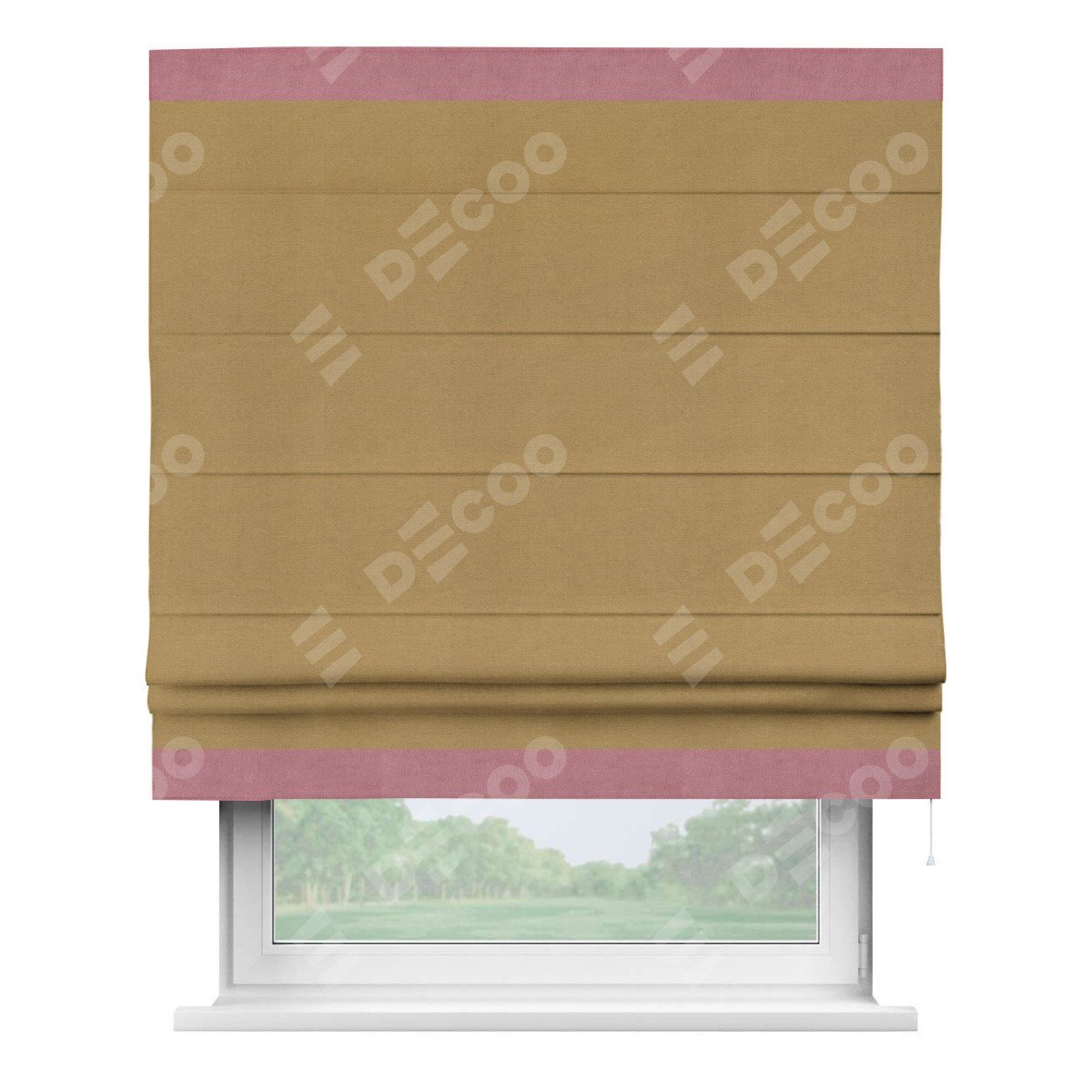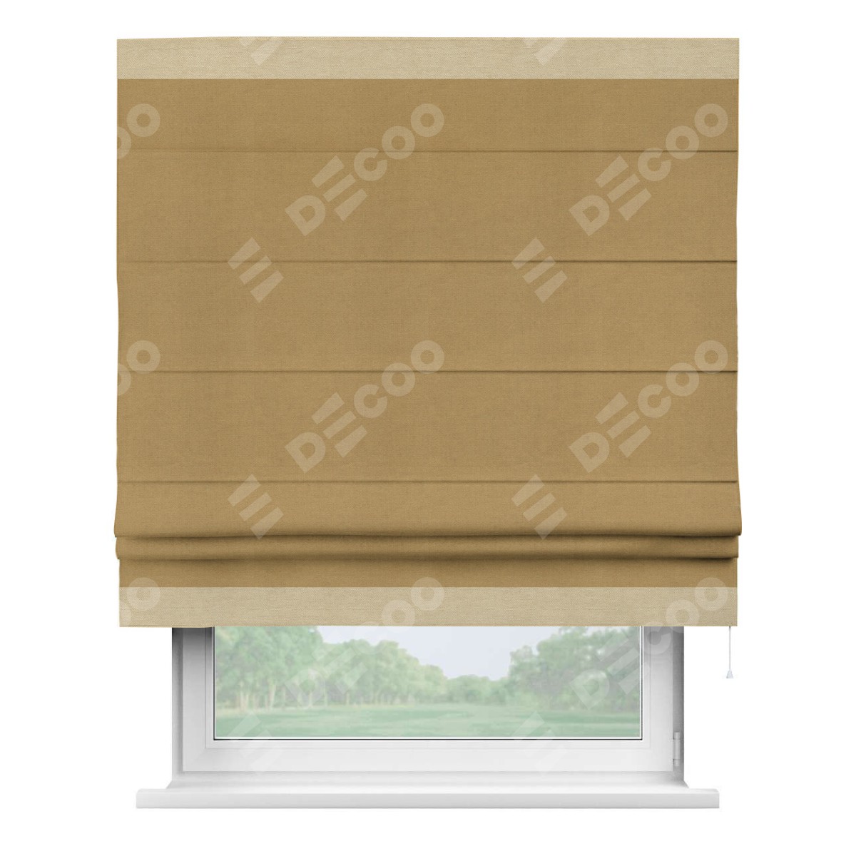 Римская штора производителя «Cortin», используется для проёма, пошита из ткани вельвет горчица, артикул ткани 17760. Отделка шторы кантом «Горизонт», ткань для канта используется из вельвета разной расцветки на выбор. Имеет универсальный механизм и подходит для монтажа: на потолок, на стену и в нишу.