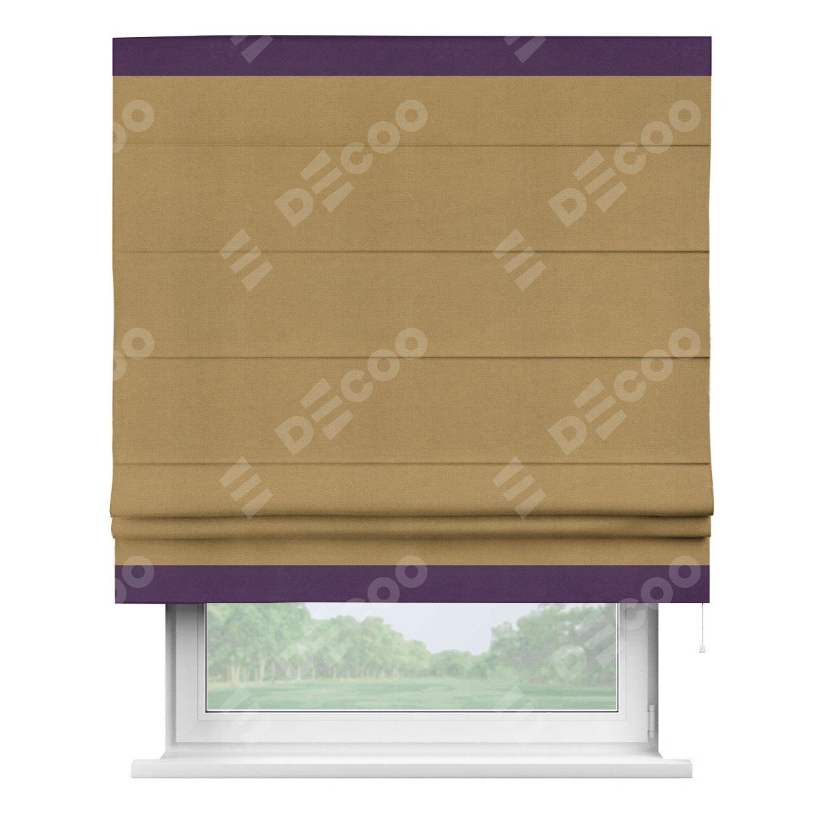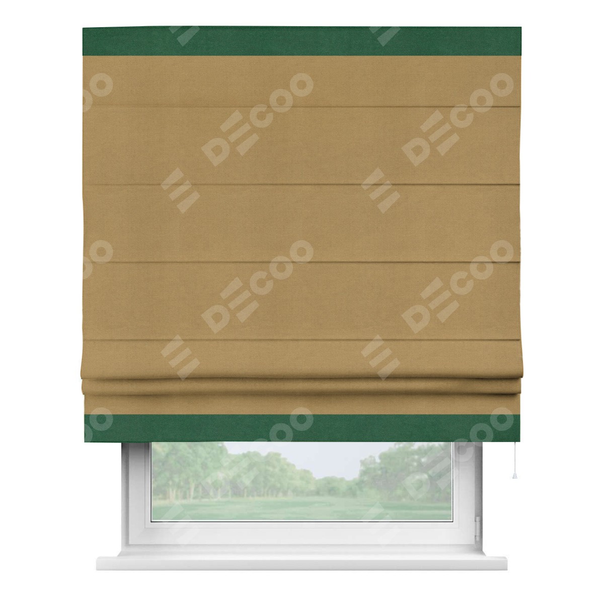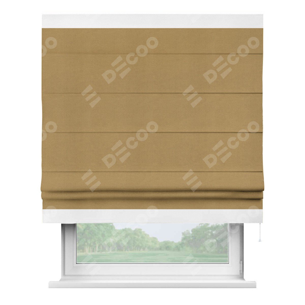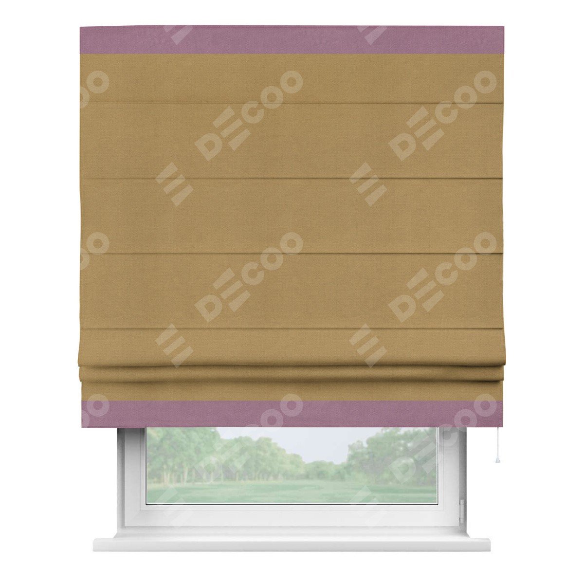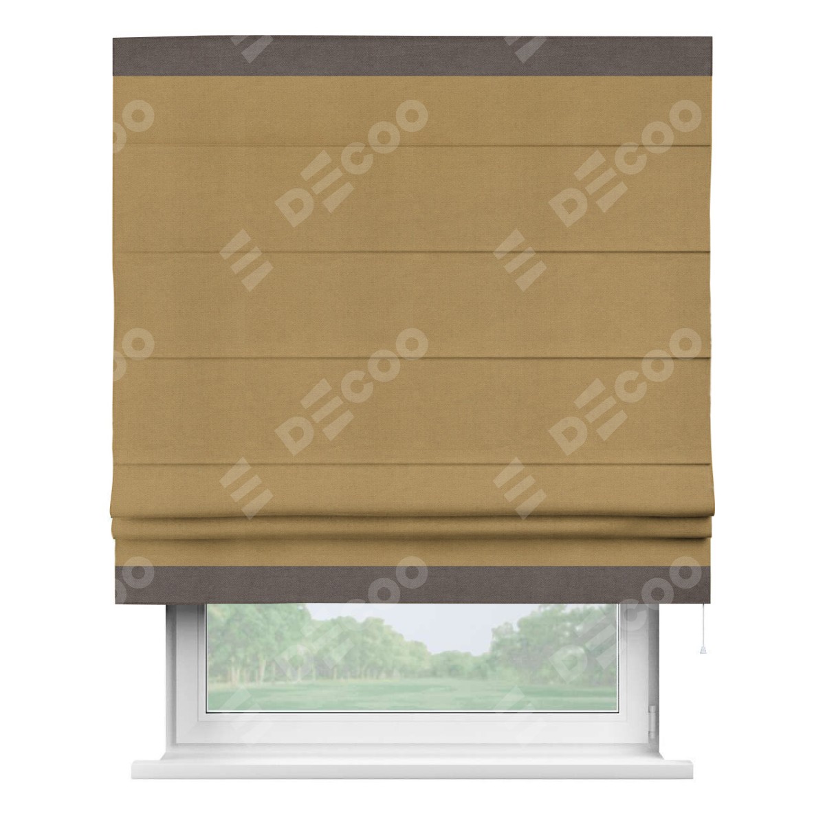 Римская штора производителя «Cortin», используется для проёма, пошита из ткани вельвет горчица, артикул ткани 17760. Отделка шторы кантом «Горизонт», ткань для канта используется из вельвета разной расцветки на выбор. Имеет универсальный механизм и подходит для монтажа: на потолок, на стену и в нишу.