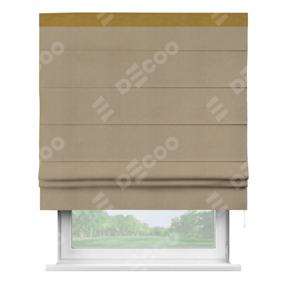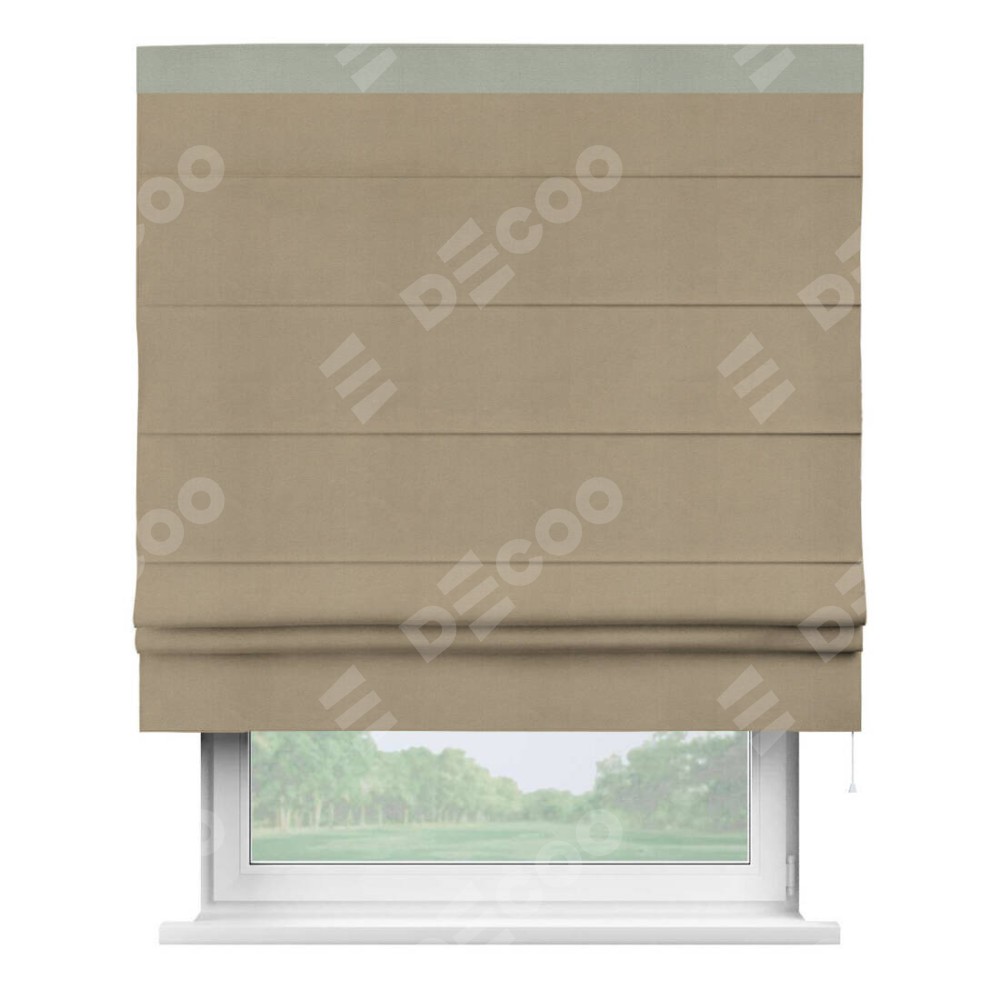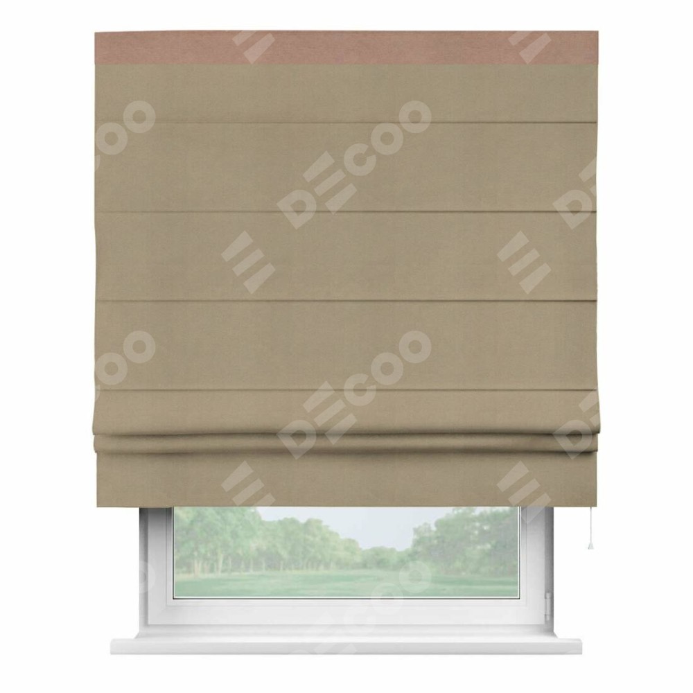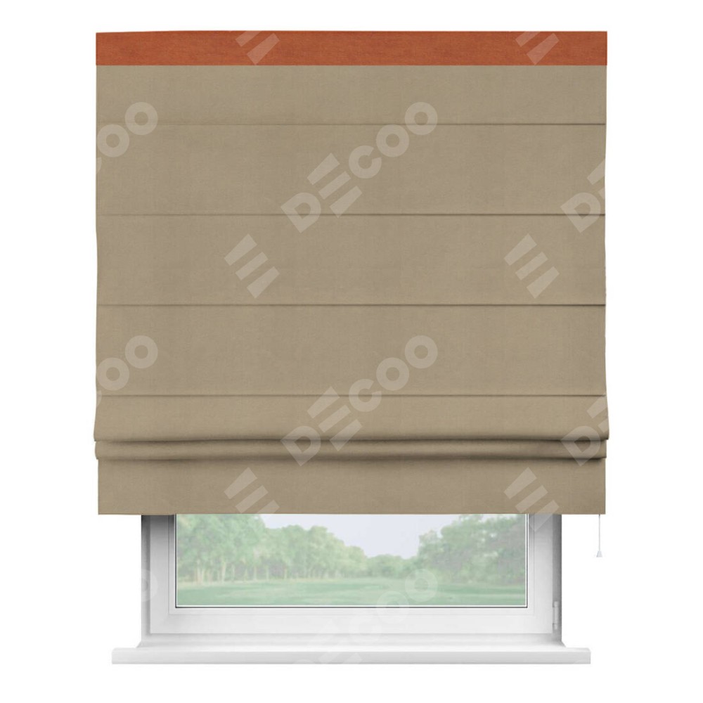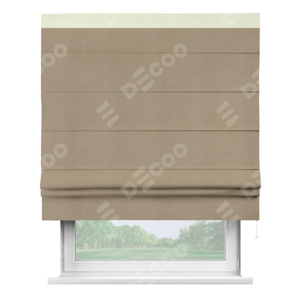 Римская штора производителя «Cortin», используется для проёма, пошита из ткани вельвет кофейный, артикул ткани 30980. Отделка шторы кантом «Кинг», ткань для канта используется из вельвета разной расцветки на выбор. Имеет универсальный механизм и подходит для монтажа: на потолок, на стену и в нишу.