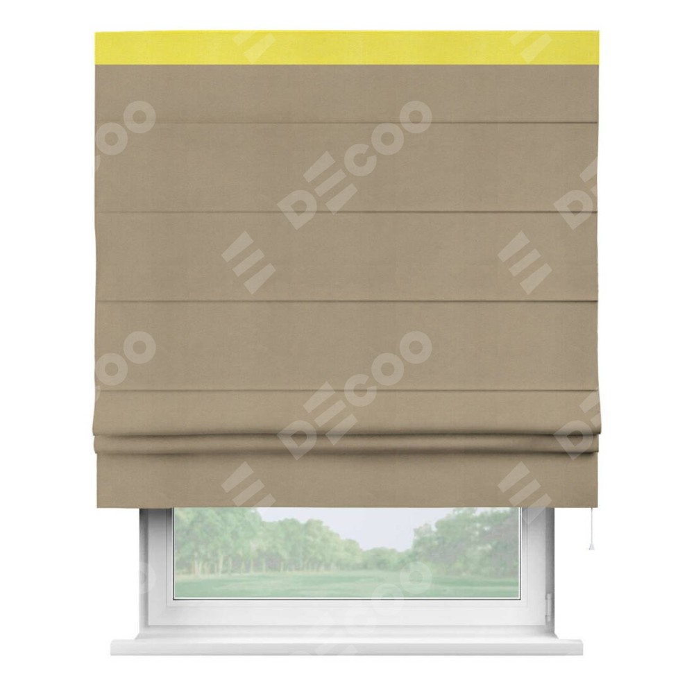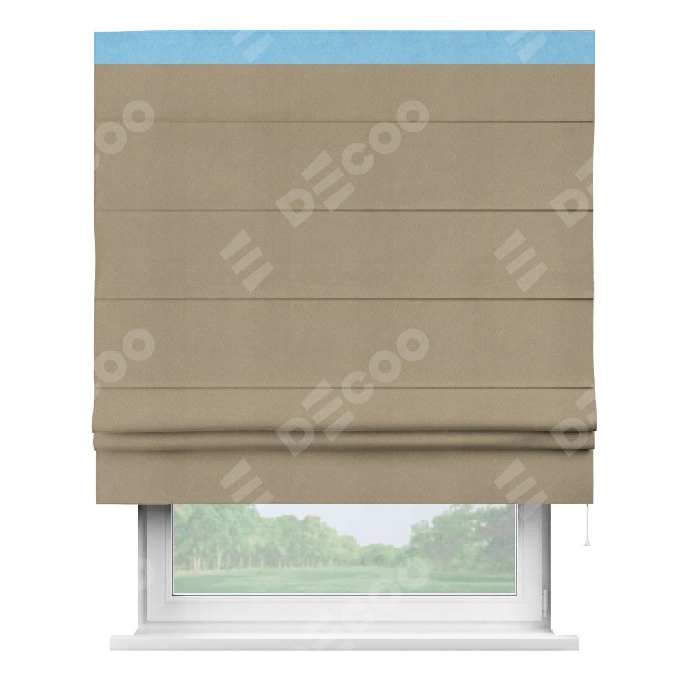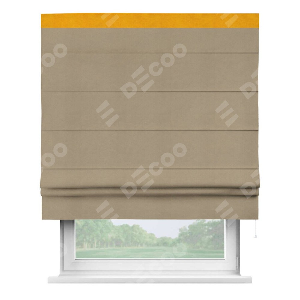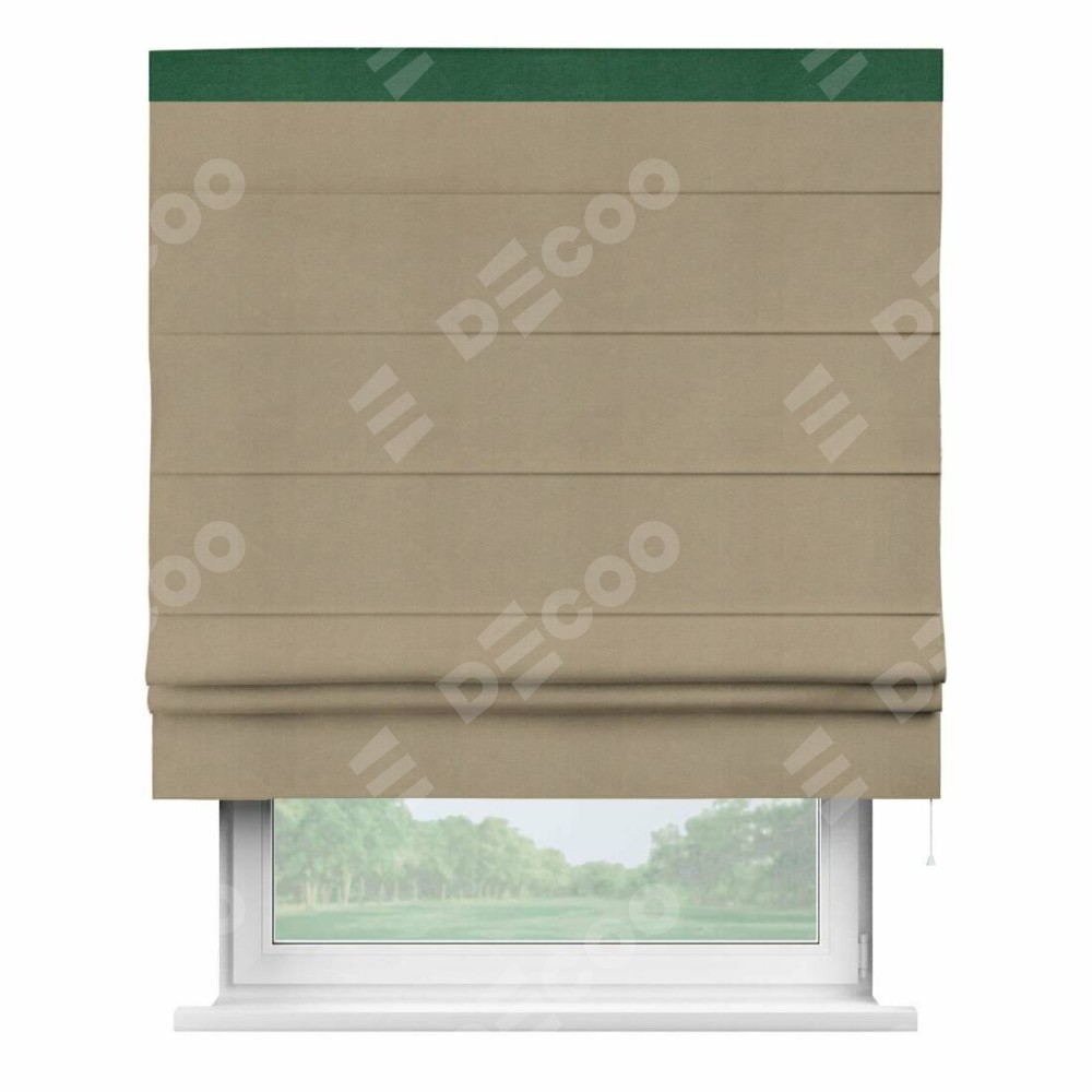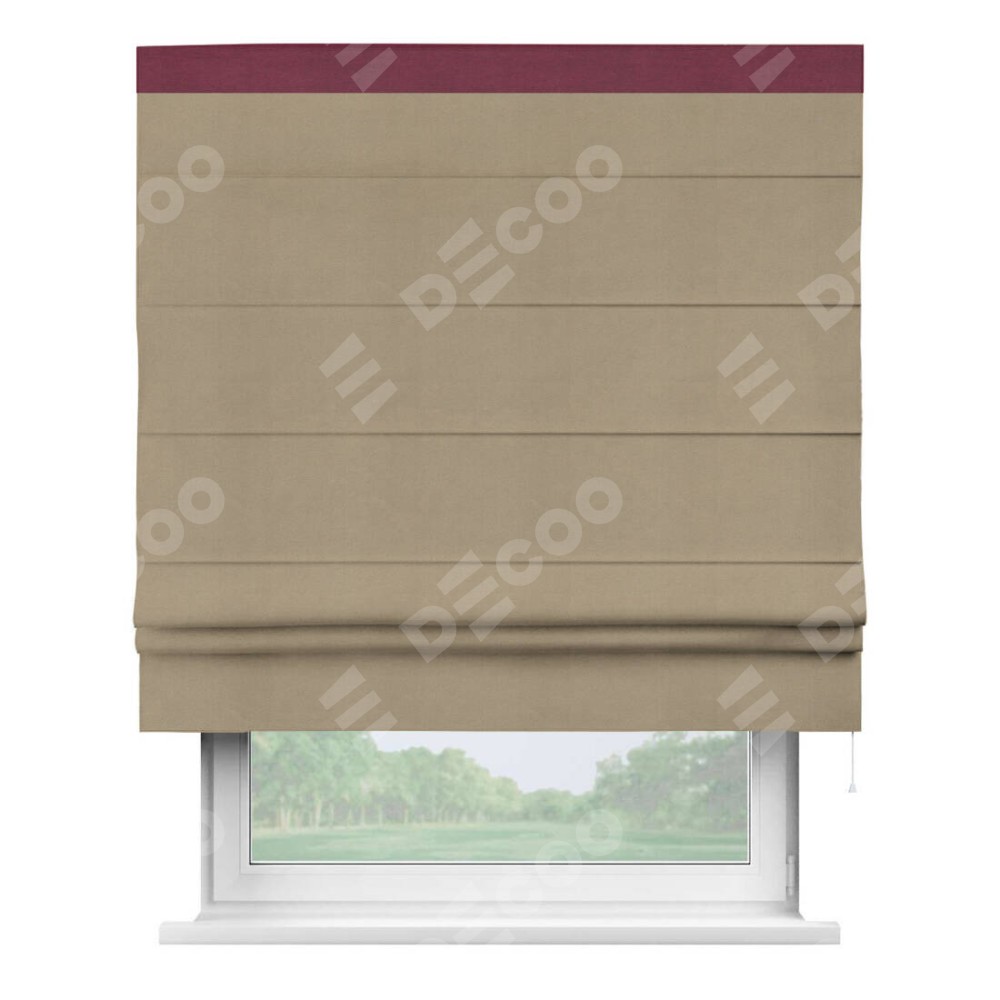 Римская штора производителя «Cortin», используется для проёма, пошита из ткани вельвет кофейный, артикул ткани 30980. Отделка шторы кантом «Кинг», ткань для канта используется из вельвета разной расцветки на выбор. Имеет универсальный механизм и подходит для монтажа: на потолок, на стену и в нишу.