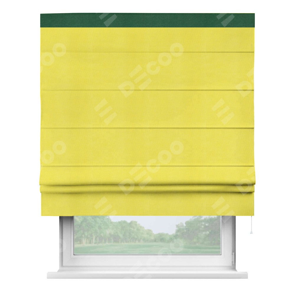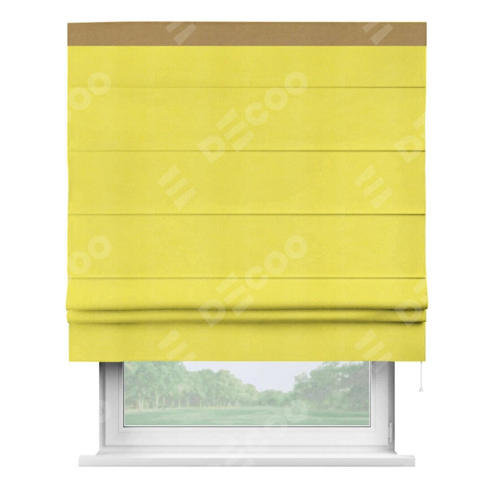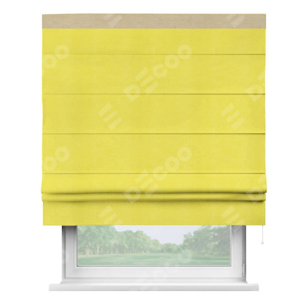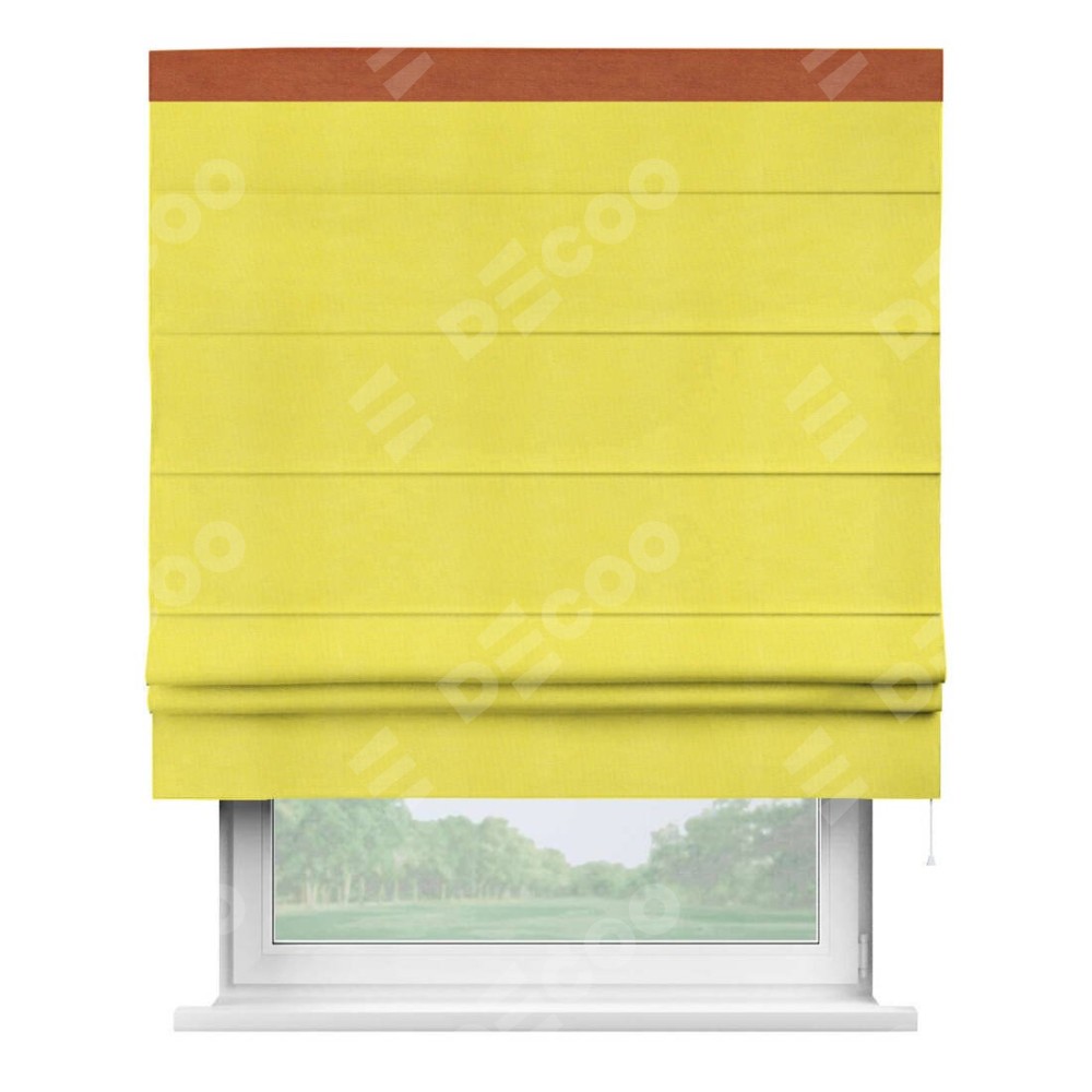 Римская штора производителя «Cortin», используется для проёма, пошита из ткани вельвет cветло-желтый, артикул ткани 30997. Отделка шторы кантом «Кинг», ткань для канта используется из вельвета разной расцветки на выбор. Имеет универсальный механизм и подходит для монтажа: на потолок, на стену и в нишу.
