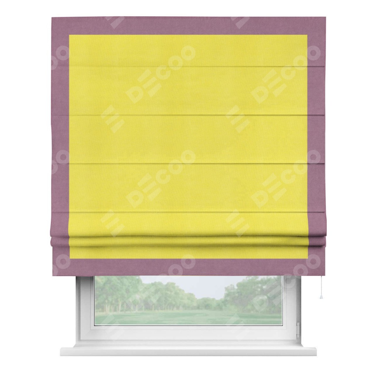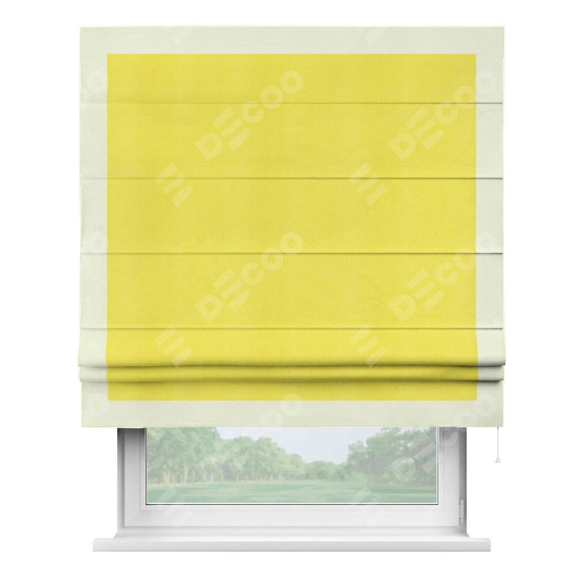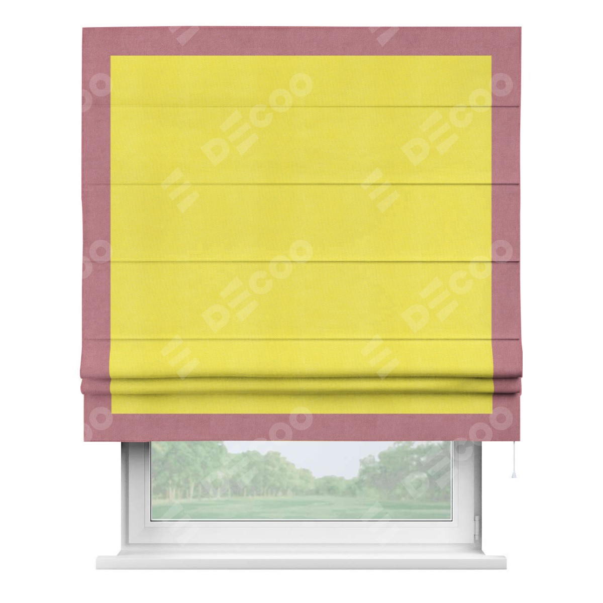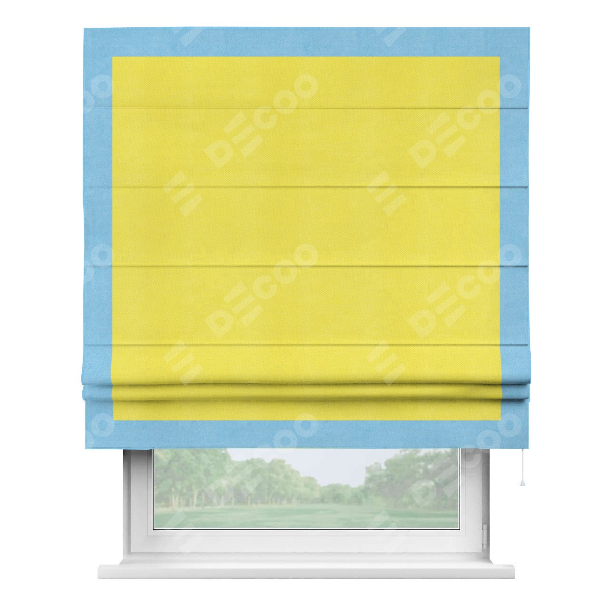 Римская штора производителя «Cortin», используется для проёма, пошита из ткани вельвет cветло-желтый, артикул ткани 30997. Отделка шторы кантом «Чесс», ткань для канта используется из вельвета разной расцветки на выбор. Имеет универсальный механизм и подходит для монтажа: на потолок, на стену и в нишу.