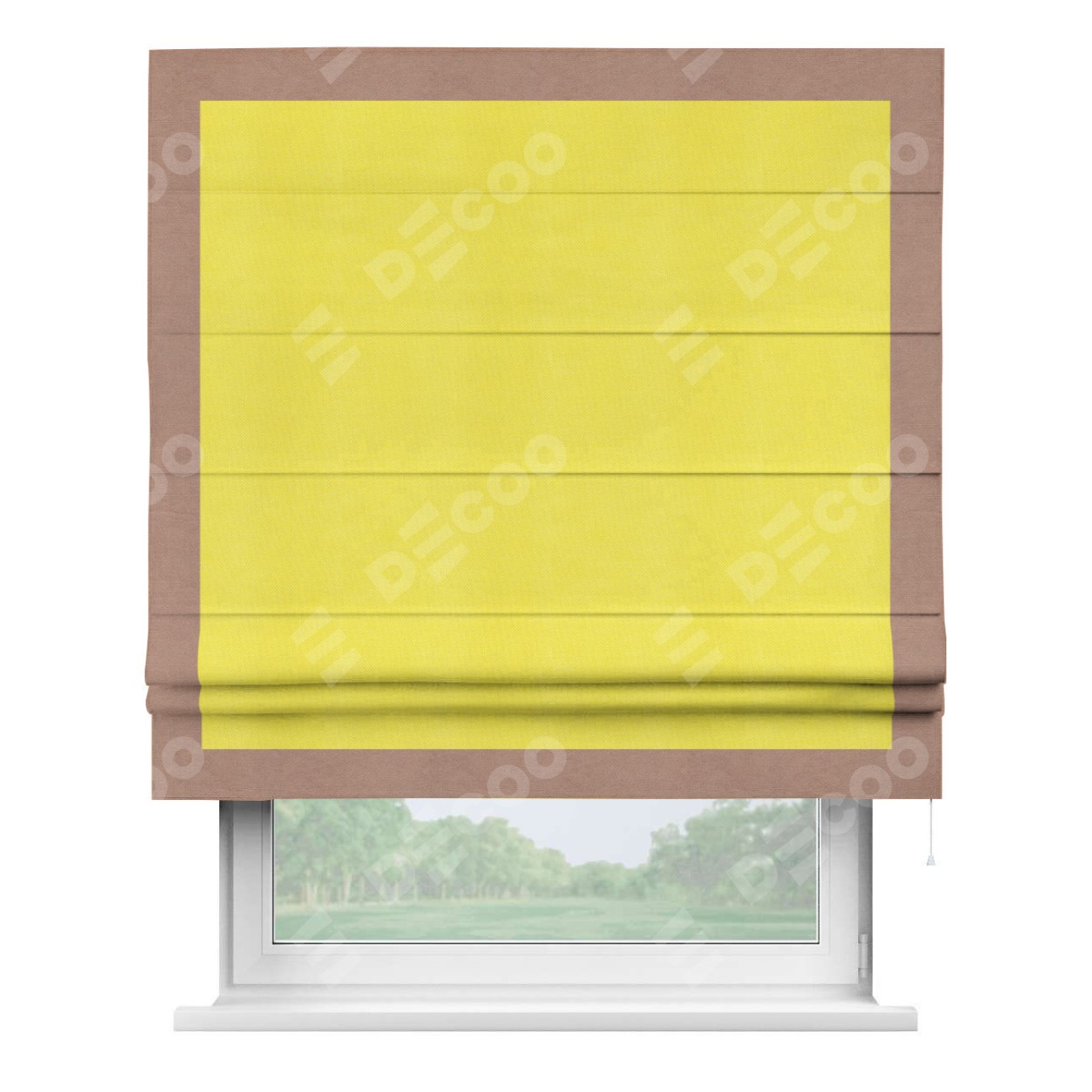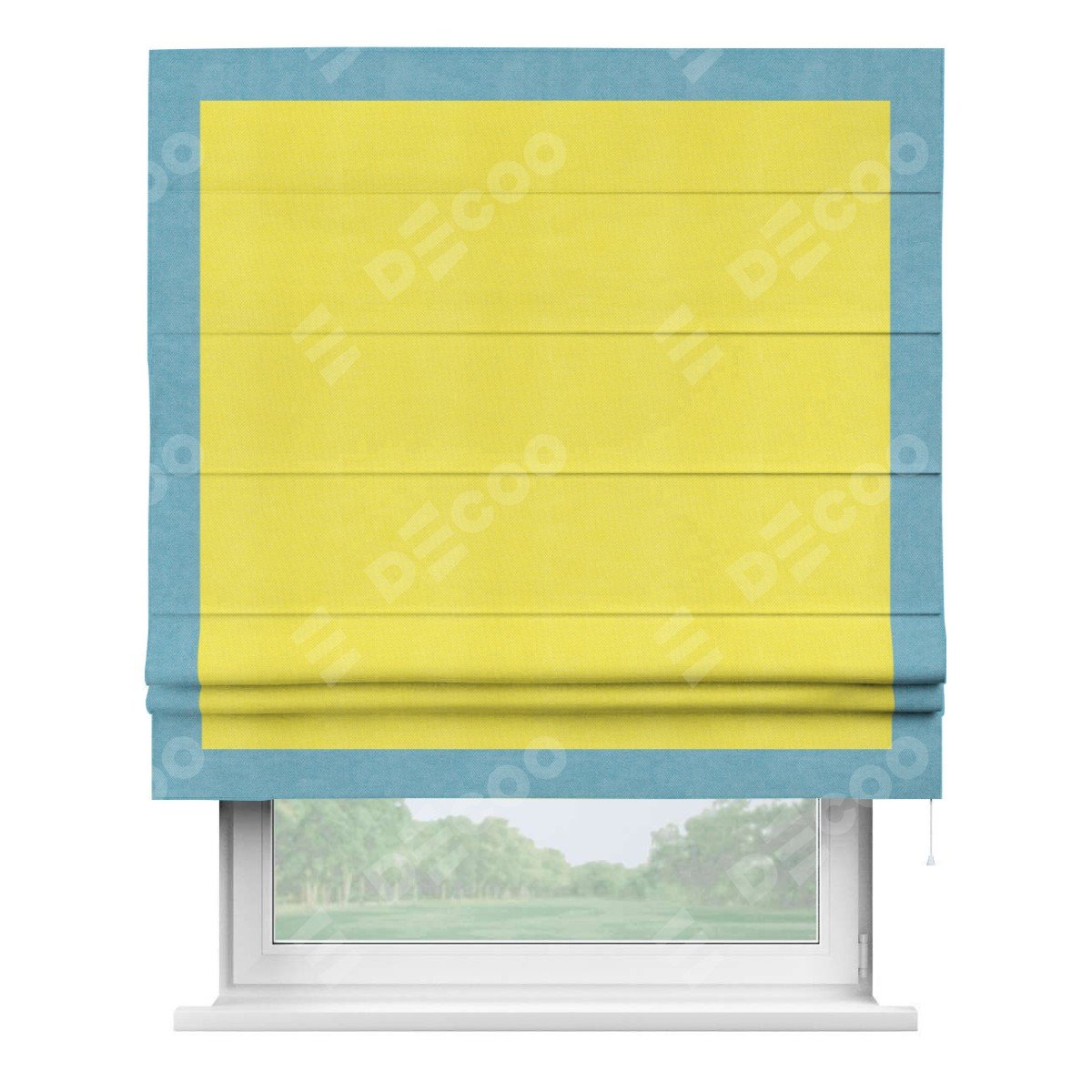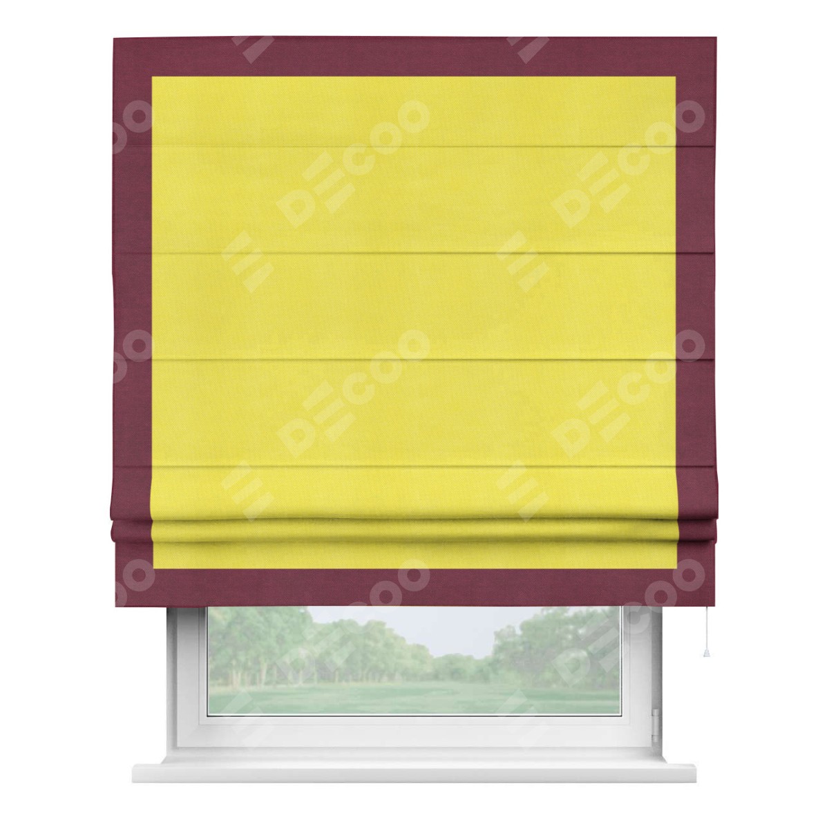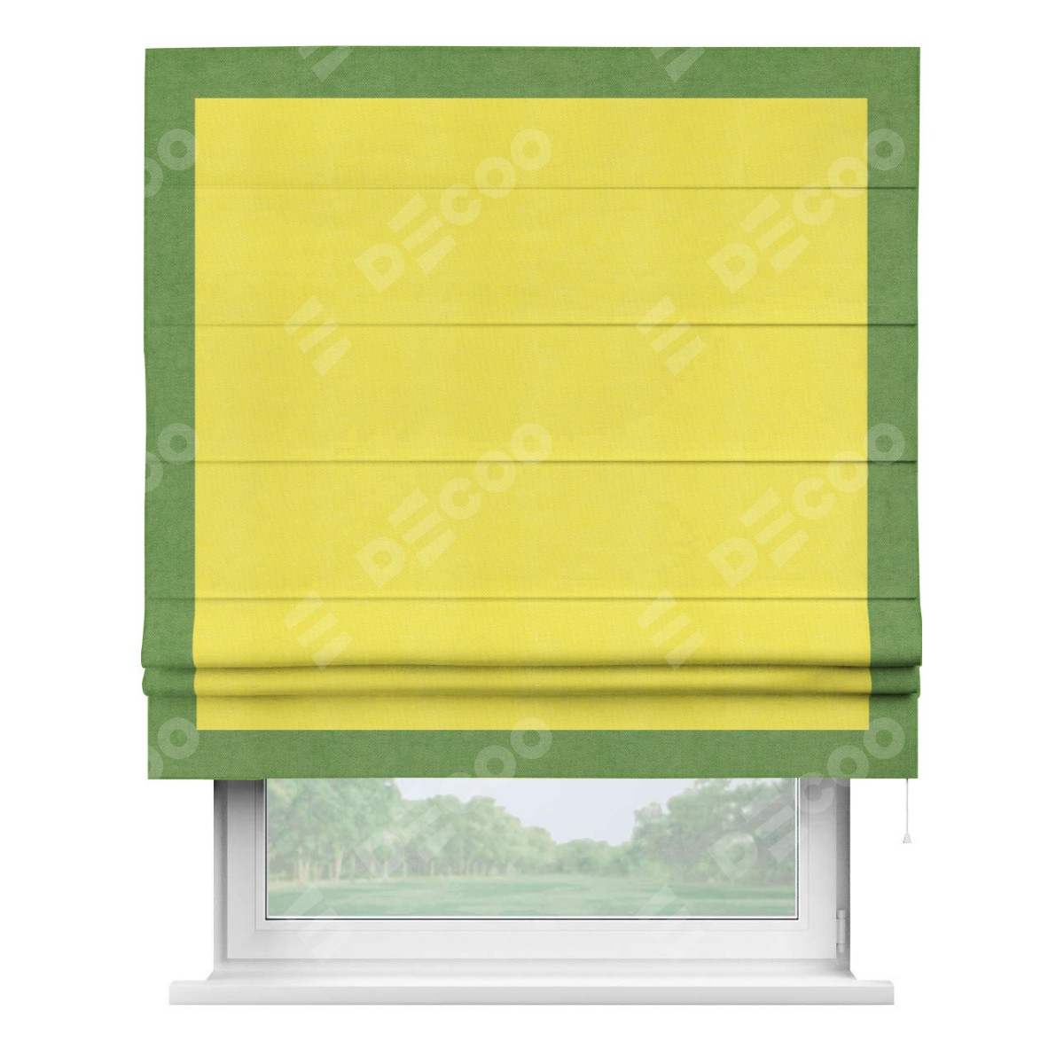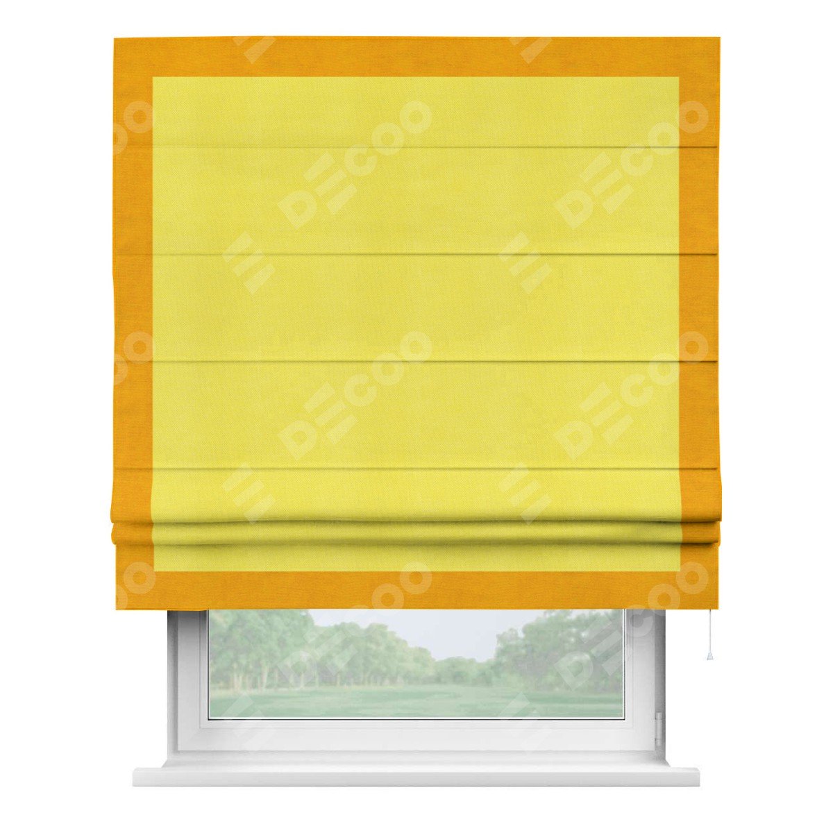 Римская штора производителя «Cortin», используется для проёма, пошита из ткани вельвет cветло-желтый, артикул ткани 30997. Отделка шторы кантом «Чесс», ткань для канта используется из вельвета разной расцветки на выбор. Имеет универсальный механизм и подходит для монтажа: на потолок, на стену и в нишу.