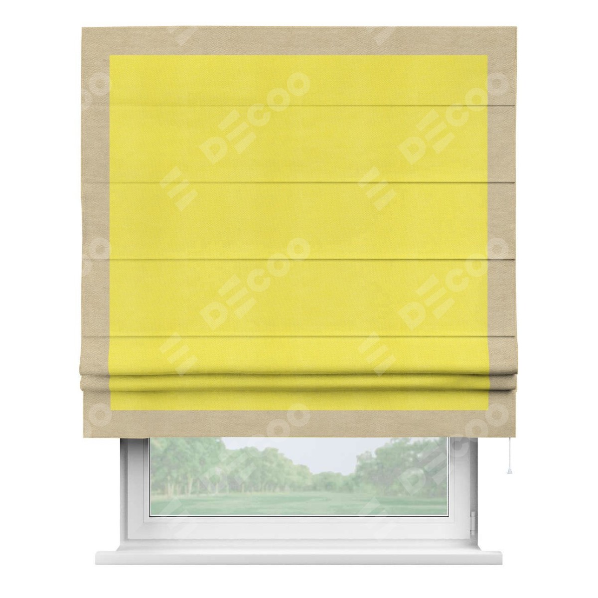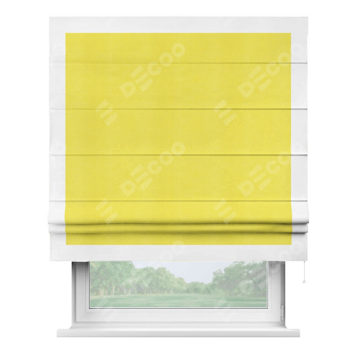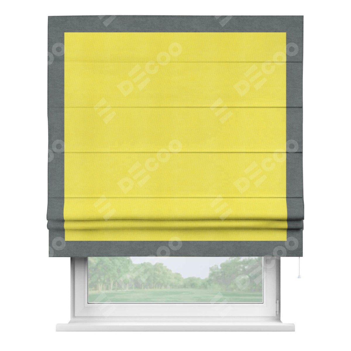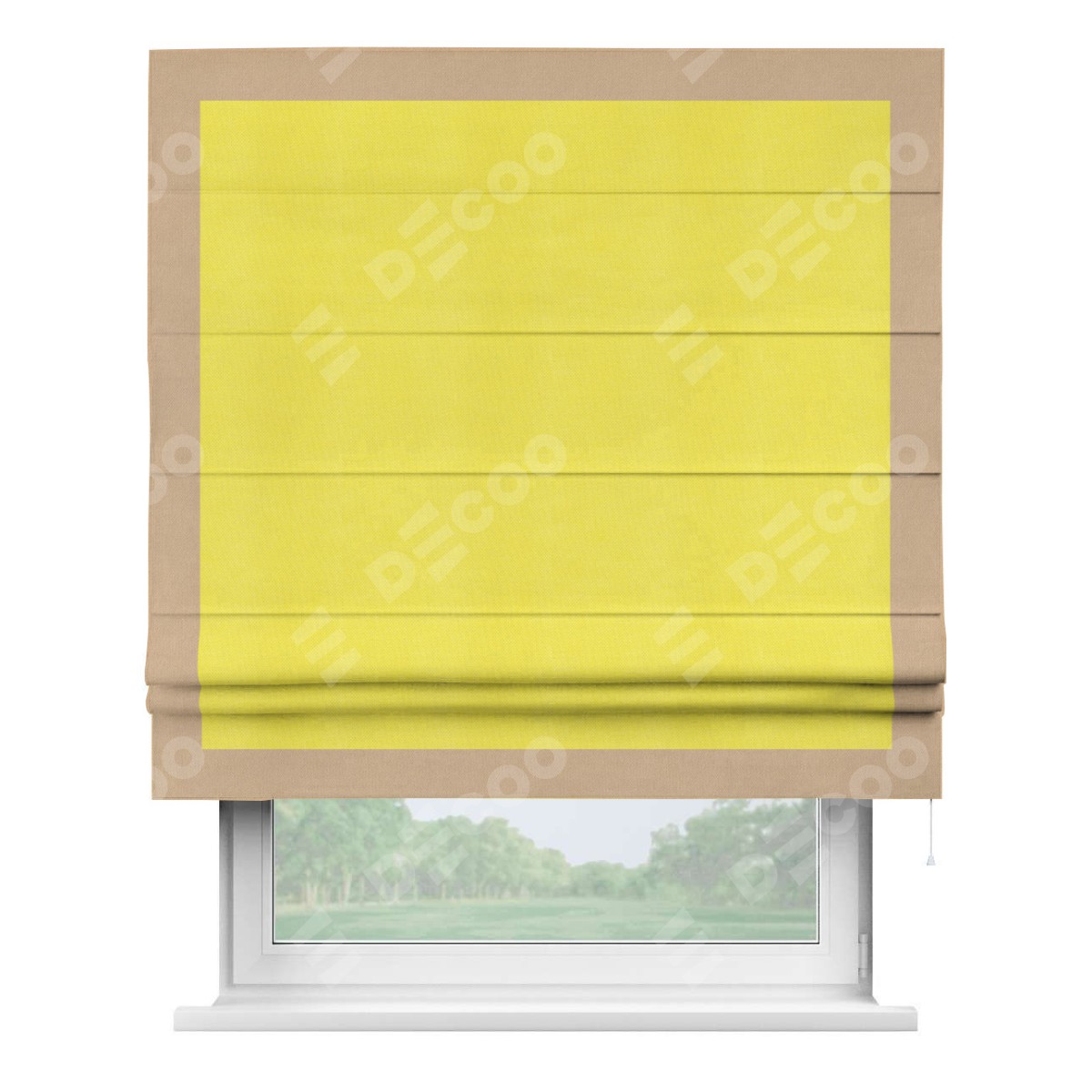 Римская штора производителя «Cortin», используется для проёма, пошита из ткани вельвет cветло-желтый, артикул ткани 30997. Отделка шторы кантом «Чесс», ткань для канта используется из вельвета разной расцветки на выбор. Имеет универсальный механизм и подходит для монтажа: на потолок, на стену и в нишу.