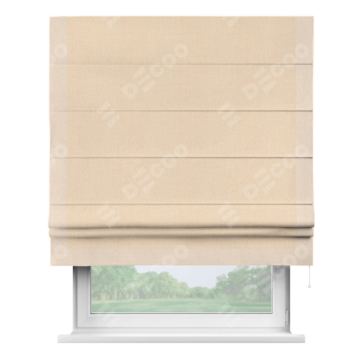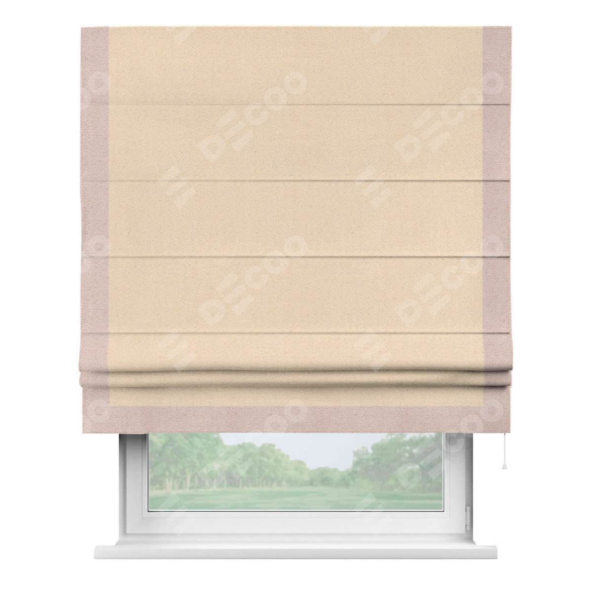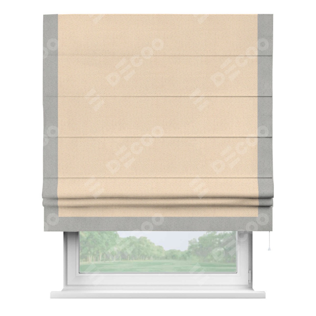 Римская штора производителя «Cortin», используется для проёма, пошита из ткани блэкаут с блеском бежевый, артикул 34627. Отделка шторы кантом «Виктория», ткань для канта используется из блэкаута с блеском разной расцветки на выбор. Изнаночная сторона материала черного цвета, что обеспечивает необходимую светонепроницаемость. Имеет универсальный механизм и подходит для монтажа: на потолок, на стену и в нишу.