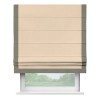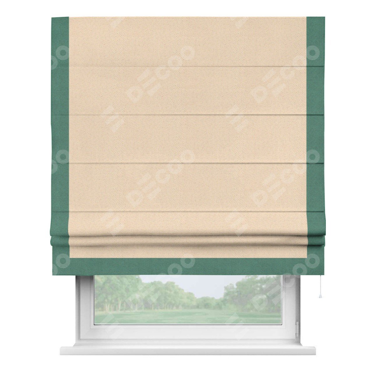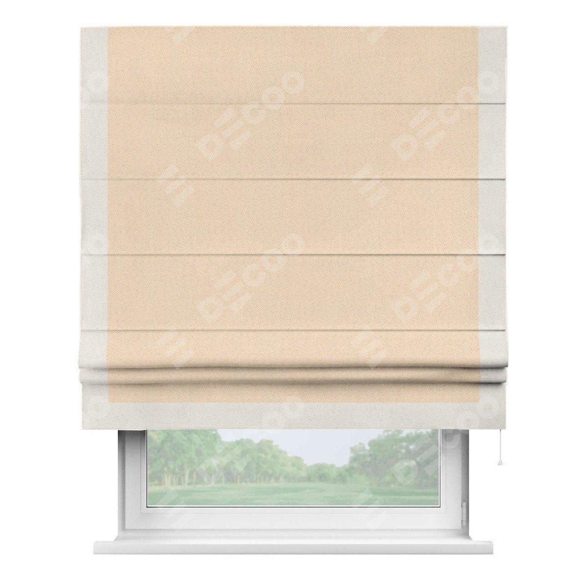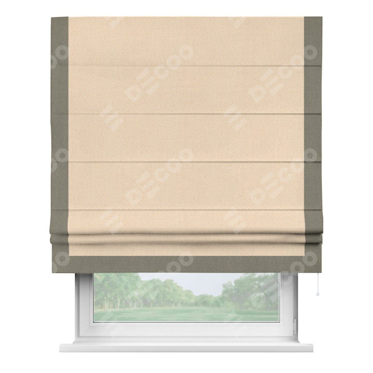 Римская штора производителя «Cortin», используется для проёма, пошита из ткани блэкаут с блеском бежевый, артикул 34627. Отделка шторы кантом «Виктория», ткань для канта используется из блэкаута с блеском разной расцветки на выбор. Изнаночная сторона материала черного цвета, что обеспечивает необходимую светонепроницаемость. Имеет универсальный механизм и подходит для монтажа: на потолок, на стену и в нишу.