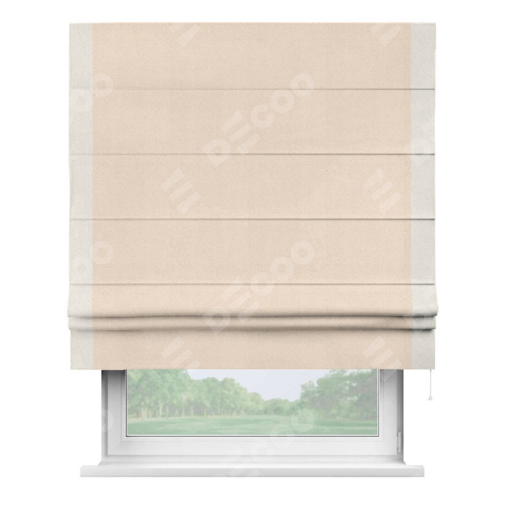 Римская штора производителя «Cortin», используется для проёма, пошита из ткани блэкаут с блеском розовая пудра, артикул 34632. Отделка шторы кантом «Стрим Дуо», ткань для канта используется из блэкаута с блеском разной расцветки на выбор. Изнаночная сторона материала черного цвета, что обеспечивает необходимую светонепроницаемость. Имеет универсальный механизм и подходит для монтажа: на потолок, на стену и в нишу.