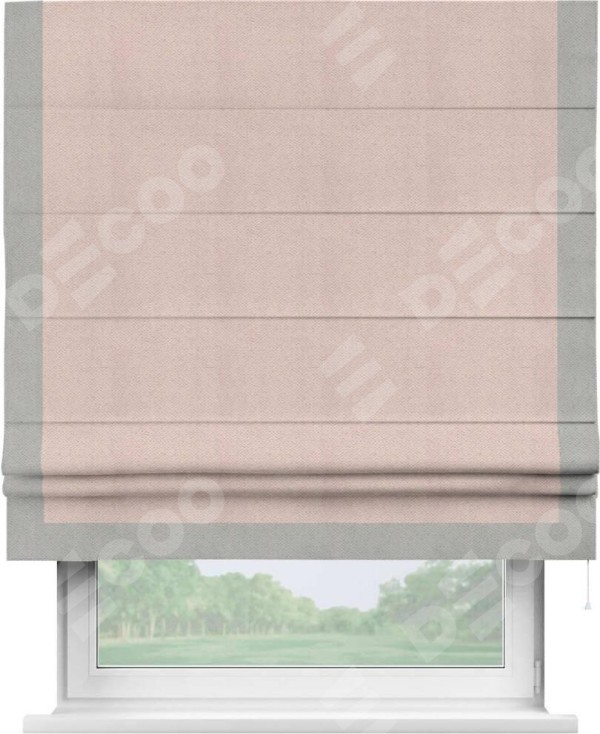 Римская штора производителя «Cortin», используется для проёма, пошита из ткани блэкаут с блеском сиреневый, артикул 34649. Отделка шторы кантом «Виктория», ткань для канта используется из блэкаута с блеском разной расцветки на выбор. Изнаночная сторона материала черного цвета, что обеспечивает необходимую светонепроницаемость. Имеет универсальный механизм и подходит для монтажа: на потолок, на стену и в нишу.