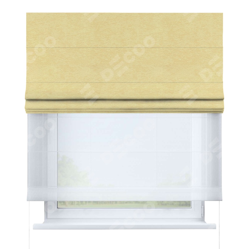 Римская штора день-ночь производителя «Cortin», используется для проёма, пошита из двух полотен, с лицевой стороны софт однотонный золотой артикул 42934, вторая ткань тюль (по стандарту комплектуется тюль белого цвета артикул V-01). Имеет универсальный механизм и подходит для монтажа: на потолок, на стену и в нишу.