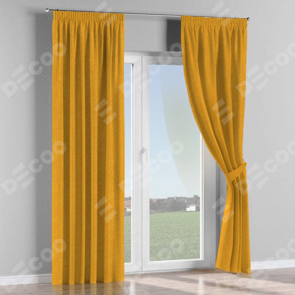 Комплект прямых штор, от производителя «Cortin», пошиты из ткани твид блэкаут медово-желтый, артикул ткани 21641. С изнаночной стороны в верхней части штор пристрачивается шторная лента с декоративными складками «Карандаш». Для создания элегантных складок прямые шторы шьются по стандарту с коэффициентом 1:2 (на 100 см. ширины проёма 200 см. ширины ткани).