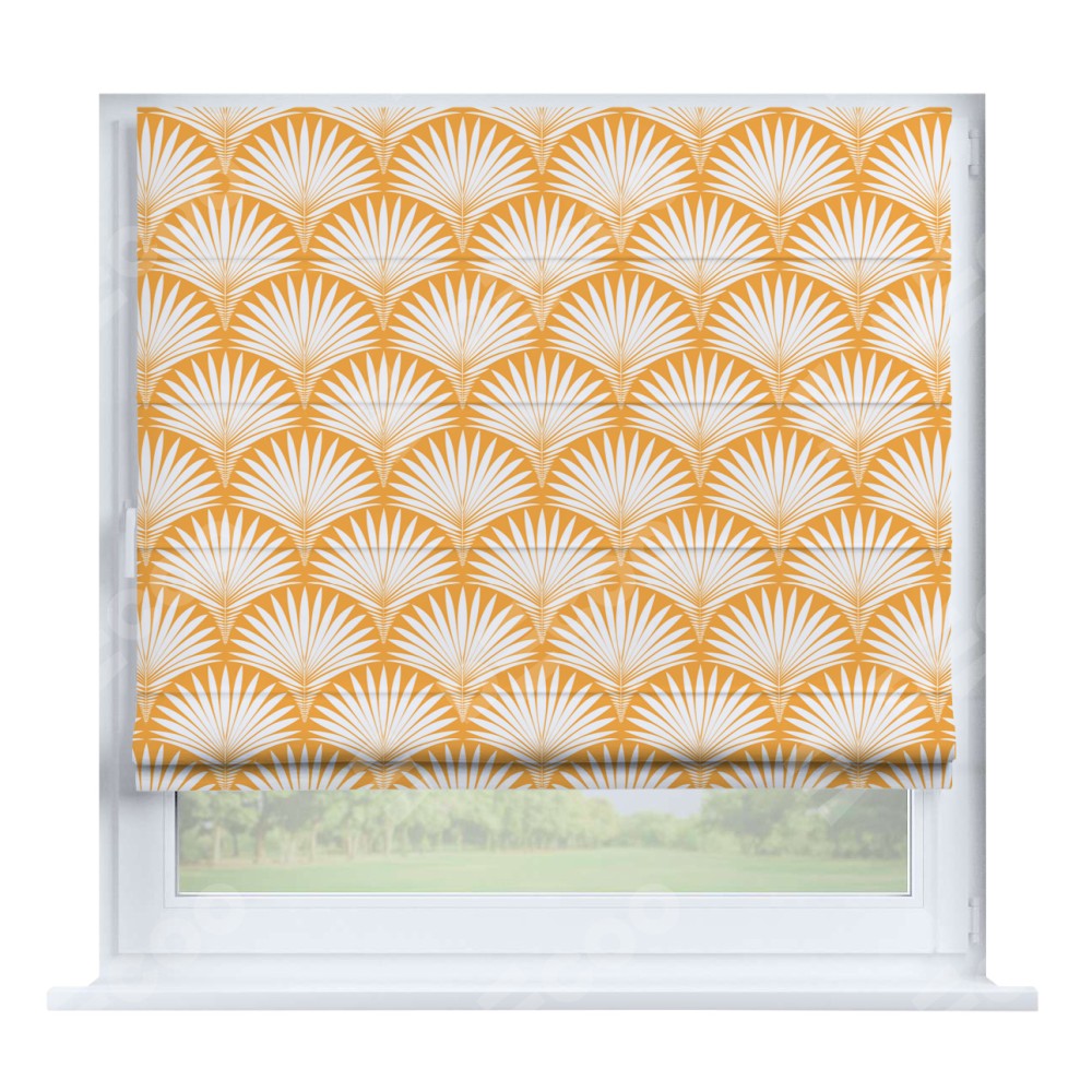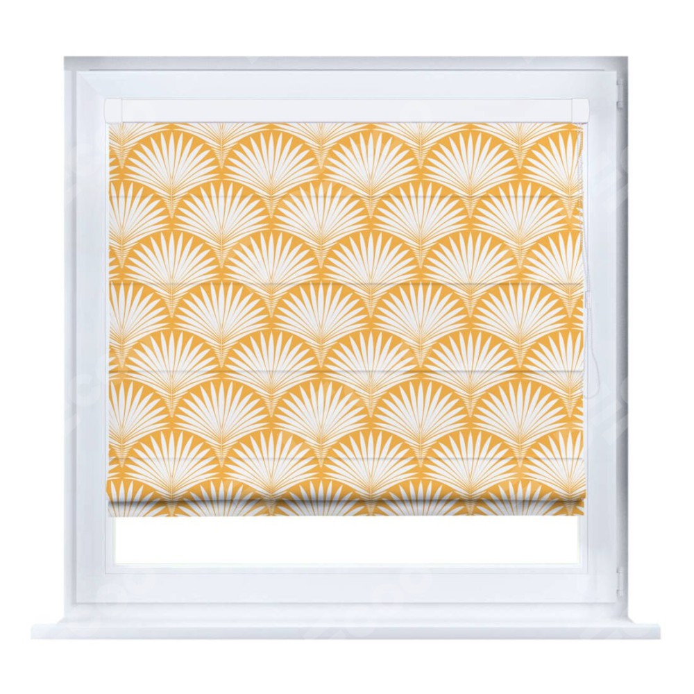 Римская штора производителя «Cortin», устанавливается на створку окна, пошита из ткани блэкаут с нанесением сублимационной печати «Арт-деко листья желтый». Штора шьётся по индивидуальным размерам, для данного типа римской шторы возможная ширина от 35 до 150 см., высота до 250 см.