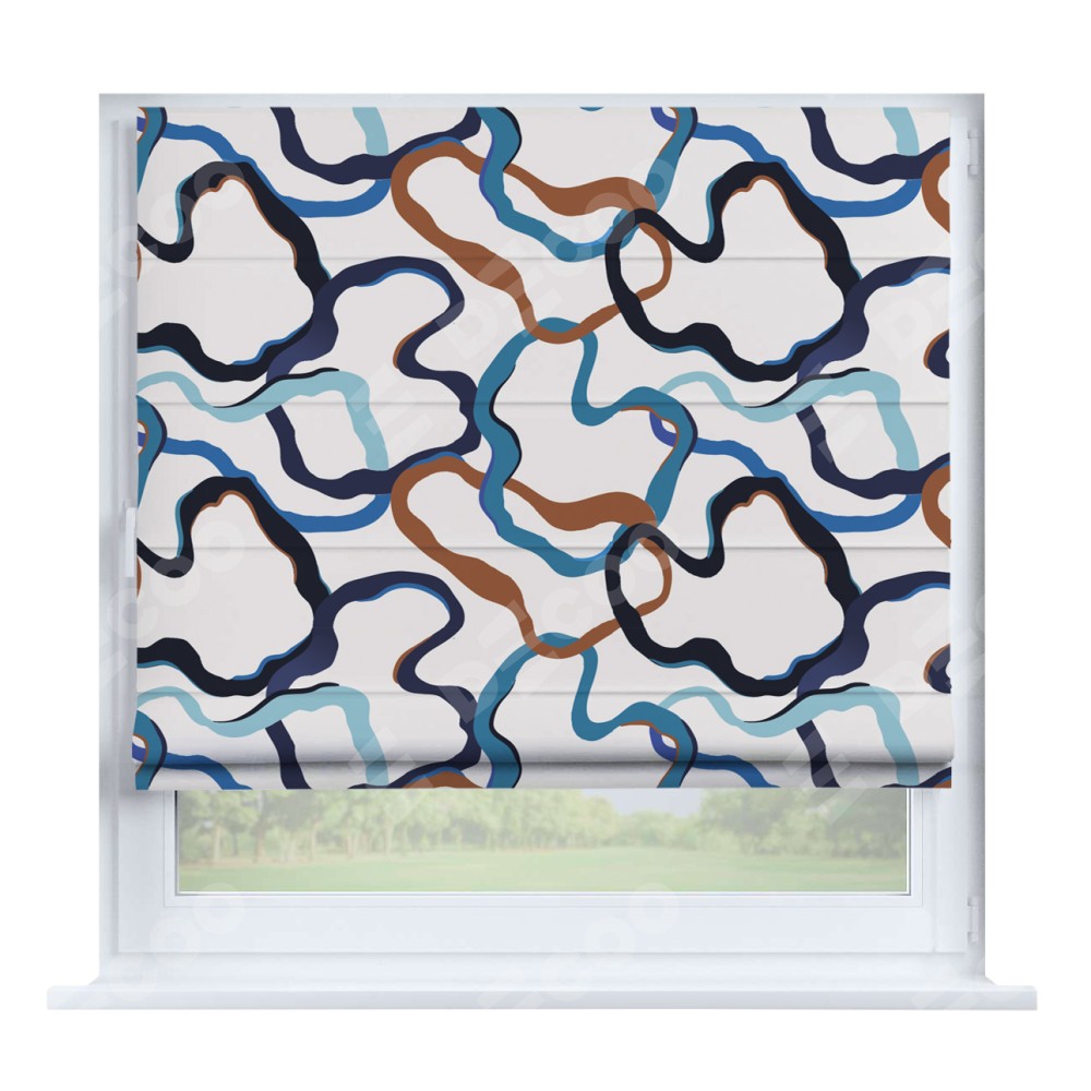 Римская штора производителя «Cortin», устанавливается на створку окна, пошита из ткани блэкаут с нанесением сублимационной печати «Волнистые ленты». Штора шьётся по индивидуальным размерам, для данного типа римской шторы возможная ширина от 35 до 150 см., высота до 250 см.
