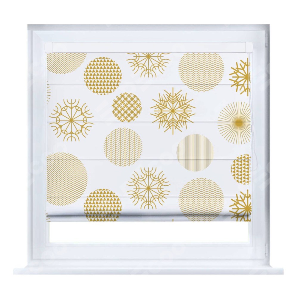 Римская штора производителя «Cortin», устанавливается на створку окна, пошита из ткани блэкаут с нанесением сублимационной печати «Золотые шары». Штора шьётся по индивидуальным размерам, для данного типа римской шторы возможная ширина от 35 до 150 см., высота до 250 см.