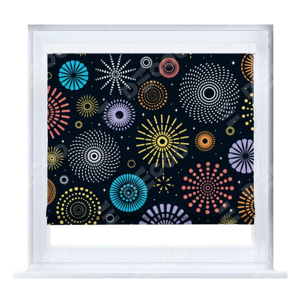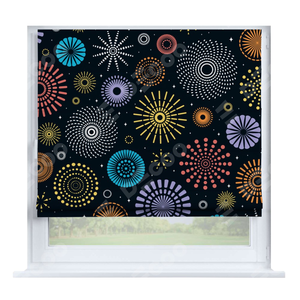 Римская штора производителя «Cortin», устанавливается на створку окна, пошита из ткани блэкаут с нанесением сублимационной печати «Праздничный фейерверк». Штора шьётся по индивидуальным размерам, для данного типа римской шторы возможная ширина от 35 до 150 см., высота до 250 см.