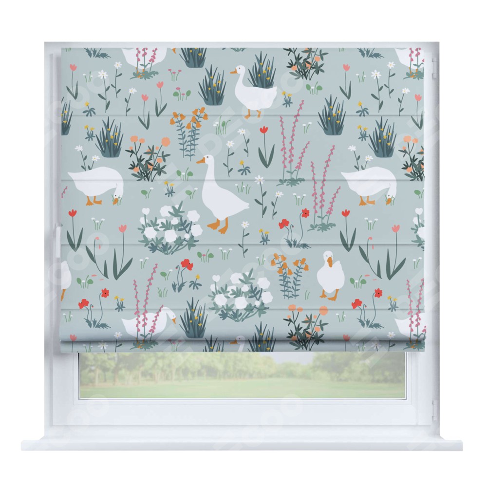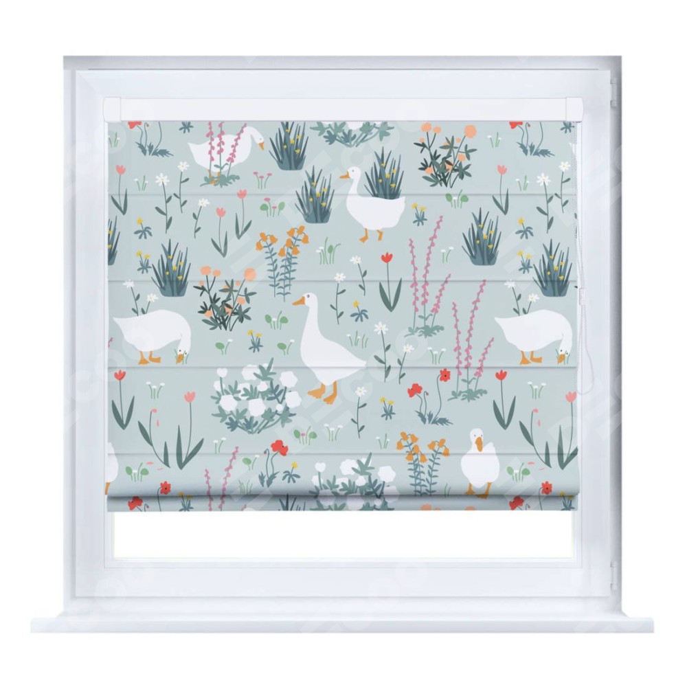 Римская штора производителя «Cortin», устанавливается на створку окна, пошита из ткани блэкаут с нанесением сублимационной печати «Гуси на лугу». Штора шьётся по индивидуальным размерам, для данного типа римской шторы возможная ширина от 35 до 150 см., высота до 250 см.