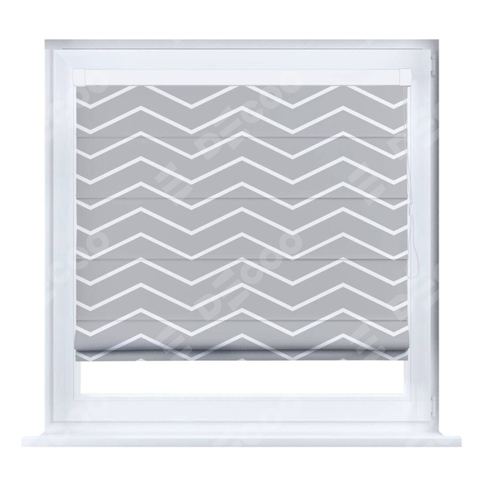 Римская штора производителя «Cortin», устанавливается на створку окна, пошита из ткани блэкаут с нанесением сублимационной печати «Серый зигзаг». Штора шьётся по индивидуальным размерам, для данного типа римской шторы возможная ширина от 35 до 150 см., высота до 250 см.
