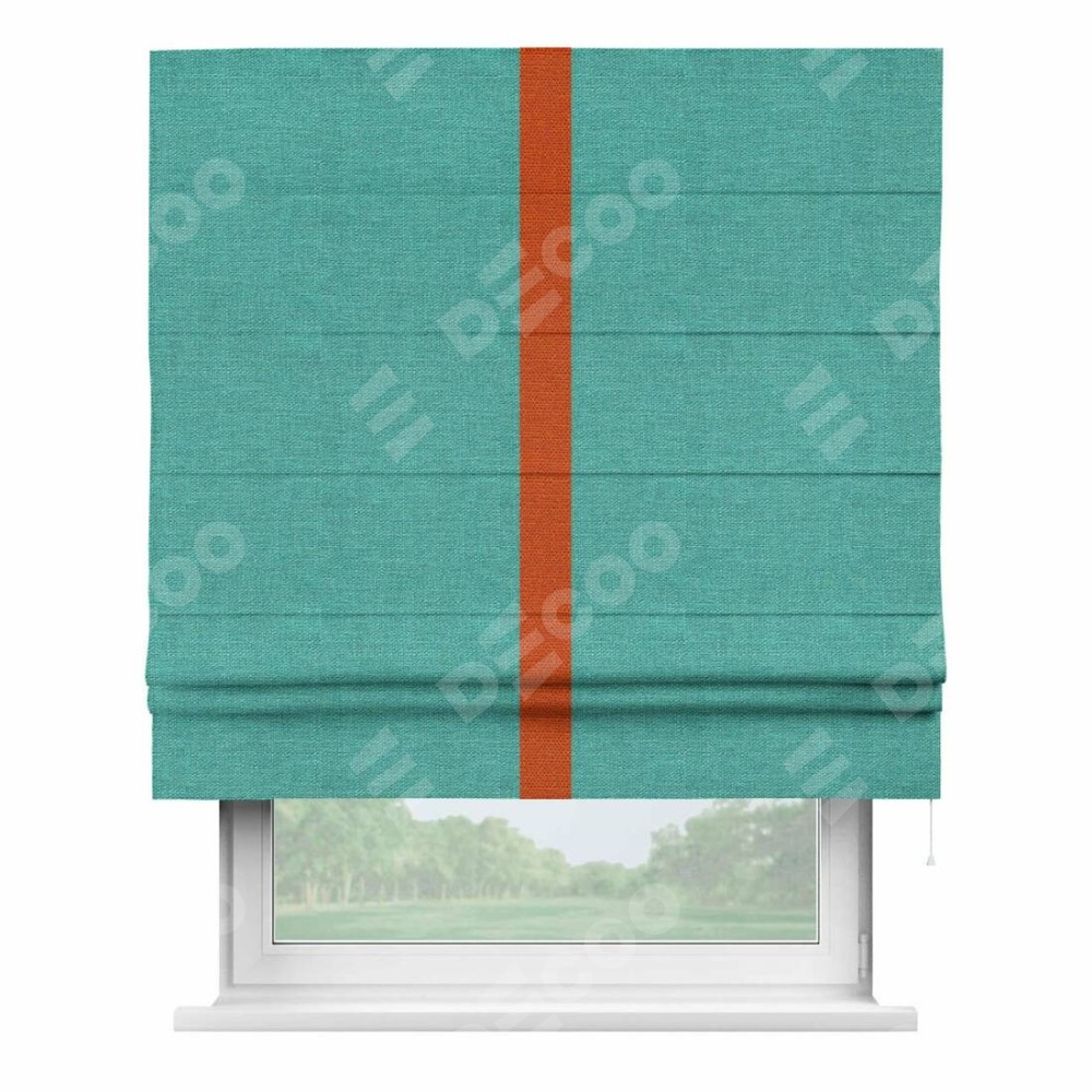 Римская штора производителя «Cortin», используется для проёма, пошита из ткани лён изумрудный, артикул 85908. Отделка шторы кантом «Хайвэй», ткань для канта используется из льна разной расцветки на выбор. Имеет универсальный механизм и подходит для монтажа: на потолок, на стену и в нишу.