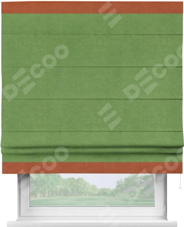Римская штора производителя «Cortin», используется для проёма, пошита из ткани вельвет салатовый, артикул ткани 87072. Отделка шторы кантом «Горизонт», ткань для канта используется из вельвета разной расцветки на выбор. Имеет универсальный механизм и подходит для монтажа: на потолок, на стену и в нишу.