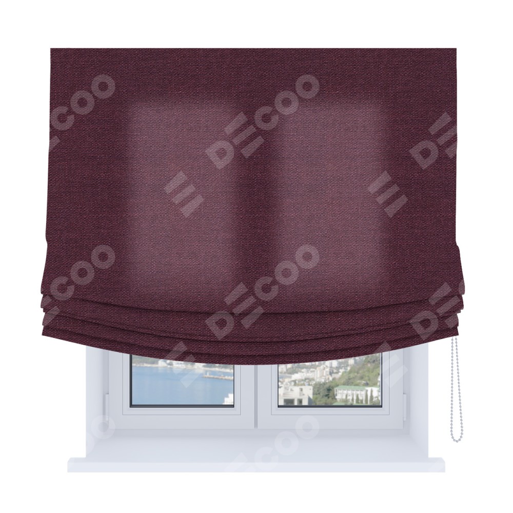 Римская штора Soft производителя «Cortin», используется для проёма, пошита из ткани лён фиолетовый, артикул ткани 85907. Имеет универсальный механизм и подходит для монтажа: на потолок, на стену и в нишу. В отличие от стандартных римских штор, римская штора Soft не имеет горизонтальных вставок и нижнего отвеса. Это позволяет ткани произвольно драпироваться в свободные мягкие складки.